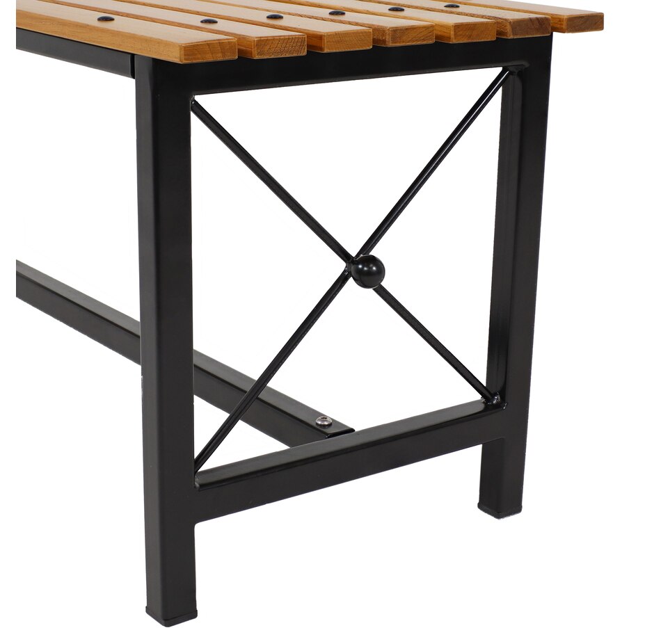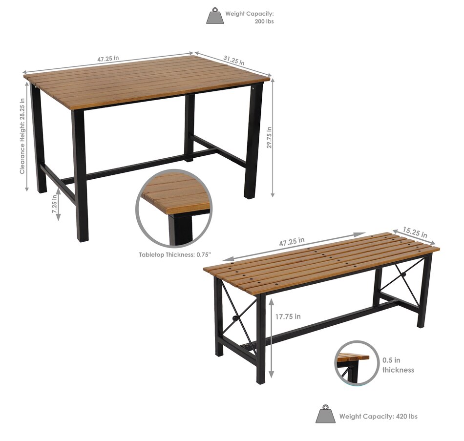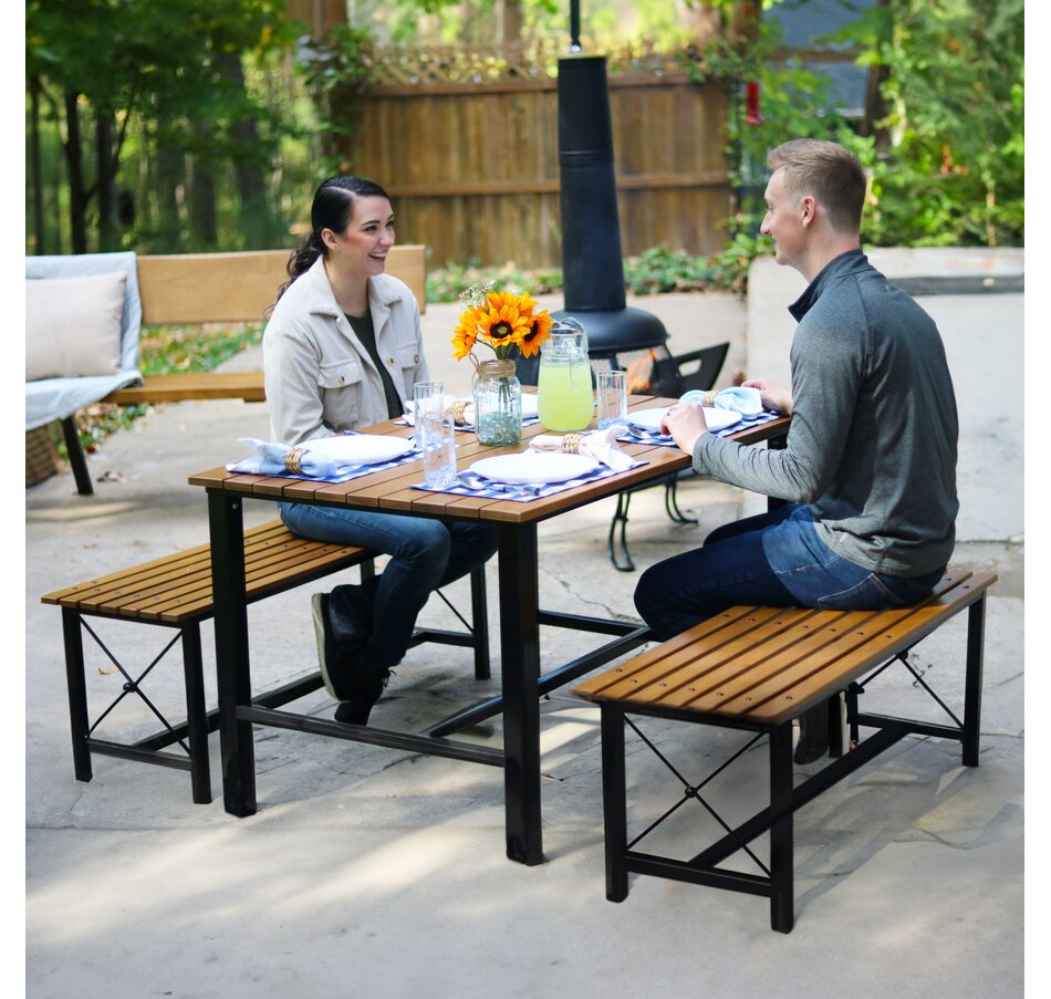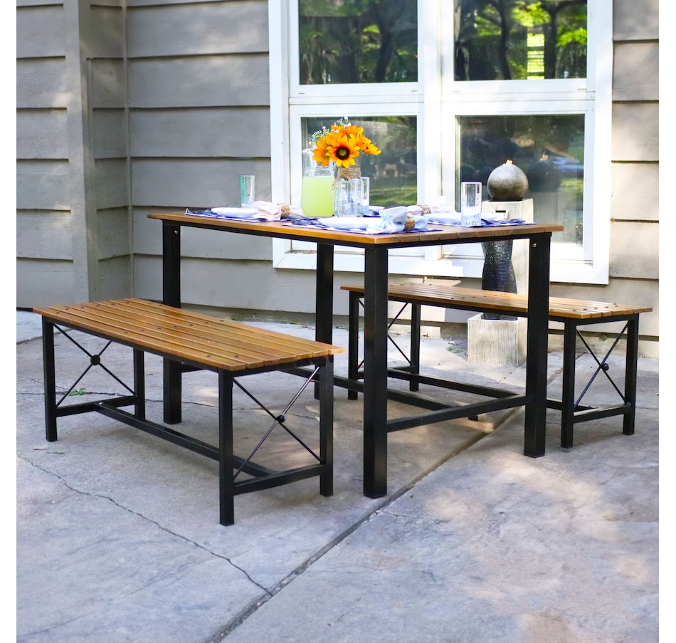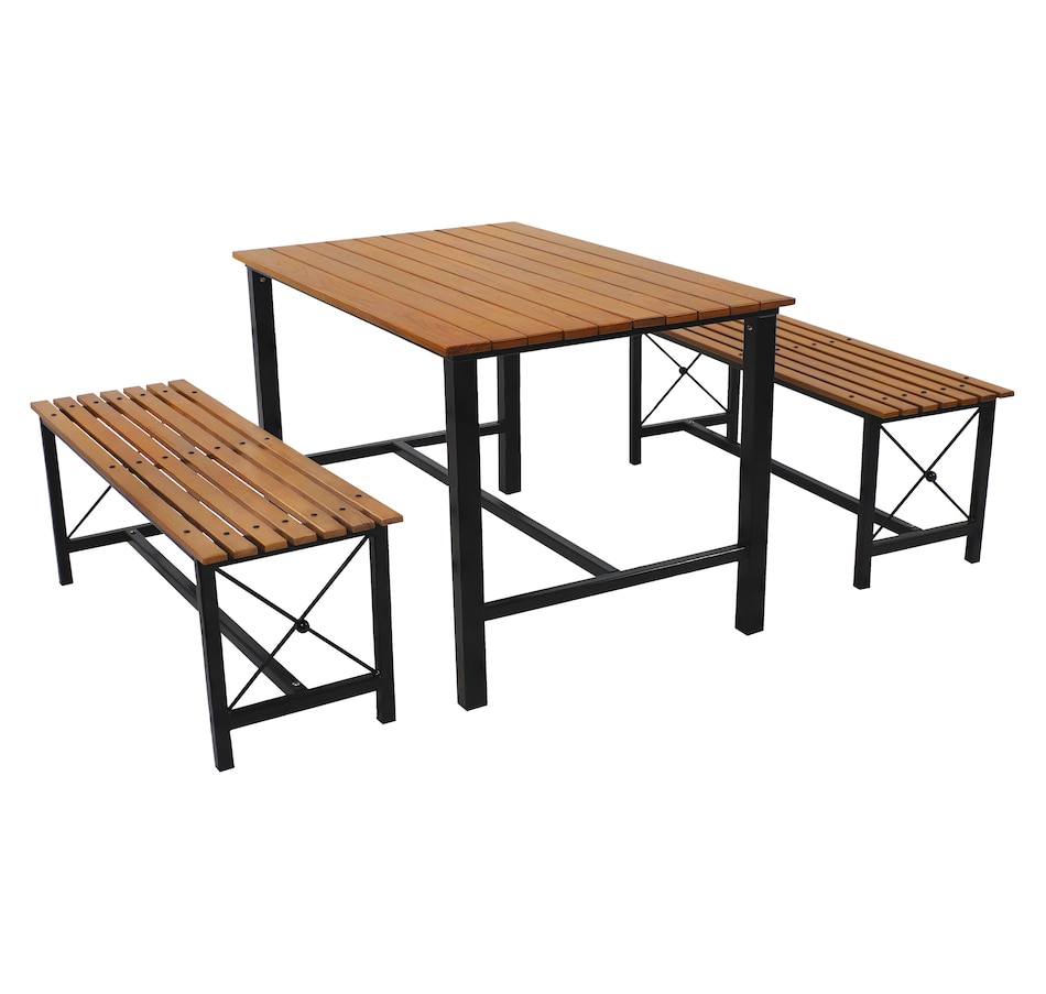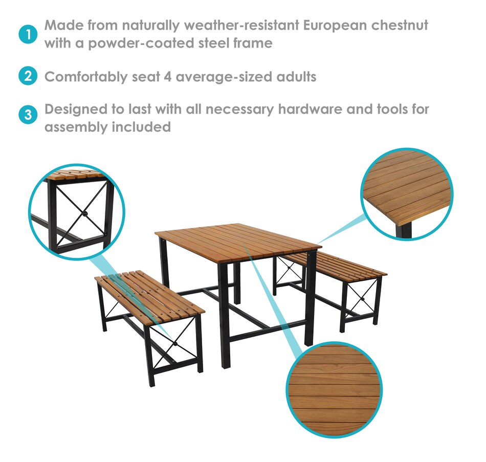 Enjoy a delicious meal in style, either indoors or outdoors, with this modern bench dining table set. Featuring a sophisticated slatted tabletop and seats, this 3-piece set includes a rectangular table and two dining benches. Each bench provides enough space for two average-sized adults so there is plenty of room for everyone. Each bench has a sturdy 420-pound weight capacity. Made from naturally weather-resistant European chestnut and featuring a durable, powder-coated steel frame in classic black, this dining set is built to last season after season. Plus, this outdoor picnic table with benches can be put together easily. All of the tools and hardware needed for assembly are included. Place this unique set in the kitchen, on the patio, in the dining room, or in the backyard. Be sure to store the patio set indoors during winter to extend the product life. Its contemporary design will blend seamlessly with any industrial, modern, or rustic decor scheme.
