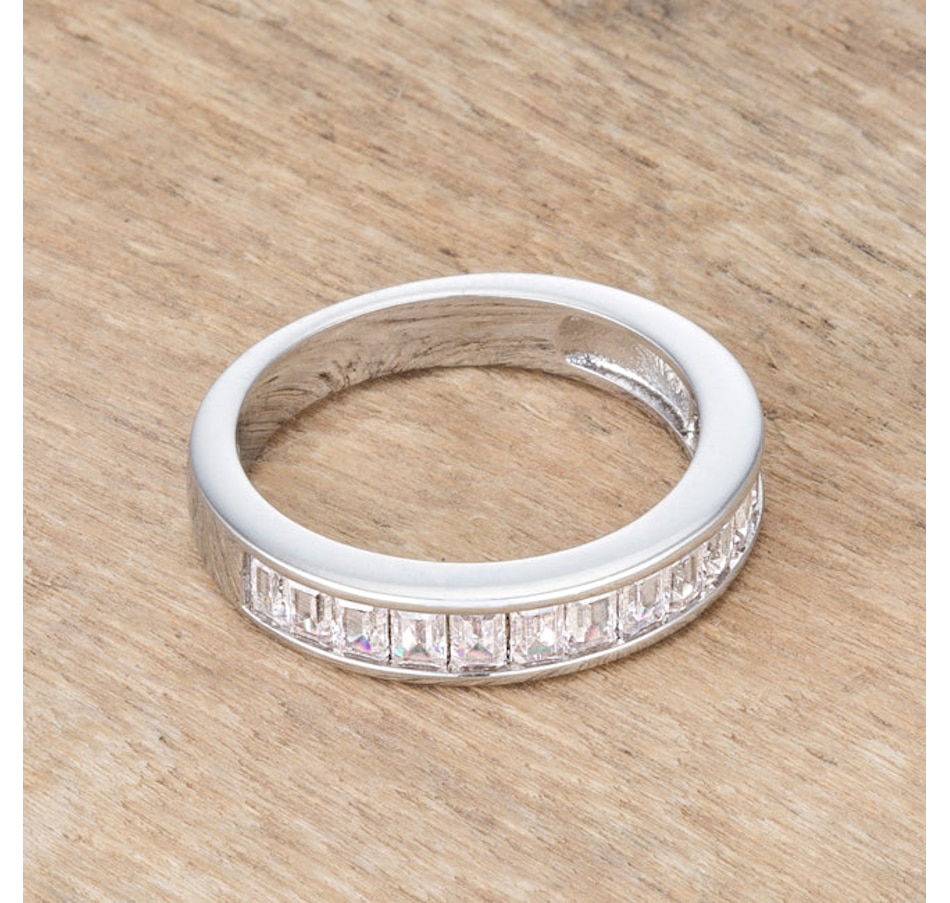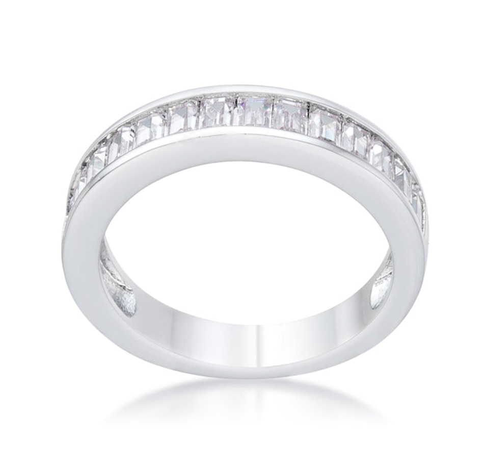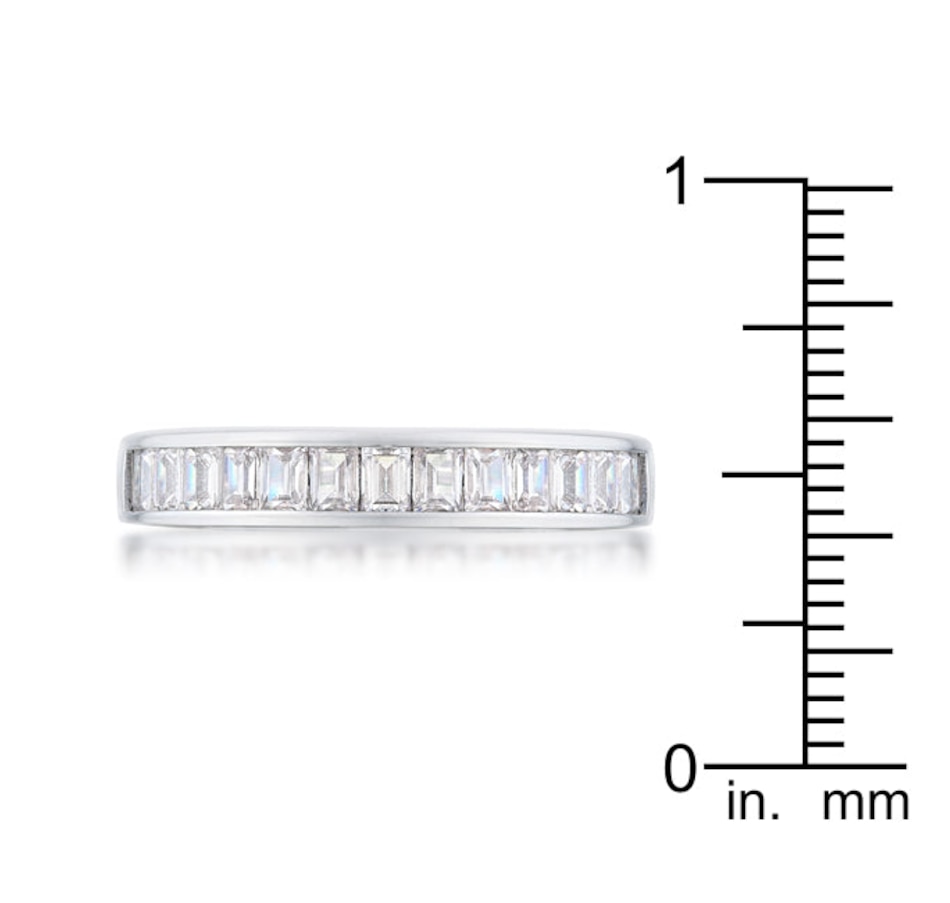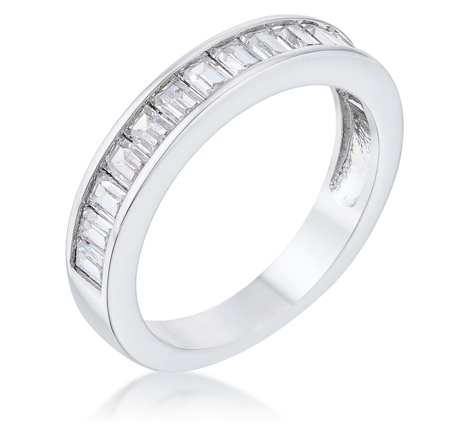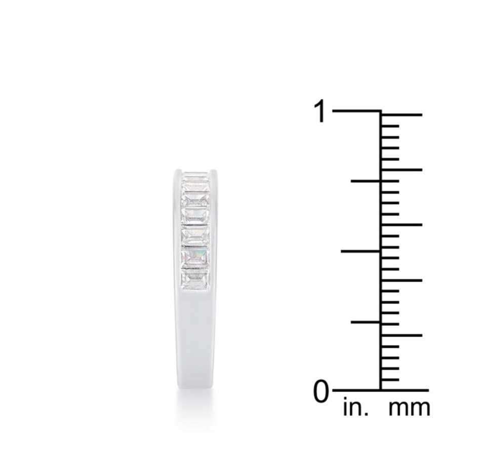 For old world elegance mixed perfectly with sleek modern design there is no better choice than this band. The brilliant shine is achieved with plating the same process used with gold. The cubic zirconia is cut in an baguette cut and totals .77Ct and that allows a beautiful geometric placement on the band for stylish upscale effect. This ring belongs on the one you love!