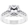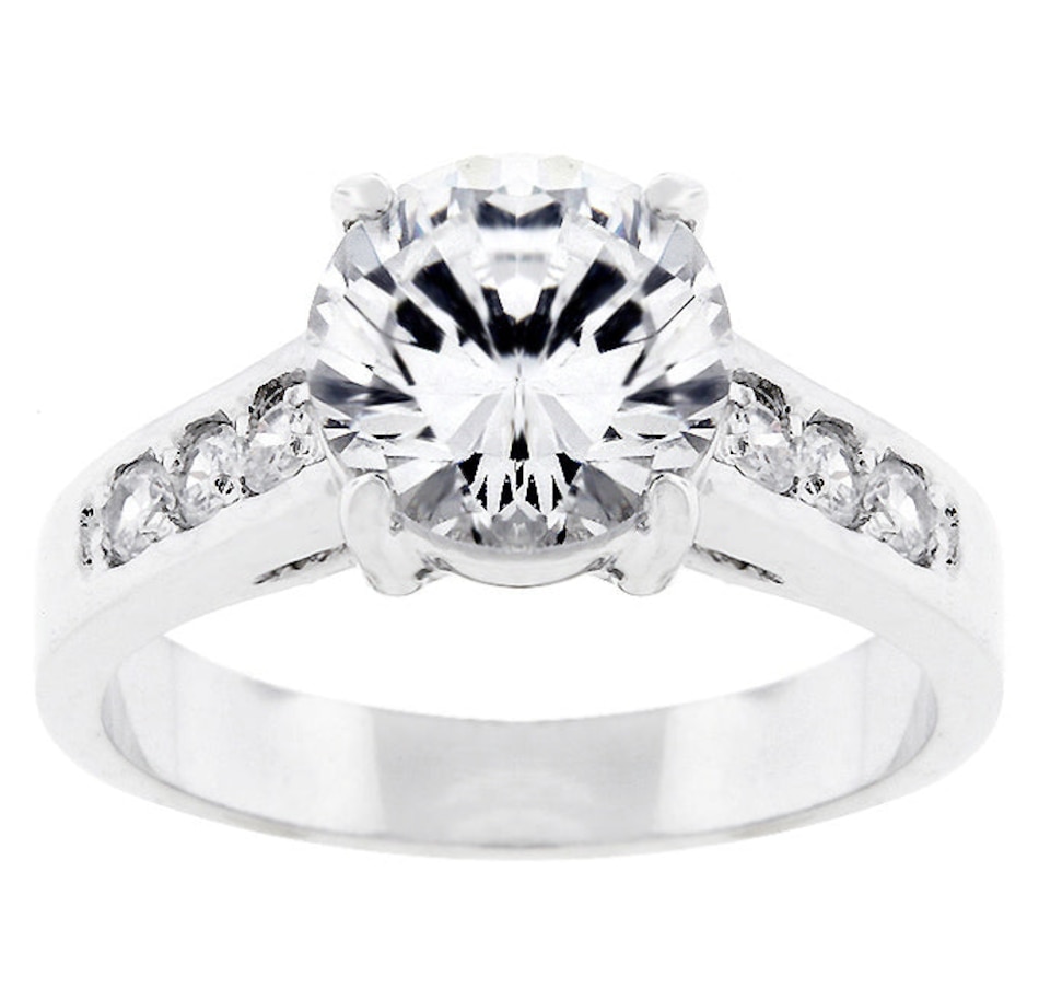 An 8 carat side stone hoisted by a supporting cast of 6 luminous side stones in a cathedral style make this ring. Our genuine finish is achieved using an electroplating process that coats the item with heavy layers of a close cousin to platinum which gives our jewelry a platinum luster.