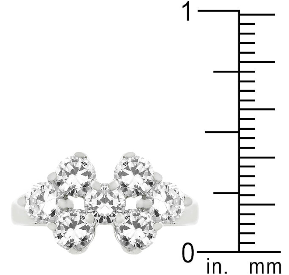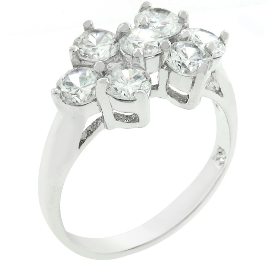 Cluster Ring features seven sparkling round cut cubic zirconia cluste together on a shimmering silver tone band. Genuine Plating is achieved using an electroplating process that coats the item with heavy layers of a close cousin to platinum which gives our jewelry a platinum luster.