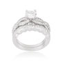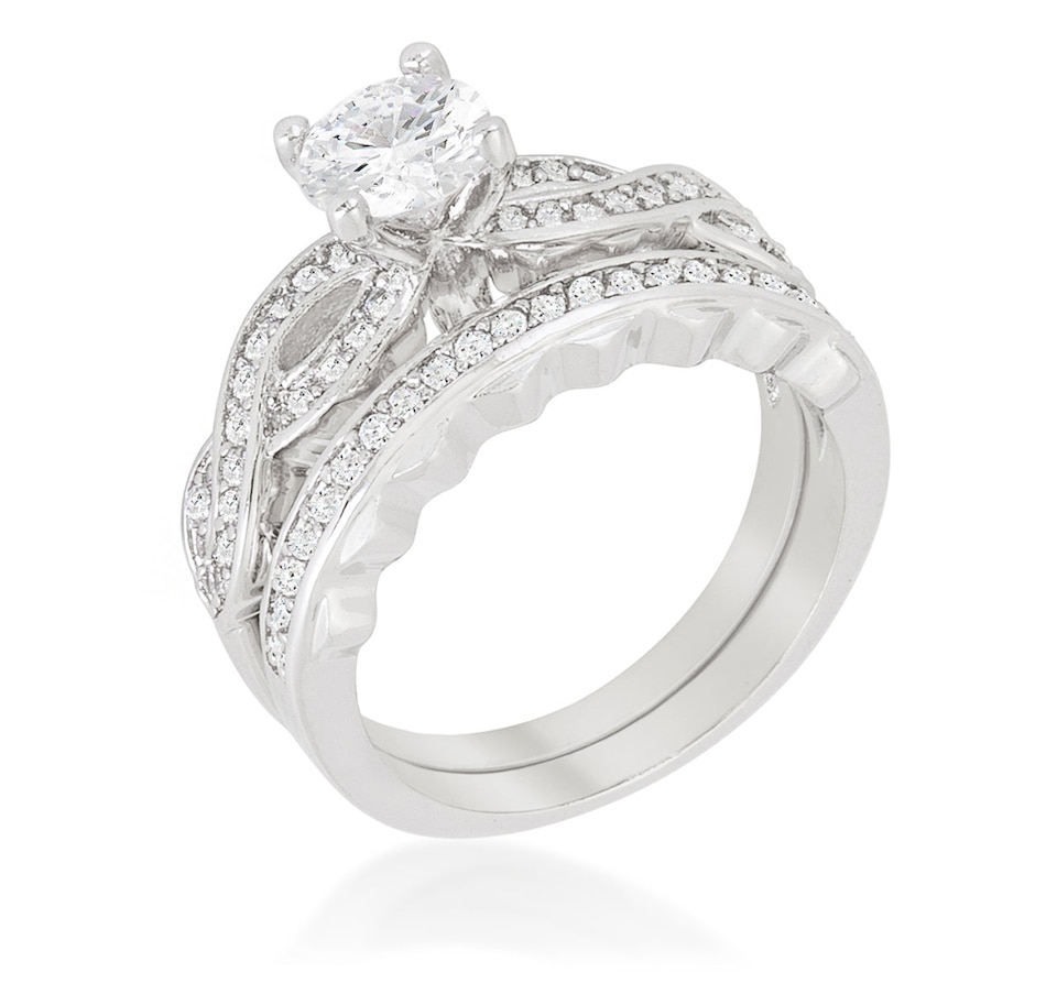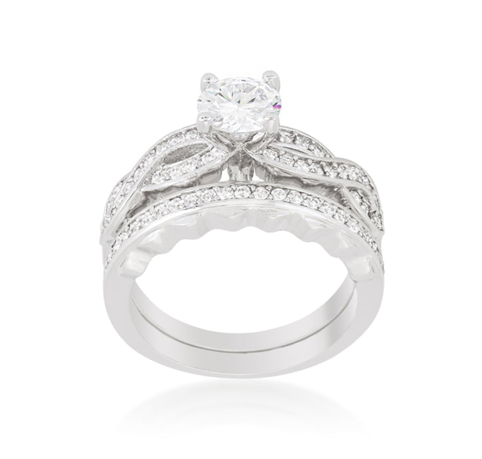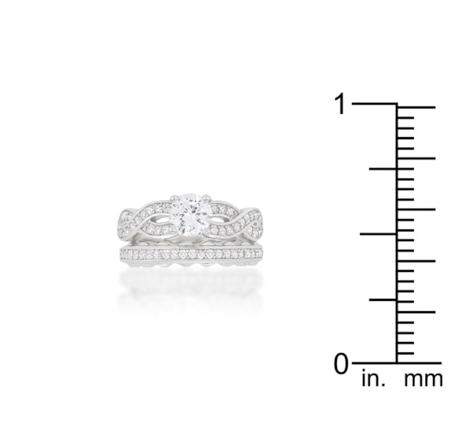 Beautiful and delicate this bridal set features an infinity twist engagement ring with side band in silver tone. Genuine Plating is achieved using an electroplating process that coats the item with heavy layers of a close cousin to platinum which gives our jewelry a platinum luster.