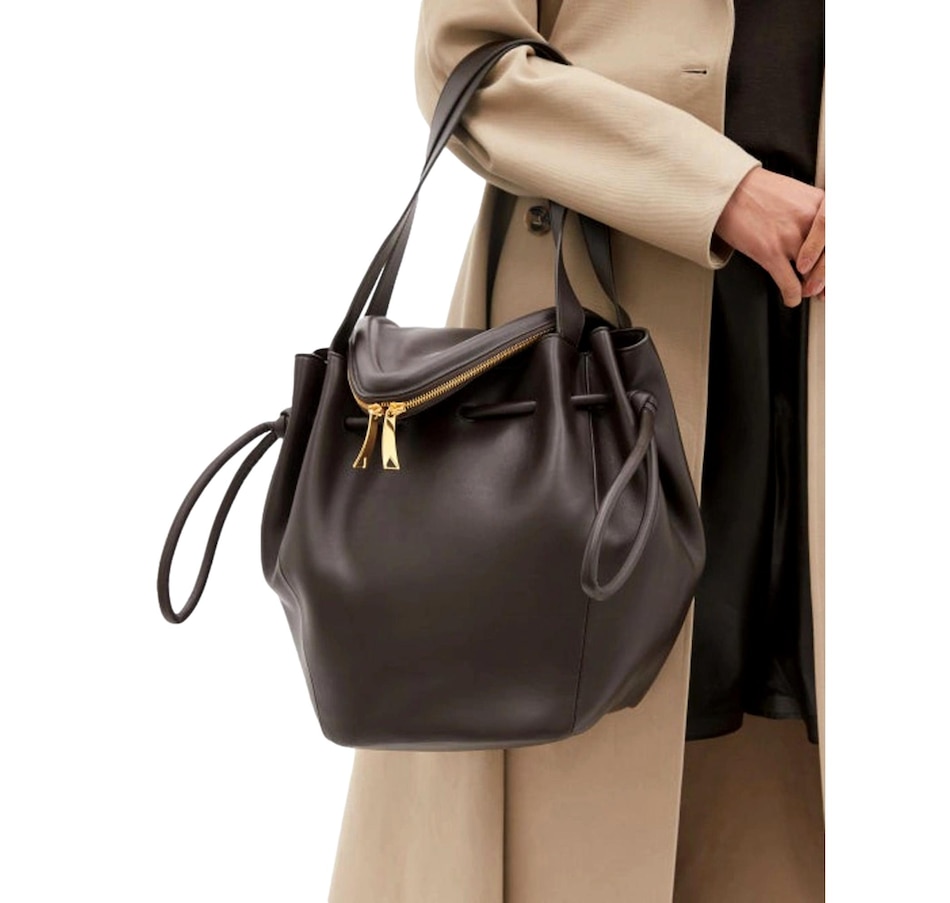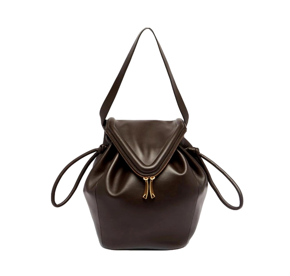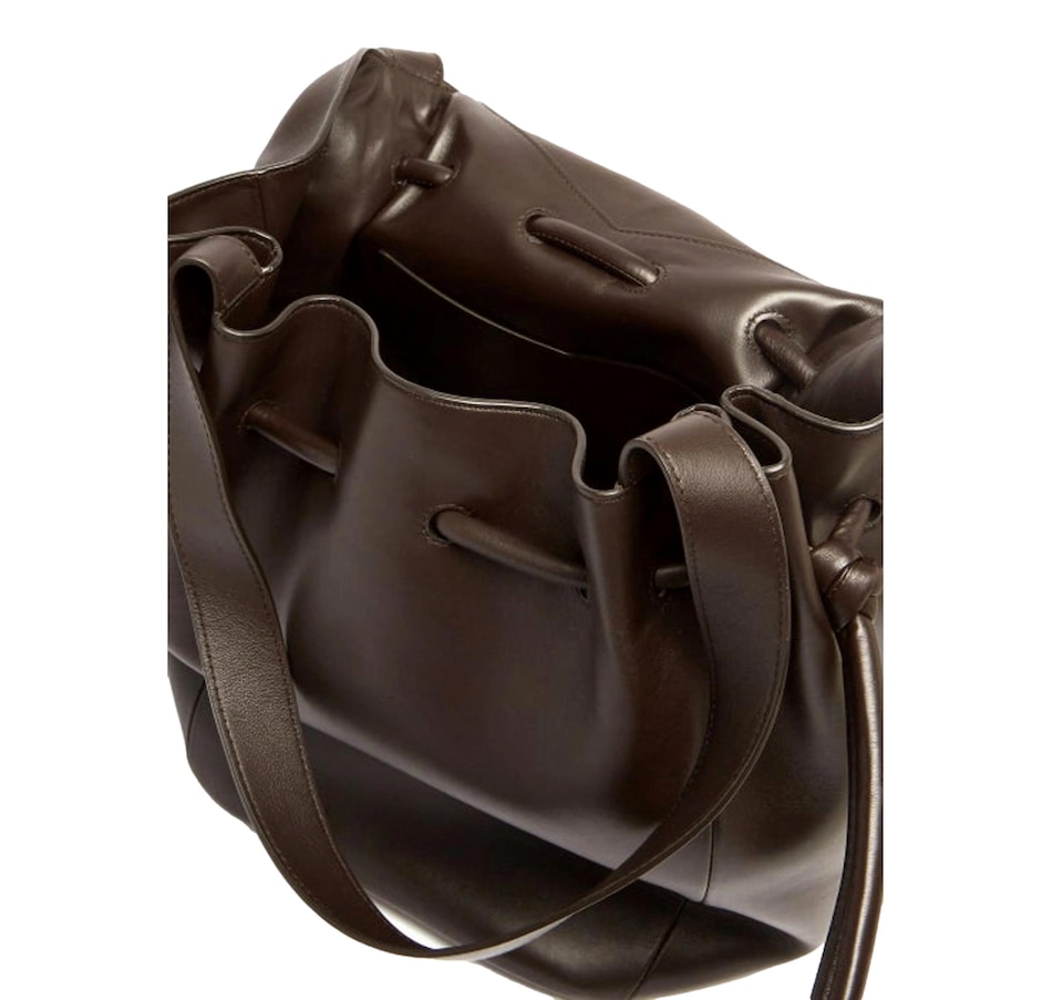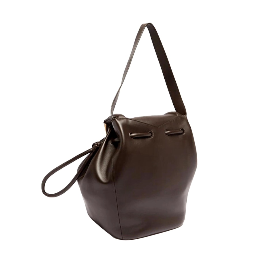 This Large Beak Handbag in brown is crafted in supple calfskin leather. This gorgeous brown leather handbag is the perfect every day bag to carry what you need day in and day out. The design a bucket style with drawstring closure as well as top handles and a shoulder strap.