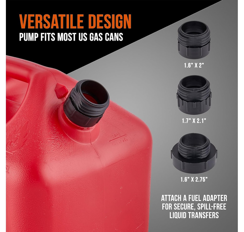 The fluid pump is equipped with three unique can adapters flow control nozzle, extra long hose, and simple on/off button controls. This battery powered transfer pump works with several types of machine-powering liquids like gasoline, kerosene, and diesel. The long, flexible hose on the gasoline transfer pump makes siphoning liquids easy and stress free. Our lightweight, high-speed fluid transfer pump delivers a powerful 2.4 gallon per minute flow at the touch of a button. For an even better spill-free guarantee, equip the one of the different sized adapters on to the fuel can before you pump. Its portable, lightweight design, this gas pump transfer makes it easy to use wherever you need. Made from durable, high-quality material, this transmission fluid pump is built to last and is a reliable part of your toolkit. Keep the portable fuel pump in your trunk, garage, shop, scrapyard, toolkit, shed or closet for quick, clean, dependable liquid transfer.