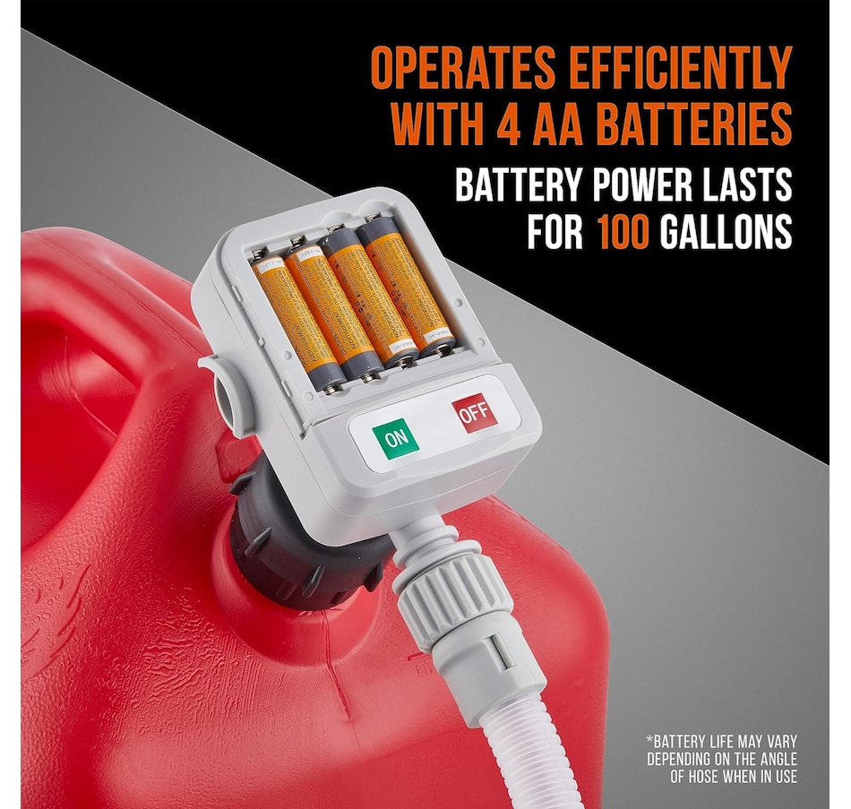 - Operates at 2.4 Gallons Per Minute Using Only 4 AA Batteries [Lasts for Approximately 100 Gallons]