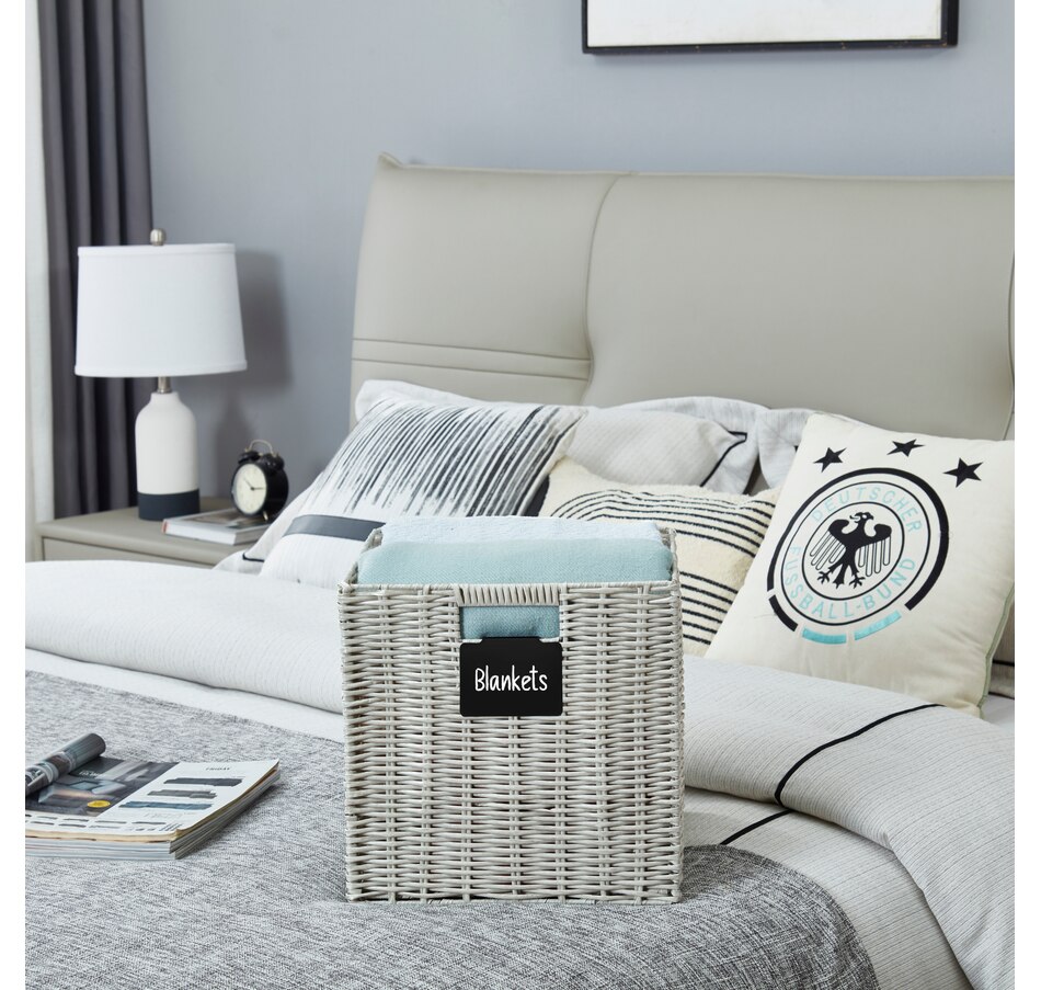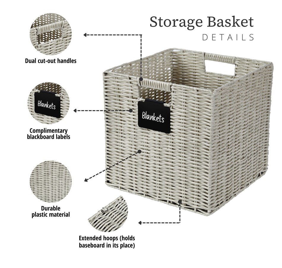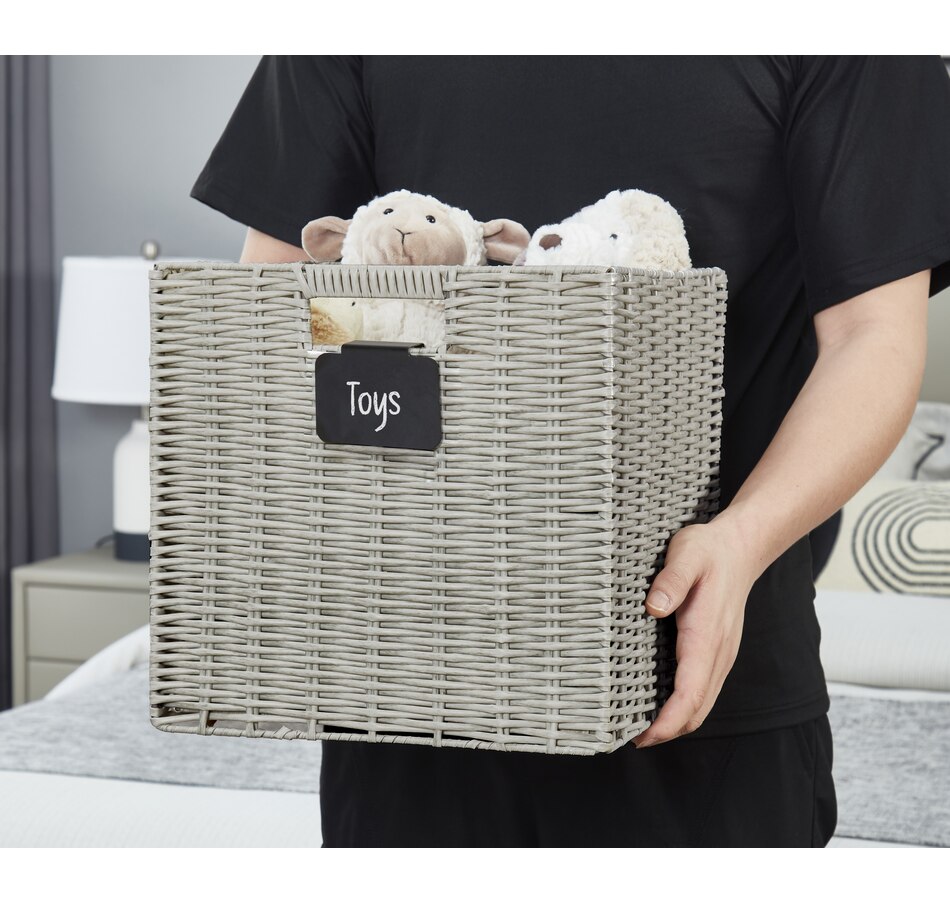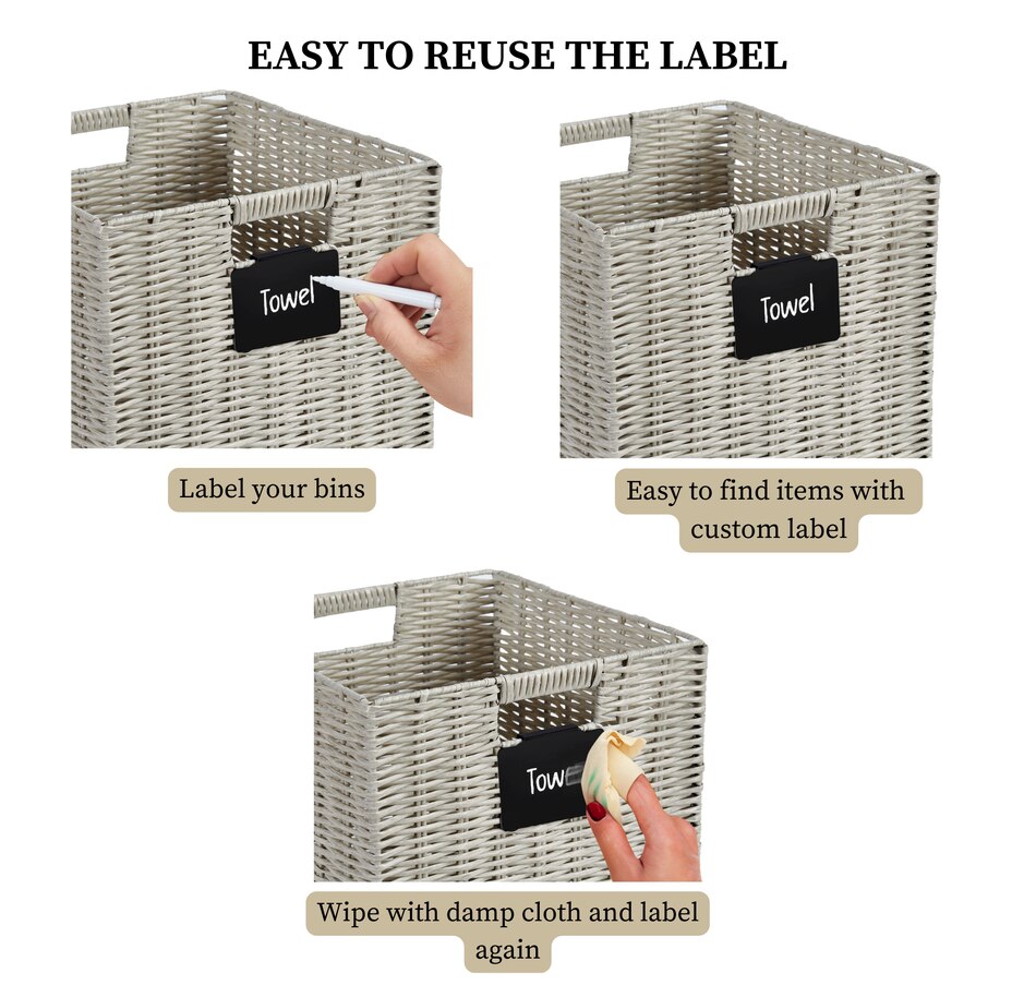 decomomo cube storage bin is made with woven plastic and supported by a metal frame. Adds a chic, modern, and rustic look to your home décor. Plastic storage cubes come with complimentary blackboard labels and white marker with erasable ink making them reusable.