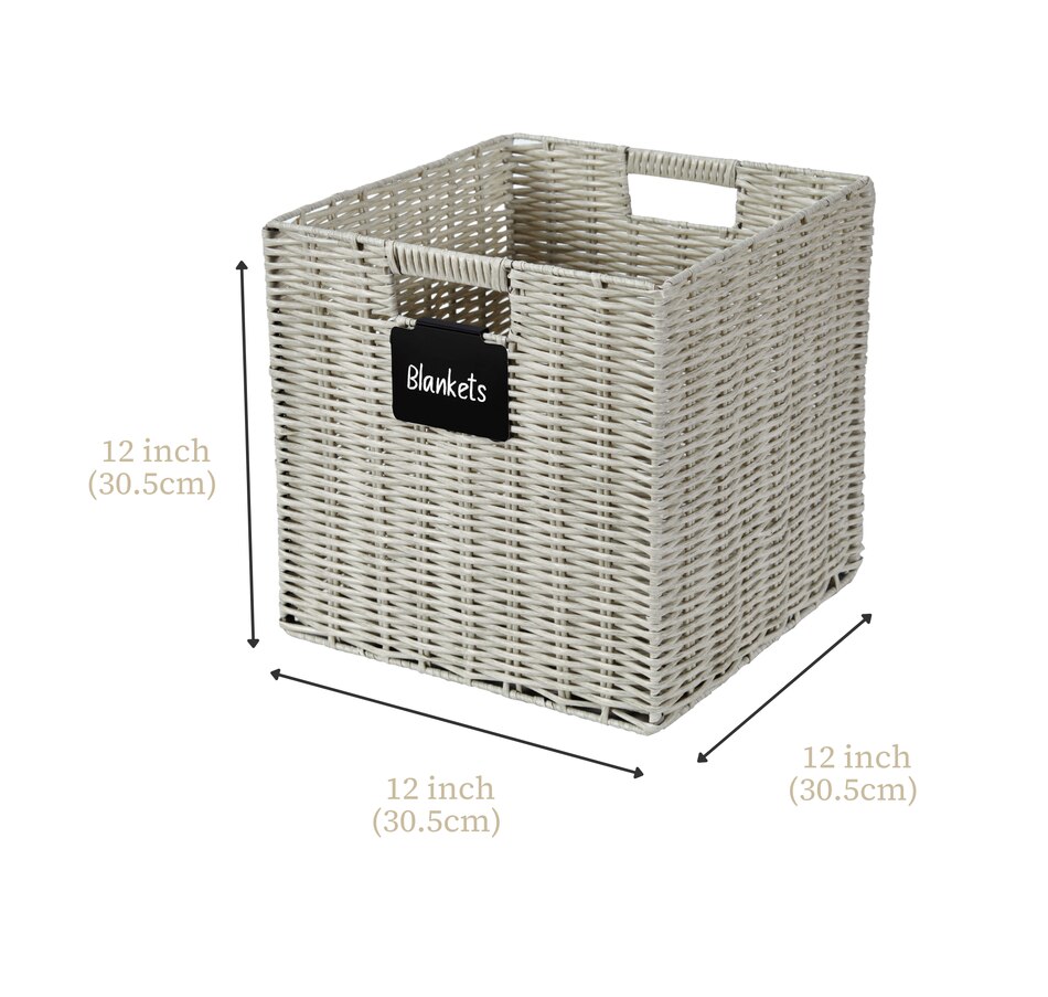 set of 4. Dimensions (each): 12” (l) x 12” (w) x 12” (h) / (30.5 cm x 30.5 cm x 30.5 cm). Decomomo wicker baskets storage organization bins have size that is compatible with the ikea kallax / expedit shelving system, better home, and garden (bhg) shelving unit (12-inch cubie), closetmaid 1305, 8985, 8987 cubicles organizer.