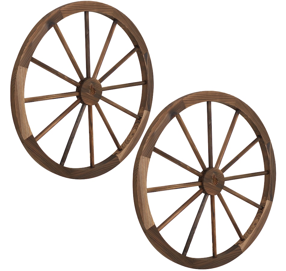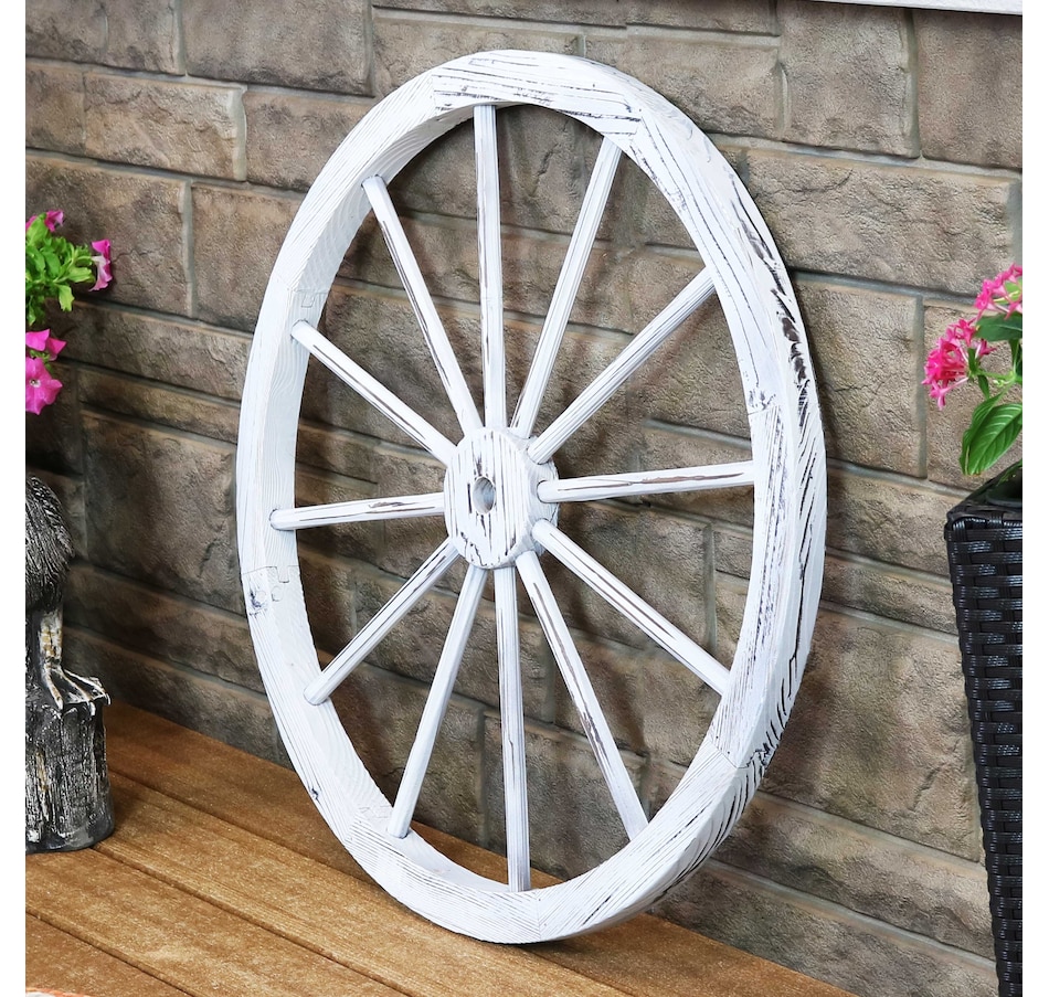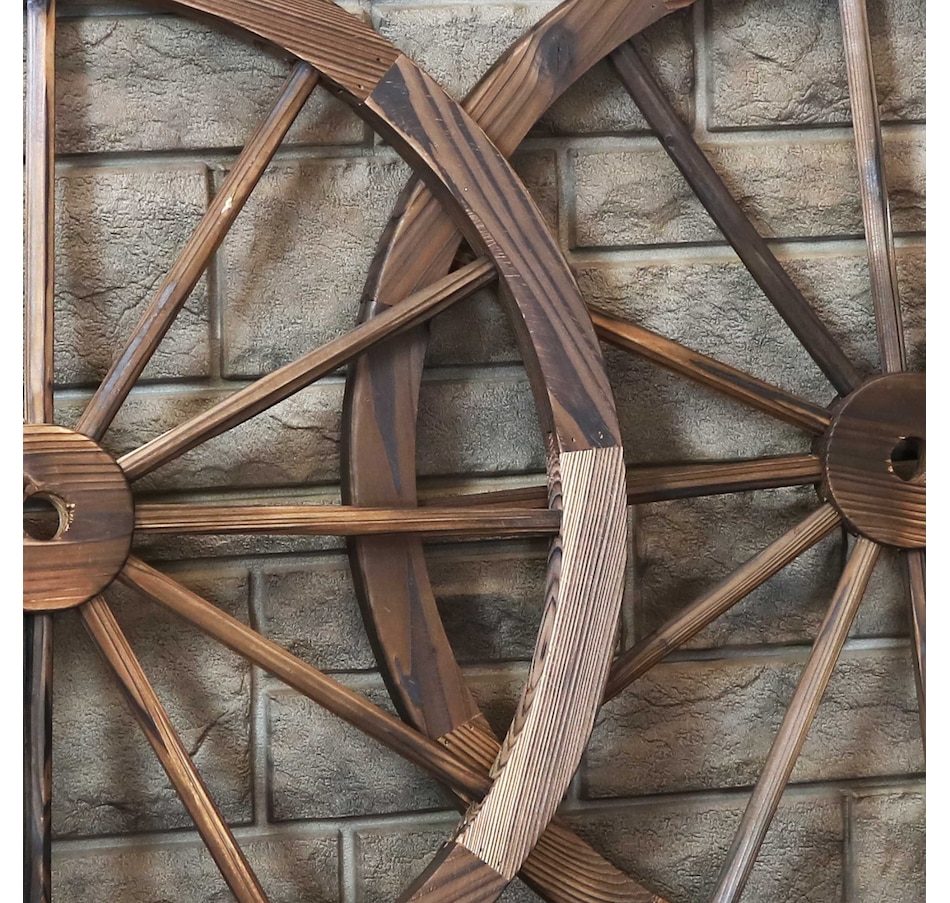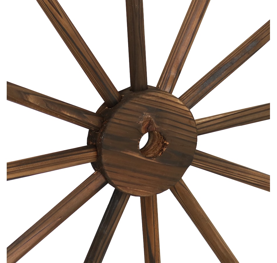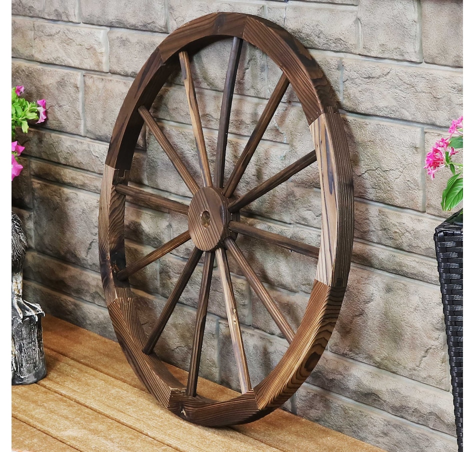 Give the backyard, garden, patio, porch, or front lawn a touch of the Old West with this decorative, wooden wagon wheel. Constructed of natural fir wood, this versatile piece of decor can be used both indoors and outdoors. Place it within bushes, flower beds, or stand it on its own to showcase that Western-style goodness. It can also be placed leaning against a wall or fence or mounted to a wall for an eye-catching accent (please note, hanging hardware is not included with this item and must be purchased separately). The best part is that it already comes assembled, so it can be placed it in its preferred location right away. It's great for decorating the home inside and out, so whether it's placed in the front yard, or hung up in the dining room, this decorative piece is sure to add a quaint touch.