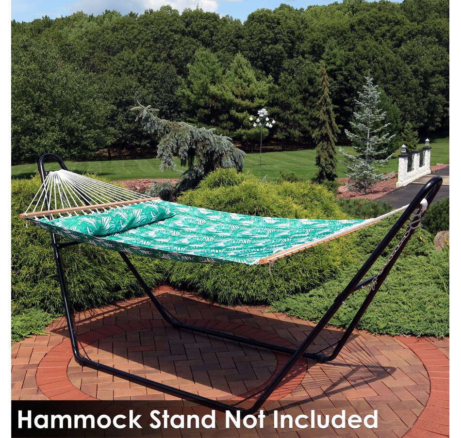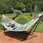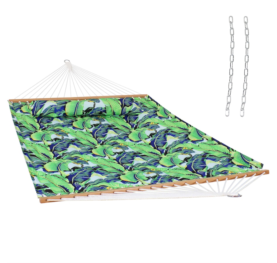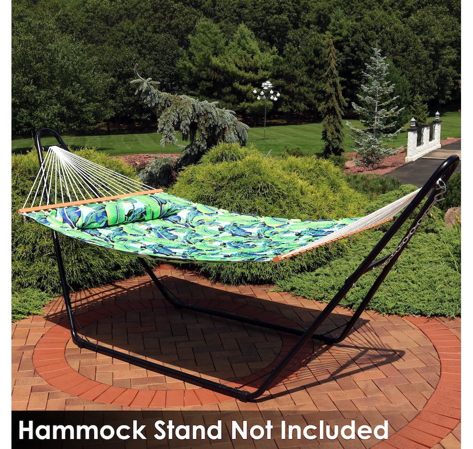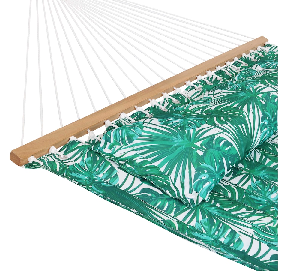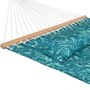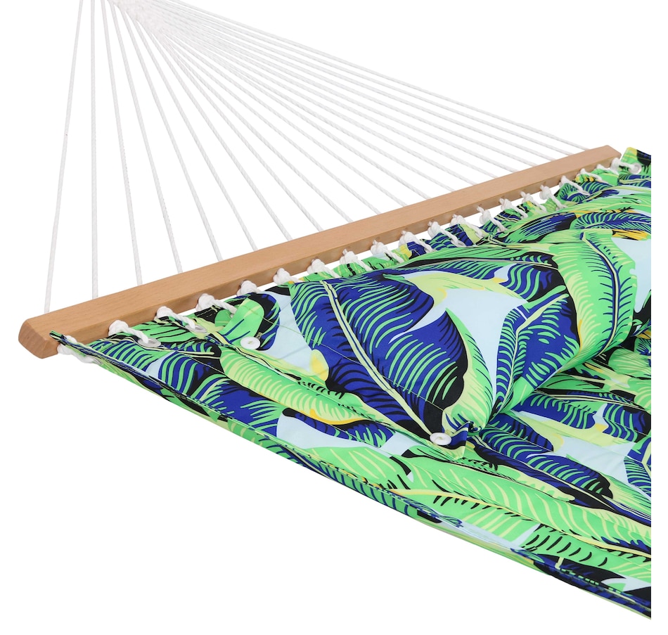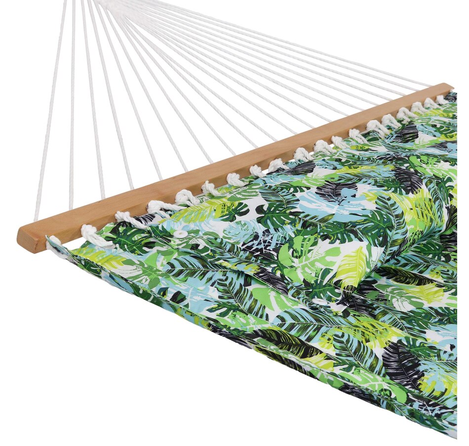 Create a place to relax with this extra comfortable, 2-person, quilted fabric cushion and spreader bar hammock. This cozy, large hammock features a polyester cover and polyester fiber fill as well as a colorful and vibrant print. The print is dye-treated to be UV resistant, so it is sure to stay bright and inviting for years to come despite standing in the sun. This spreader bar hammock is a great addition for the patio, backyard, deck, campsite, park, or any other outdoor area. This backyard hammock can be easily hung from two trees or posts that are 11' to 15' apart. No trees? No problem! With a Sunnydaze 12' or 15' hammock stand (stand not included), this fabric hammock can be used anywhere. Get cozy with a book, a friend, some snacks, or take a nap out in the outdoors with this vibrant and fun spreader bar hammock.