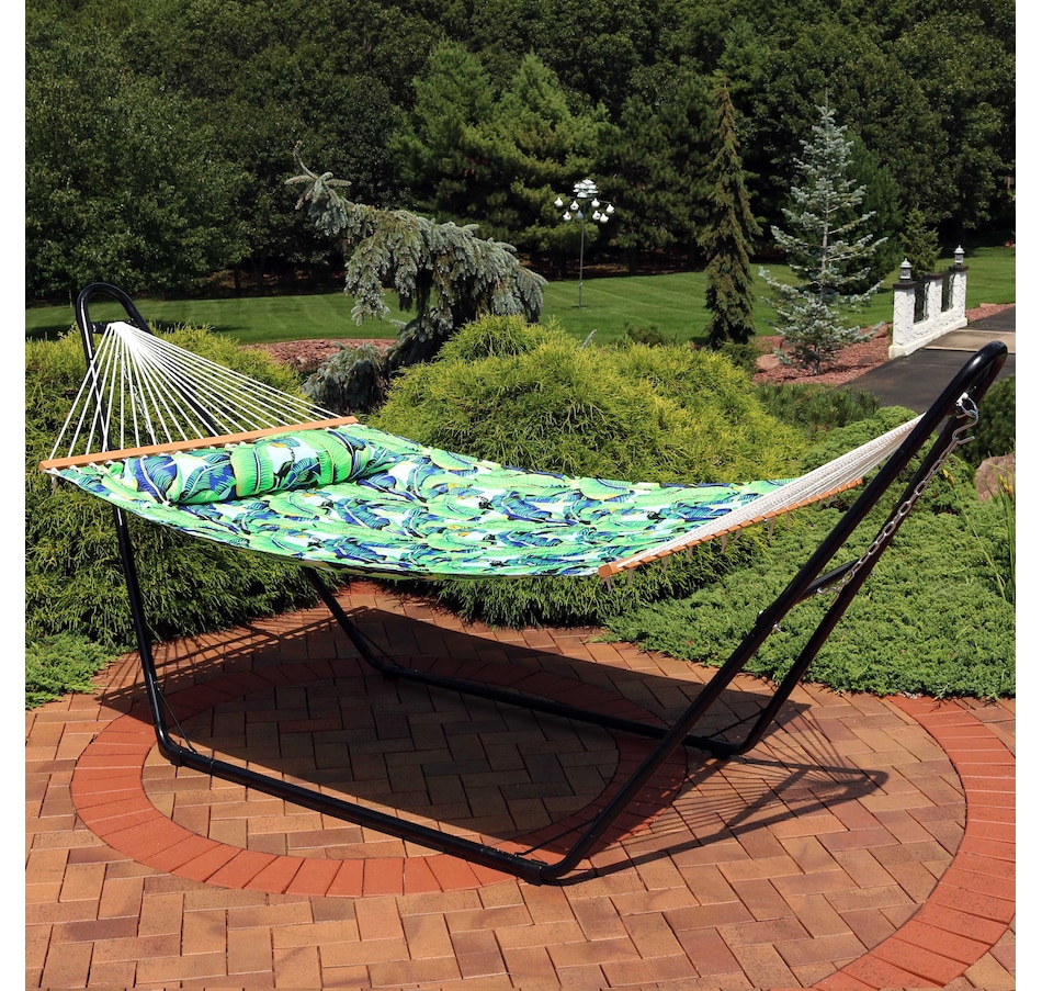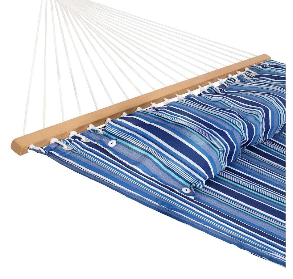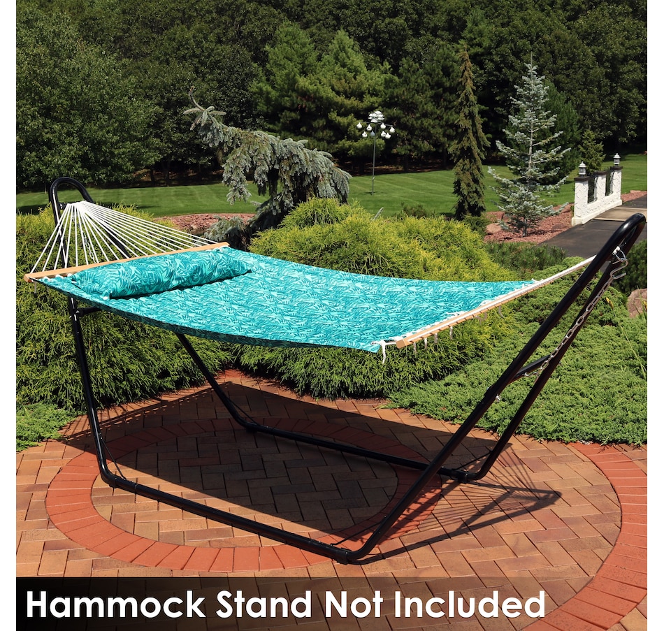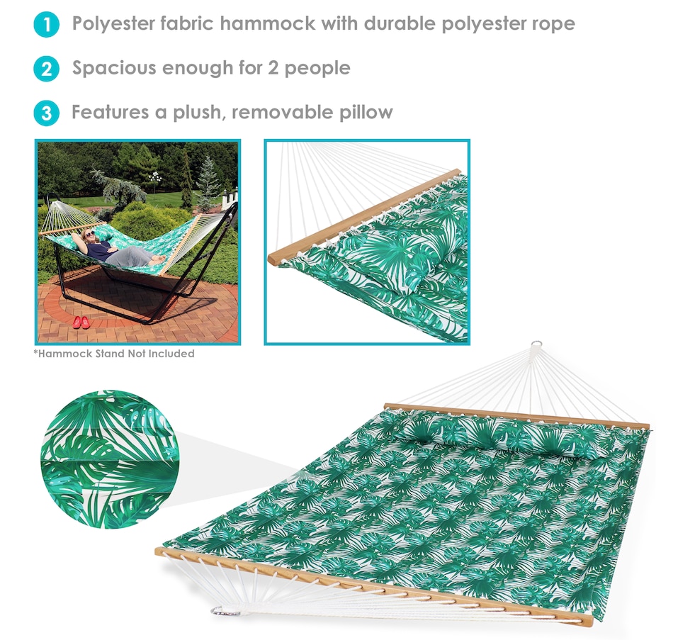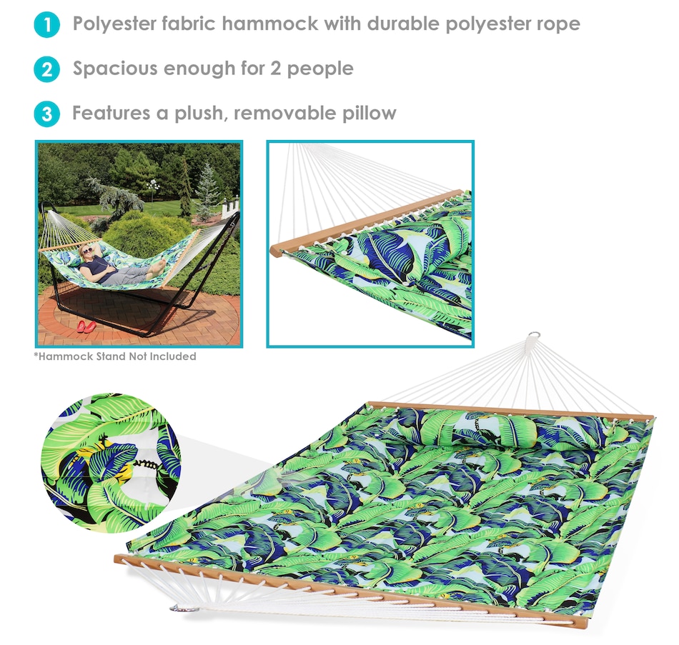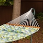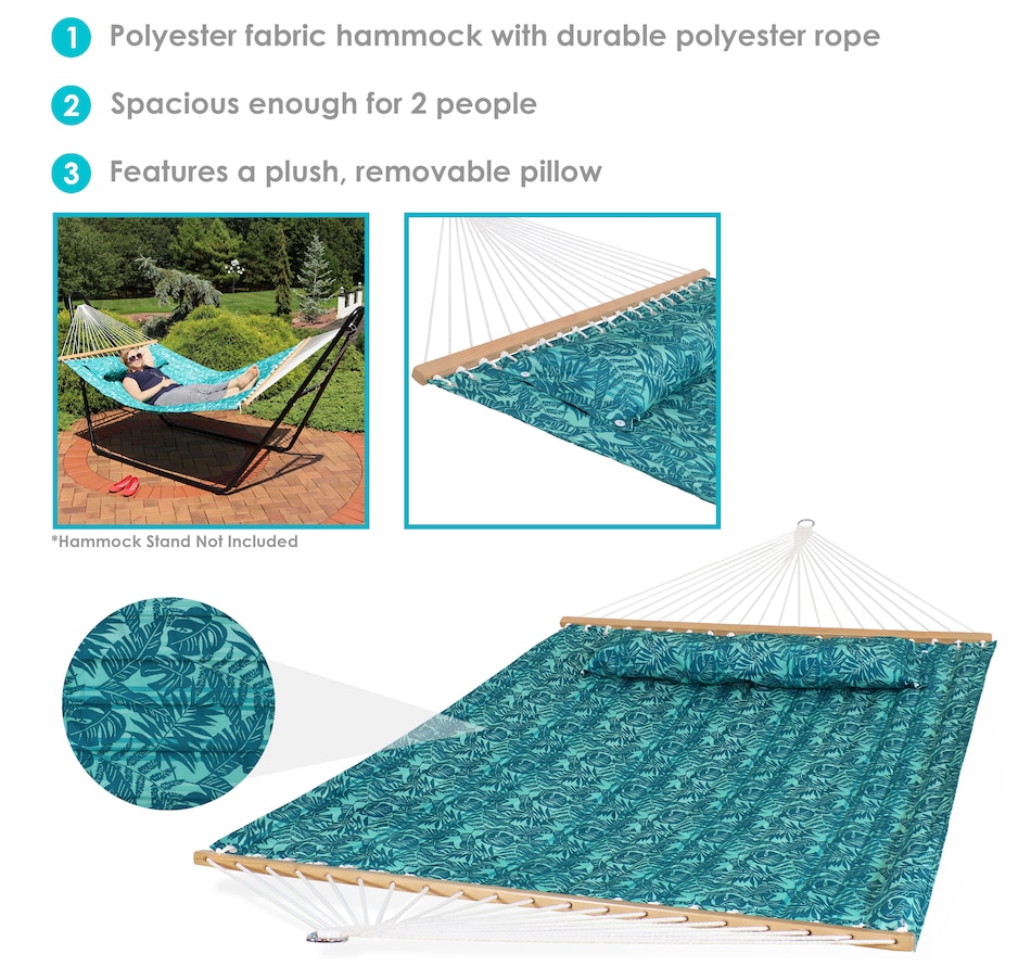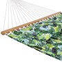 Create a place to relax with this extra comfortable, 2-person, quilted fabric cushion and spreader bar hammock. This cozy, large hammock features a polyester cover and polyester fiber fill as well as a colorful and vibrant print. The print is dye-treated to be UV resistant, so it is sure to stay bright and inviting for years to come despite standing in the sun. This spreader bar hammock is a great addition for the patio, backyard, deck, campsite, park, or any other outdoor area. This backyard hammock can be easily hung from two trees or posts that are 11' to 15' apart. No trees? No problem! With a Sunnydaze 12' or 15' hammock stand (stand not included), this fabric hammock can be used anywhere. Get cozy with a book, a friend, some snacks, or take a nap out in the outdoors with this vibrant and fun spreader bar hammock.