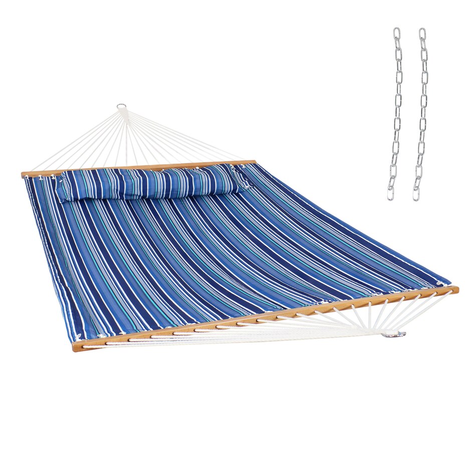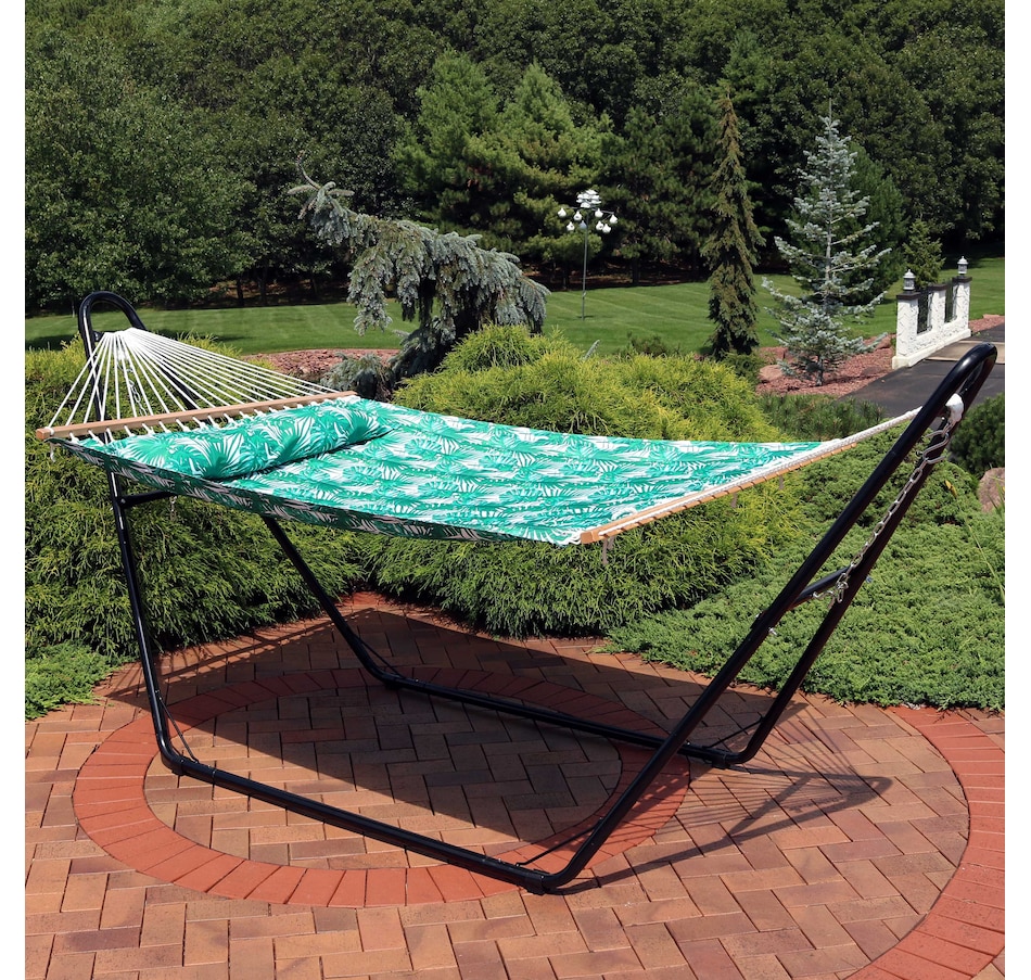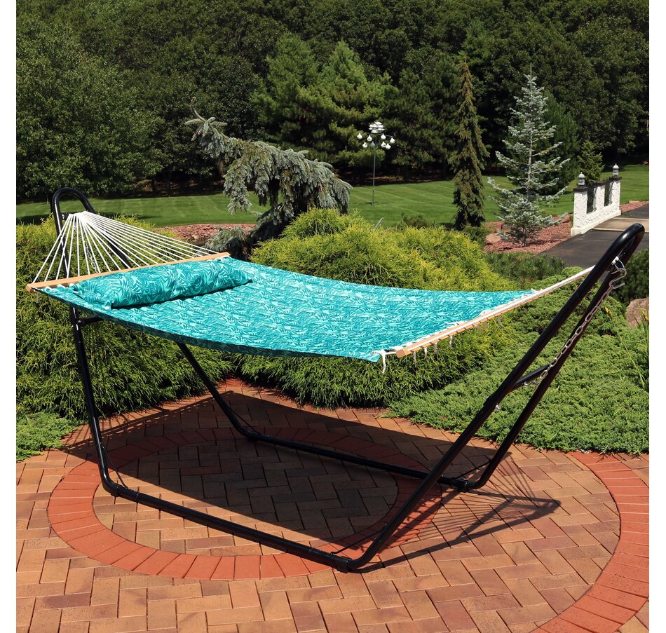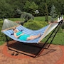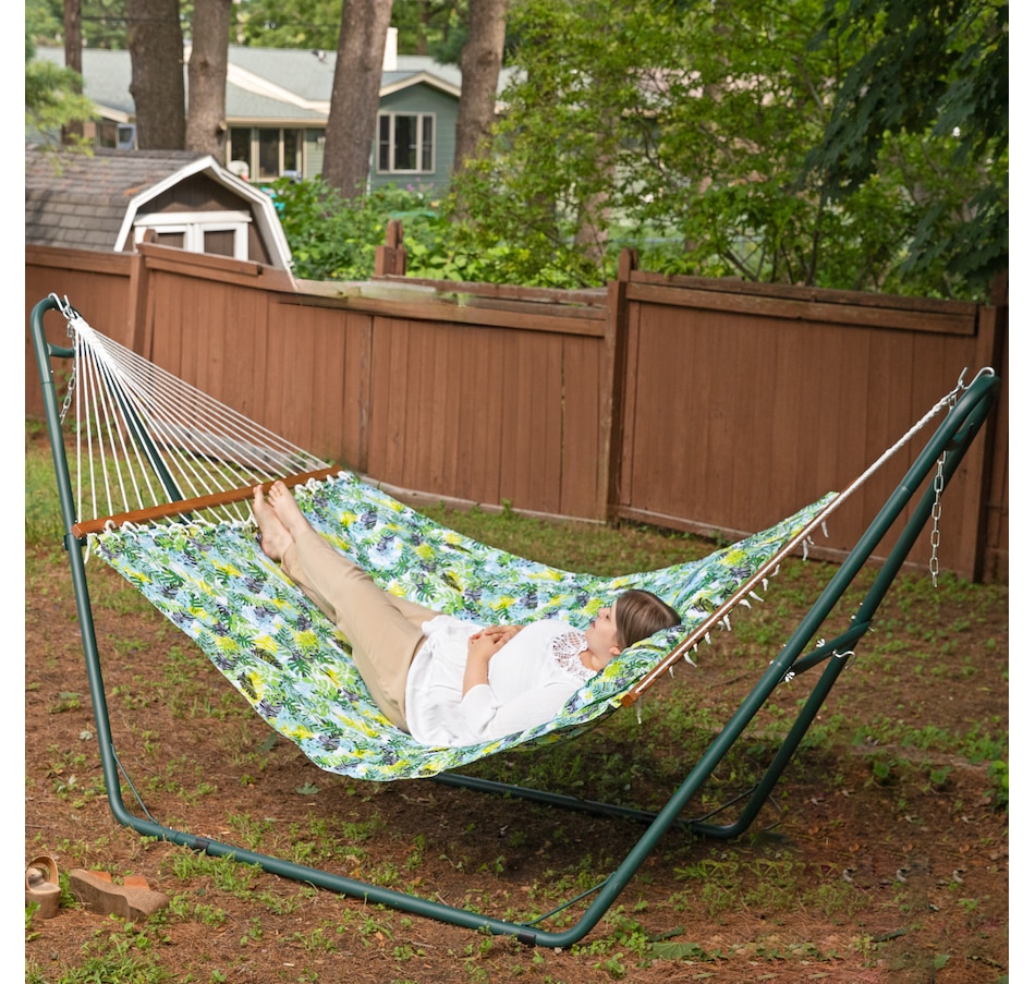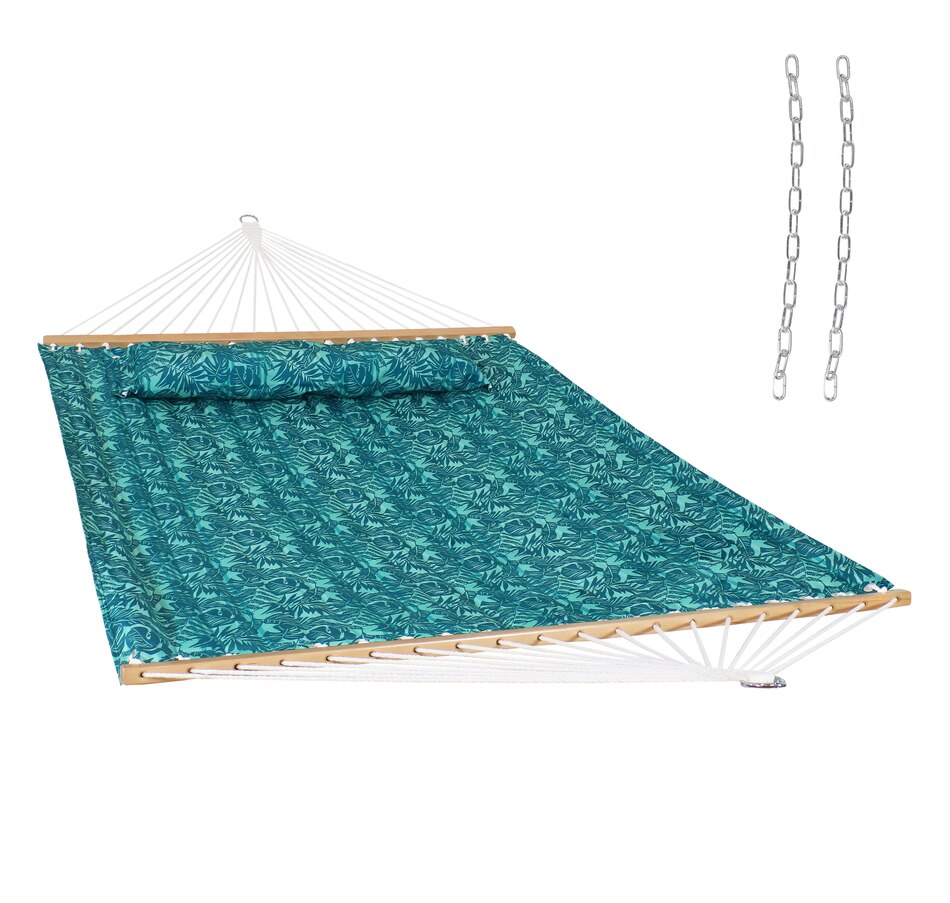 Create a place to relax with this extra comfortable, 2-person, quilted fabric cushion and spreader bar hammock. This cozy, large hammock features a polyester cover and polyester fiber fill as well as a colorful and vibrant print. The print is dye-treated to be UV resistant, so it is sure to stay bright and inviting for years to come despite standing in the sun. This spreader bar hammock is a great addition for the patio, backyard, deck, campsite, park, or any other outdoor area. This backyard hammock can be easily hung from two trees or posts that are 11' to 15' apart. No trees? No problem! With a Sunnydaze 12' or 15' hammock stand (stand not included), this fabric hammock can be used anywhere. Get cozy with a book, a friend, some snacks, or take a nap out in the outdoors with this vibrant and fun spreader bar hammock.