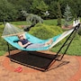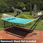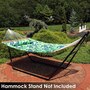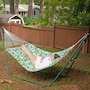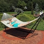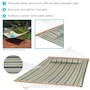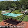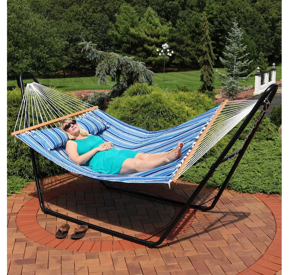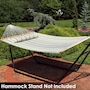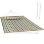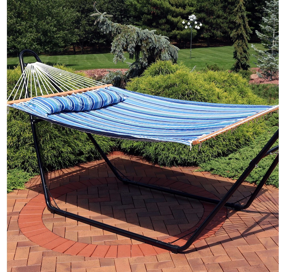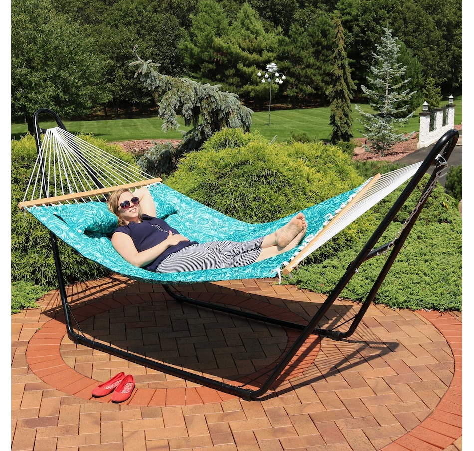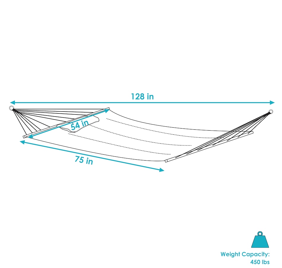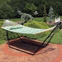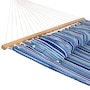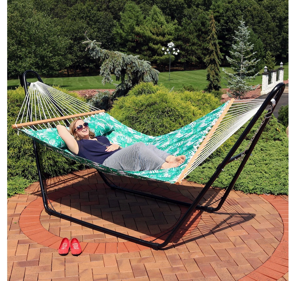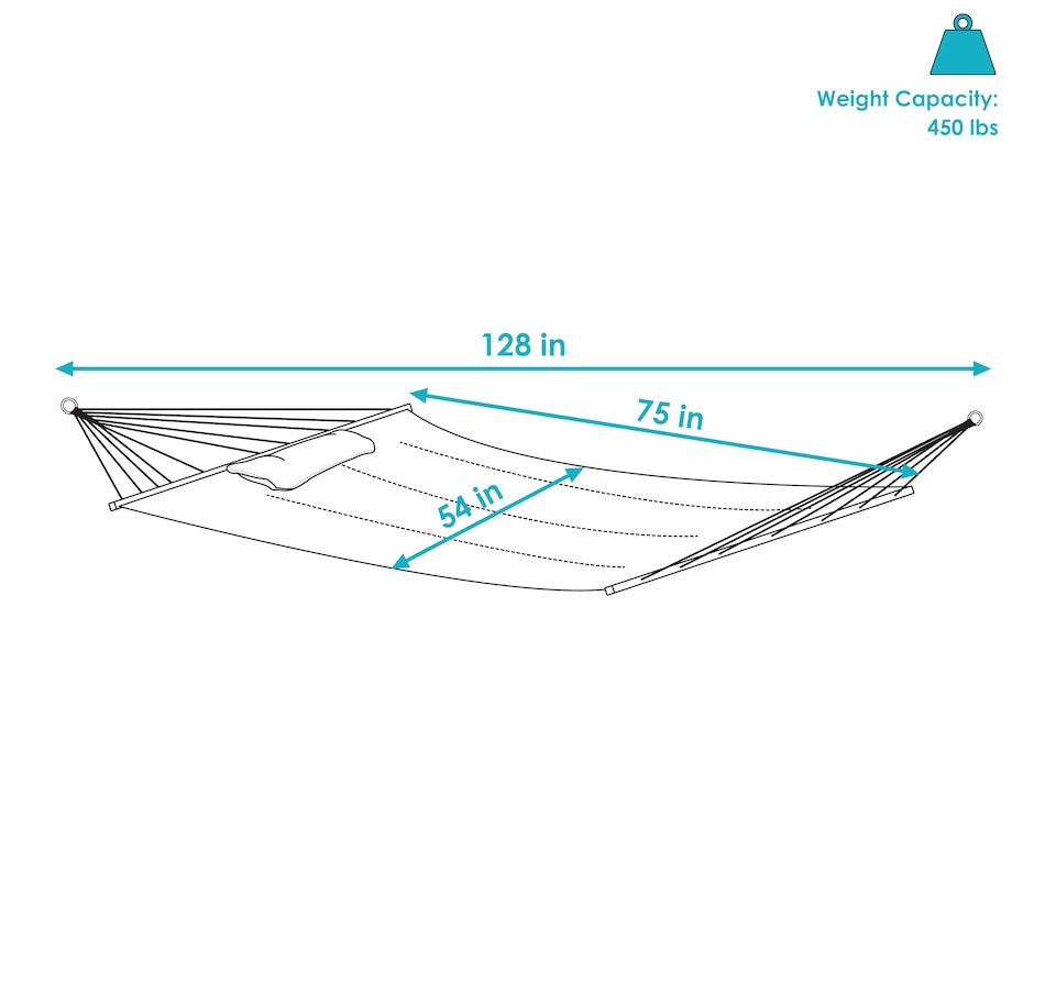 Create a place to relax with this extra comfortable, 2-person, quilted fabric cushion and spreader bar hammock. This cozy, large hammock features a polyester cover and polyester fiber fill as well as a colorful and vibrant print. The print is dye-treated to be UV resistant, so it is sure to stay bright and inviting for years to come despite standing in the sun. This spreader bar hammock is a great addition for the patio, backyard, deck, campsite, park, or any other outdoor area. This backyard hammock can be easily hung from two trees or posts that are 11' to 15' apart. No trees? No problem! With a Sunnydaze 12' or 15' hammock stand (stand not included), this fabric hammock can be used anywhere. Get cozy with a book, a friend, some snacks, or take a nap out in the outdoors with this vibrant and fun spreader bar hammock.