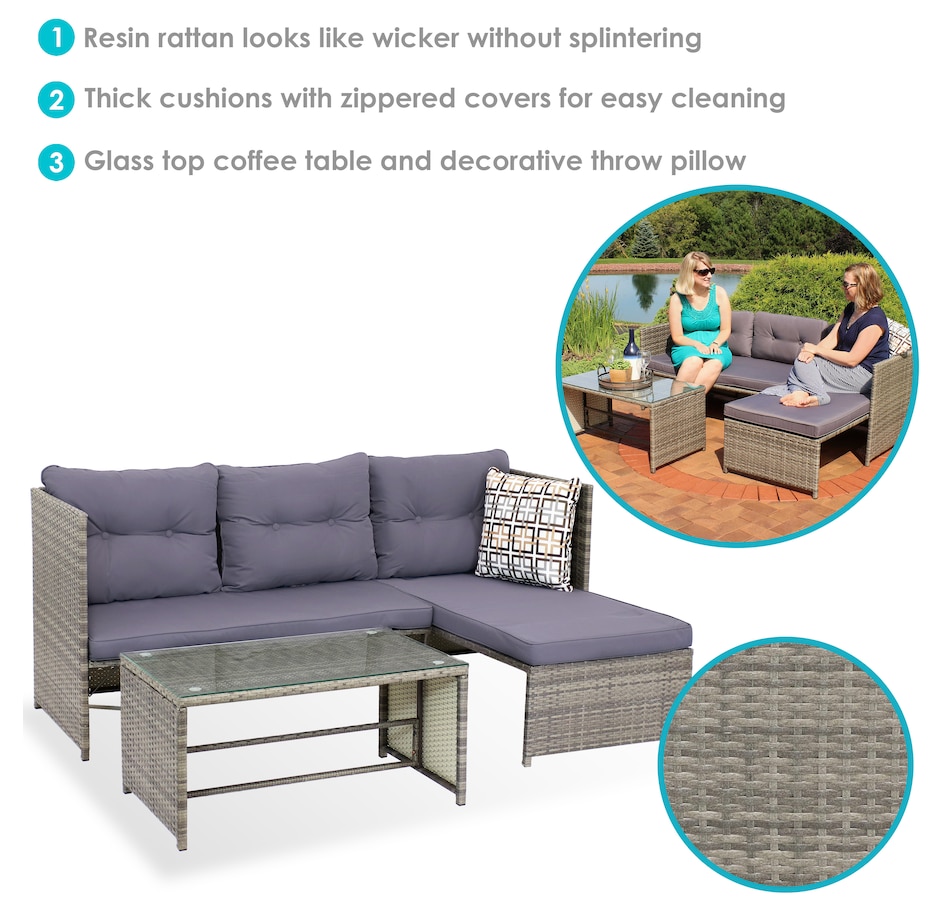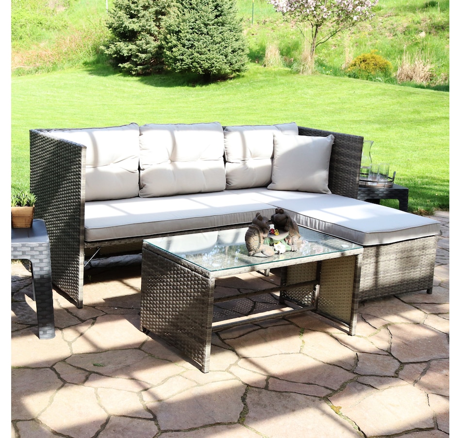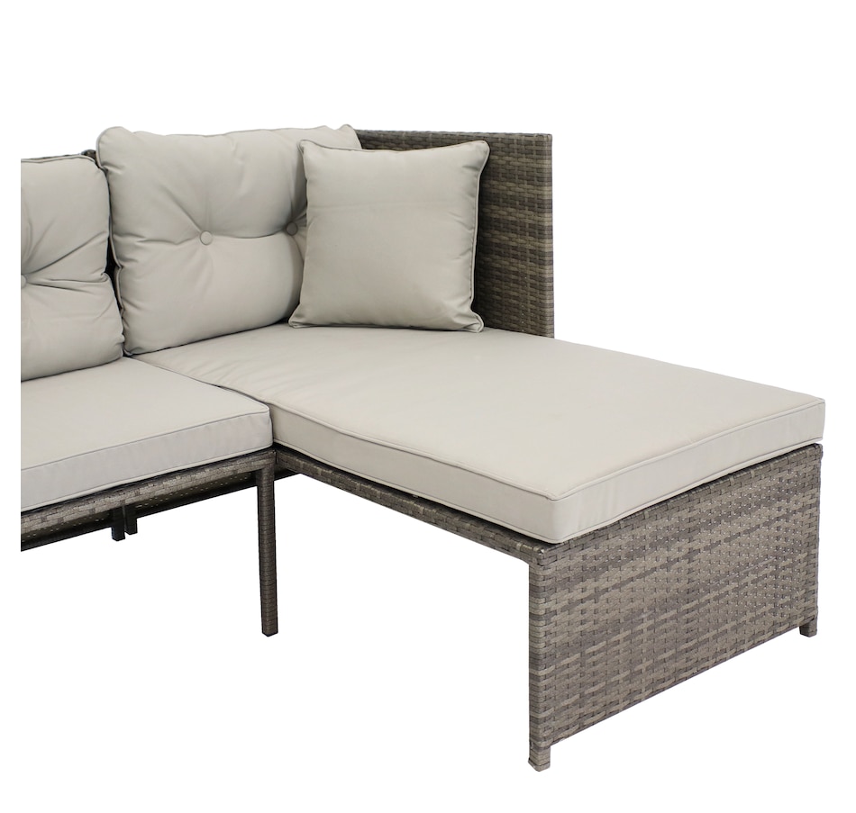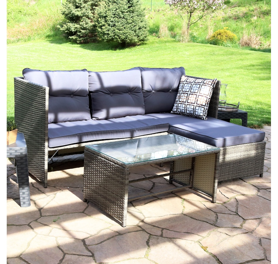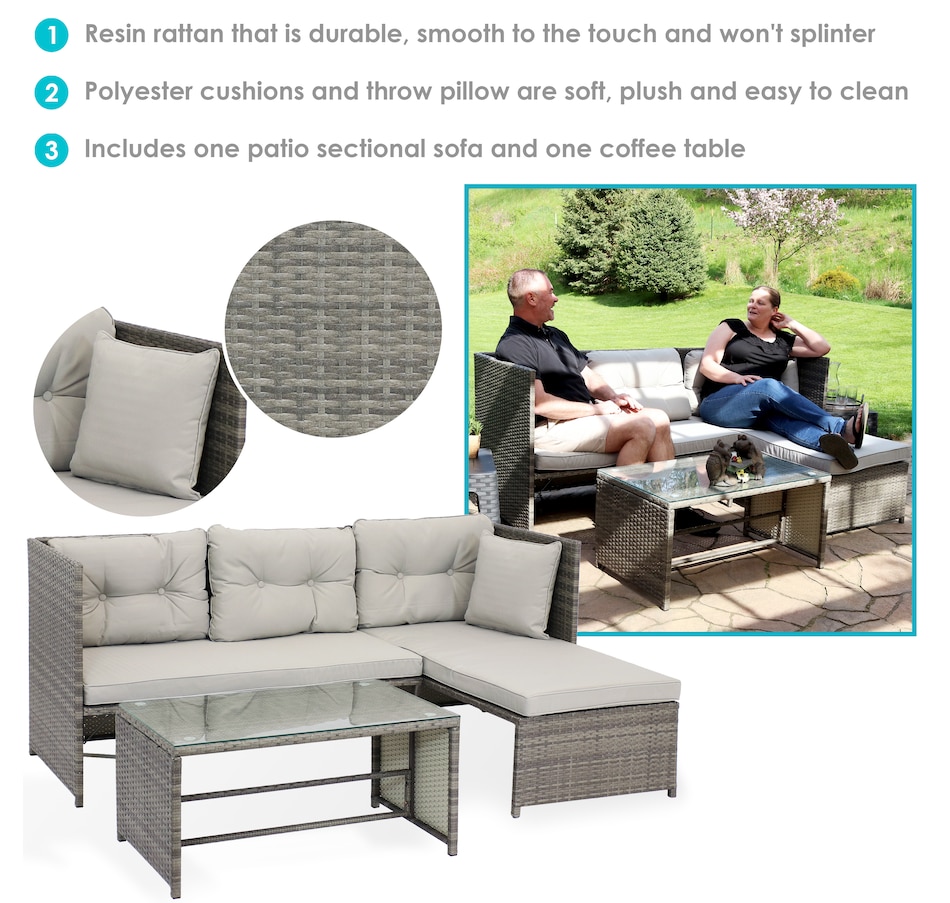 Enjoy a comfortable place to relax in the fresh air with friends and family on the patio or balcony with the Longford patio sectional set. Complete with a comfortable chaise lounge sofa, coffee table, and plush cushions, this outdoor furniture set is great for a variety of outdoor spaces including the garden, porch, backyard, and other living spaces outside the home. Plus, this versatile furniture set can be used indoors in a screened porch or in a bright sunroom during the cooler months to keep the comfort and relaxation alive. Make sure to bring in the cushions during storms to ensure long-lasting use. Each piece of furniture in this set looks like it is constructed of traditional natural wicker material but is actually made of durable resin rattan that is smooth to the touch and won't splinter unlike its natural counterpart. Everything needed to assemble and put together this furniture is in the box, including the tools and hardware.