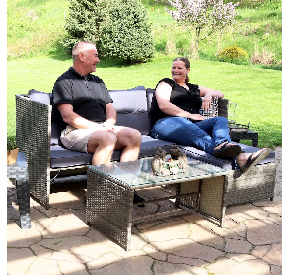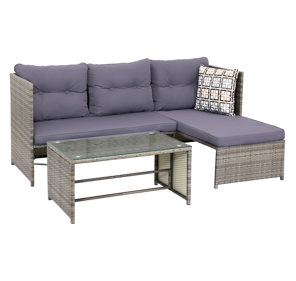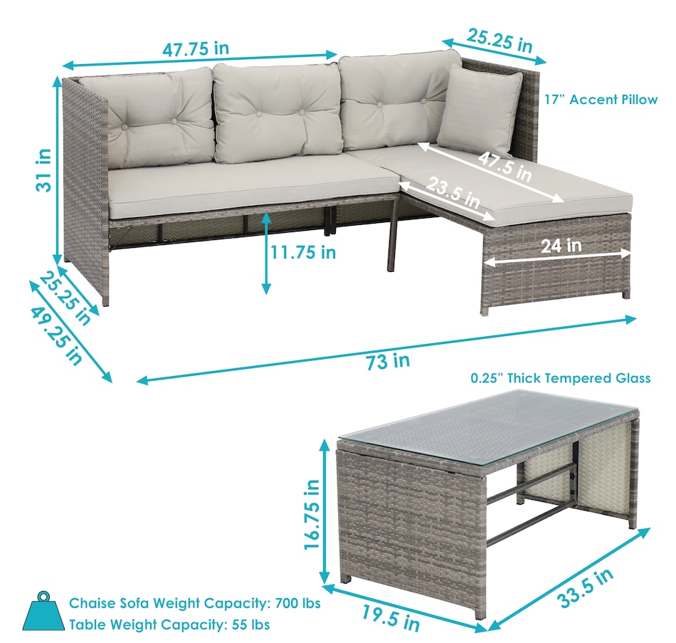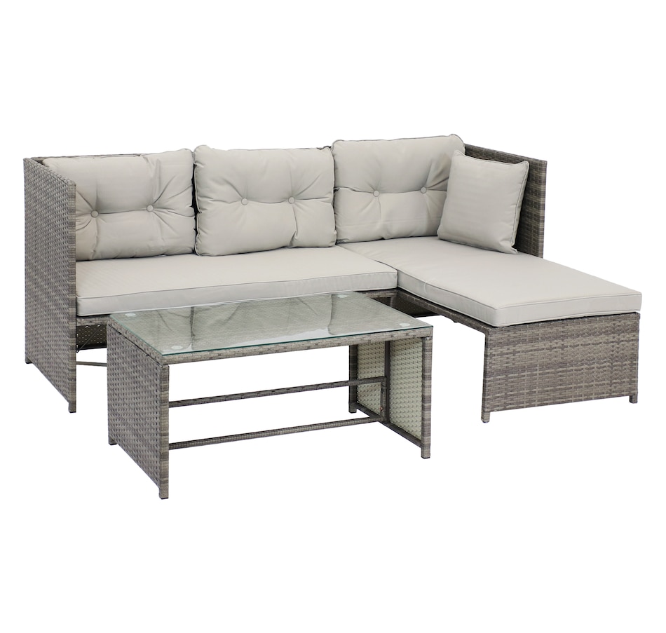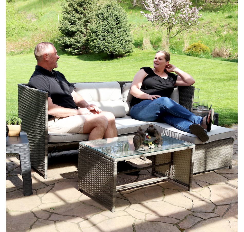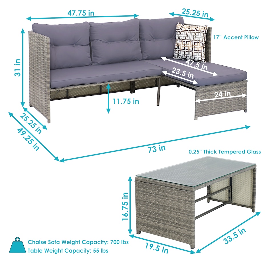 Enjoy a comfortable place to relax in the fresh air with friends and family on the patio or balcony with the Longford patio sectional set. Complete with a comfortable chaise lounge sofa, coffee table, and plush cushions, this outdoor furniture set is great for a variety of outdoor spaces including the garden, porch, backyard, and other living spaces outside the home. Plus, this versatile furniture set can be used indoors in a screened porch or in a bright sunroom during the cooler months to keep the comfort and relaxation alive. Make sure to bring in the cushions during storms to ensure long-lasting use. Each piece of furniture in this set looks like it is constructed of traditional natural wicker material but is actually made of durable resin rattan that is smooth to the touch and won't splinter unlike its natural counterpart. Everything needed to assemble and put together this furniture is in the box, including the tools and hardware.