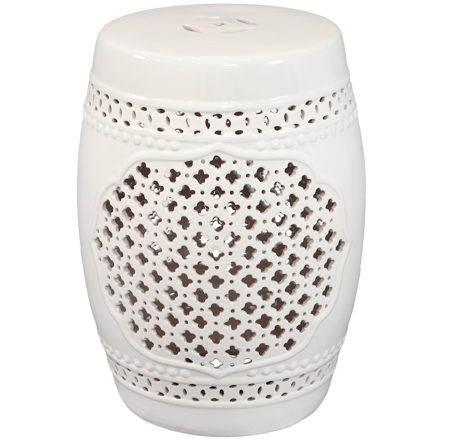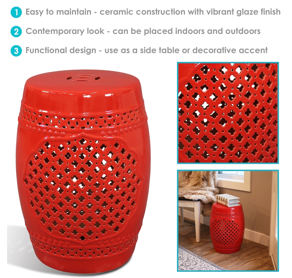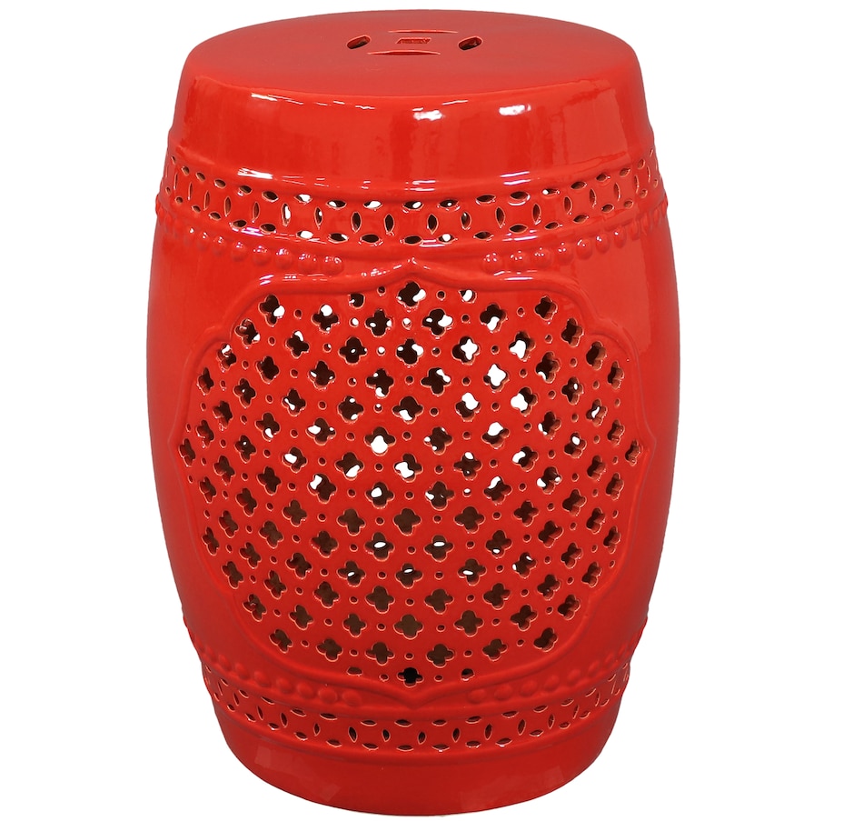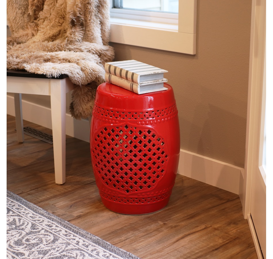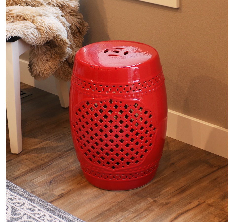 Add an elegant touch of Marrakesh lattice to the garden, sunroom, living room, or patio with this stylish ceramic drum inspired garden stool. This lovely garden stool decor piece is highly versatile and can be used as an end table, a footrest, or as a decorative accent in a variety of indoor or outdoor locations. Beautifully crafted, this decorative garden stool features a vibrant glazed finish and an intricate lattice design to add the right amount of color and style to any space. This modern and stylish stool is made out of durable ceramic material and will stand strong against harsh wind and rain when placed outside. Due to the protective coating, the color of this stool isn't going to wear away easily from excessive sun exposure either! Keep this stool nearby on the porch or back patio to keep drinks, books, or snacks close. Or place this stool in the garden for an easy spot to relax.