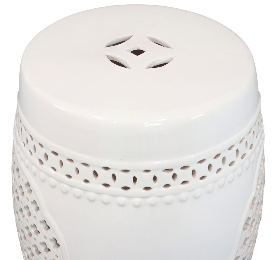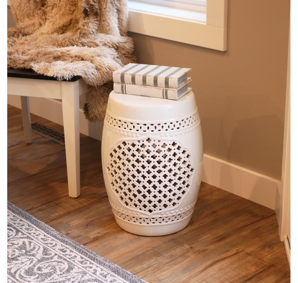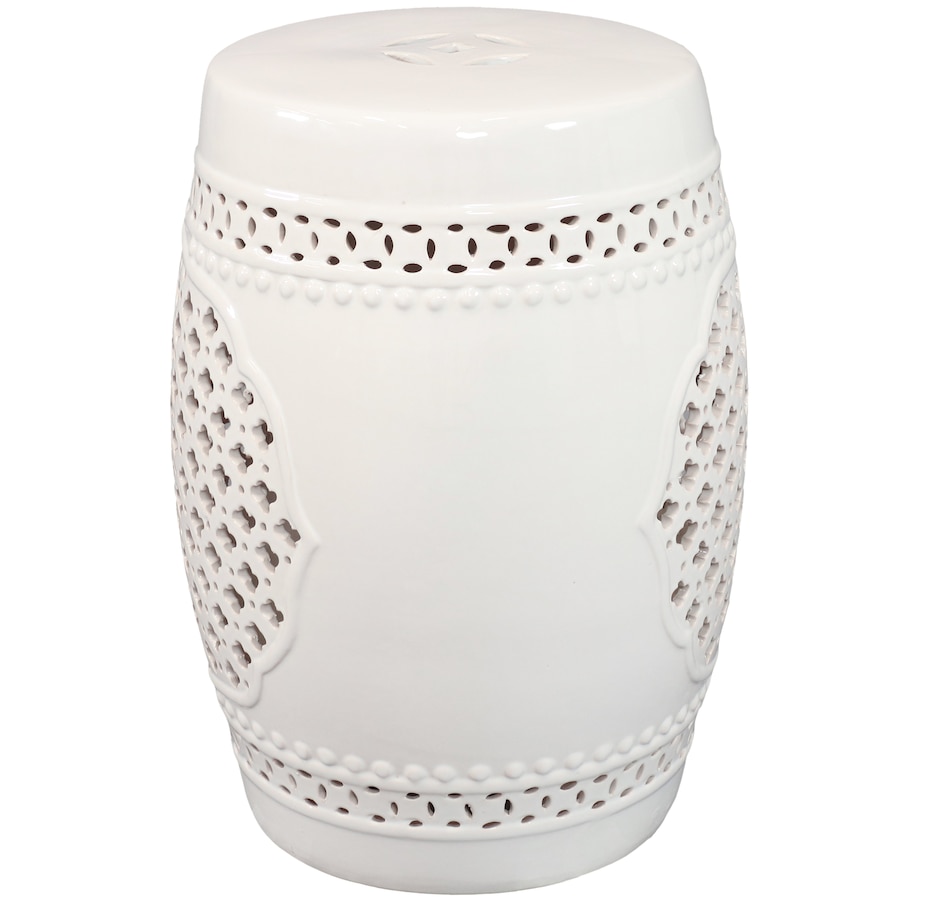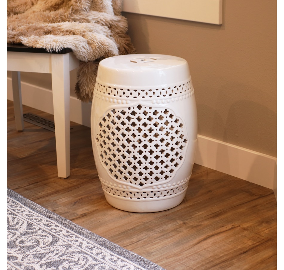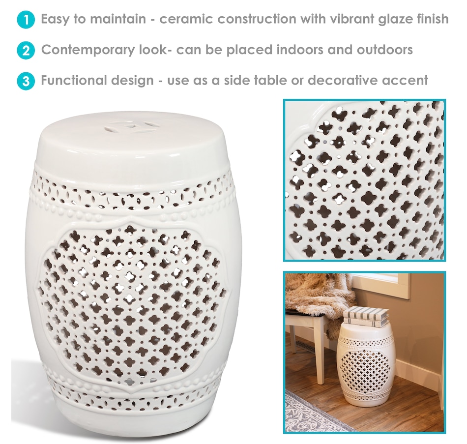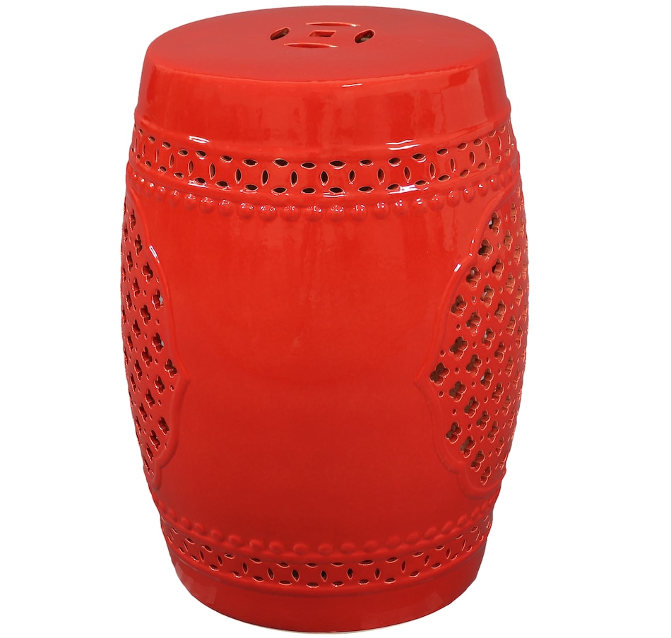 Add an elegant touch of Marrakesh lattice to the garden, sunroom, living room, or patio with this stylish ceramic drum inspired garden stool. This lovely garden stool decor piece is highly versatile and can be used as an end table, a footrest, or as a decorative accent in a variety of indoor or outdoor locations. Beautifully crafted, this decorative garden stool features a vibrant glazed finish and an intricate lattice design to add the right amount of color and style to any space. This modern and stylish stool is made out of durable ceramic material and will stand strong against harsh wind and rain when placed outside. Due to the protective coating, the color of this stool isn't going to wear away easily from excessive sun exposure either! Keep this stool nearby on the porch or back patio to keep drinks, books, or snacks close. Or place this stool in the garden for an easy spot to relax.
