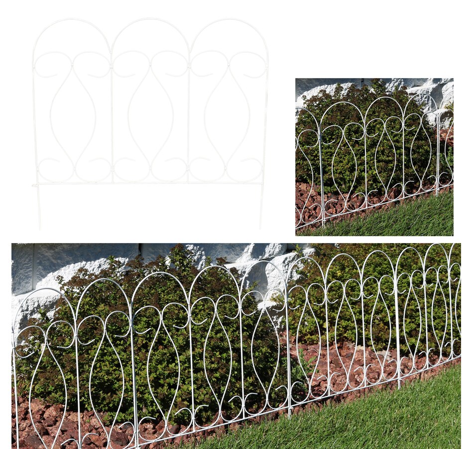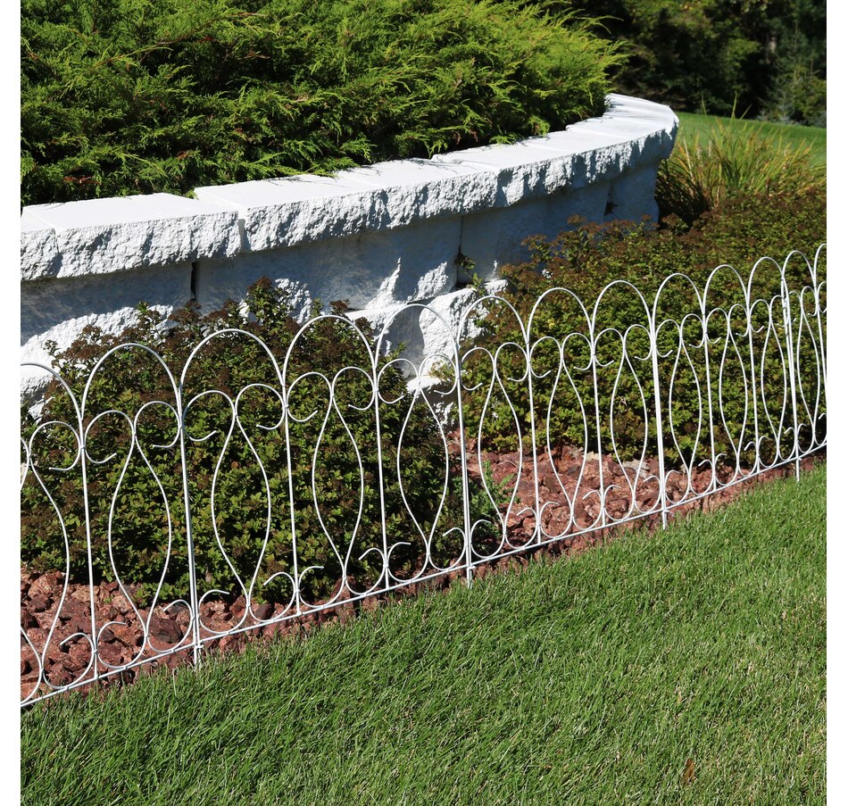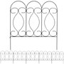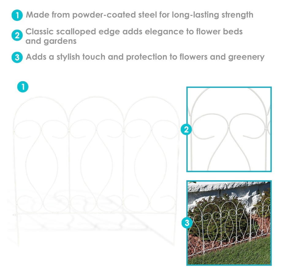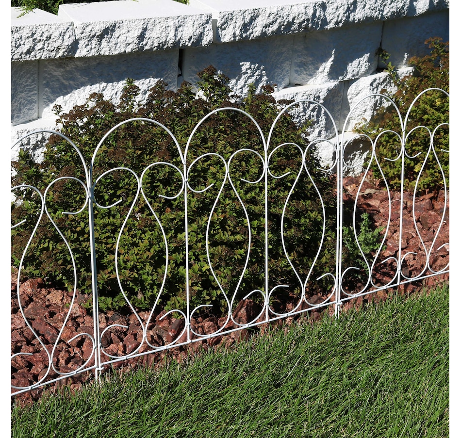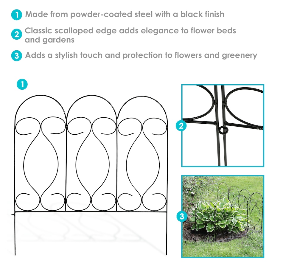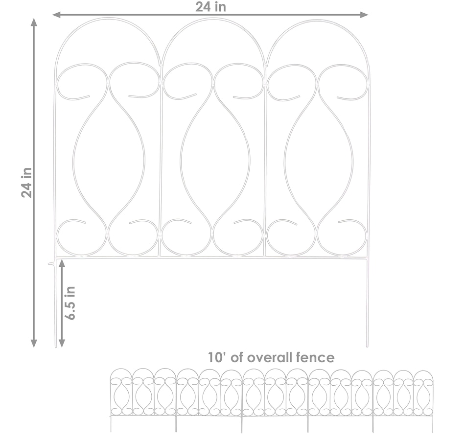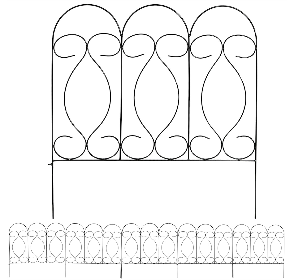 Create an elegant border around a flower bed, pathway, or yard with these decorative garden fencing panels. These traditional-styled borders are great for any outdoor space with each panel featuring three rounded arches and longer posts that stick steadily into the ground for strength and durability against the outdoor elements. Made from durable, rust-resistant iron, these fencing panels are designed with long-lasting strength and beauty. Each section is connected with a hook and loop on each side of the panel. This connection creates a complete border to enhance and protect a beautiful walkway, garden, or planting area. This garden animal barrier fence is not only great for adding a stylish touch to a garden but are also wonderful for protecting flowers from unwanted disturbance from pets, wild animals, and people.