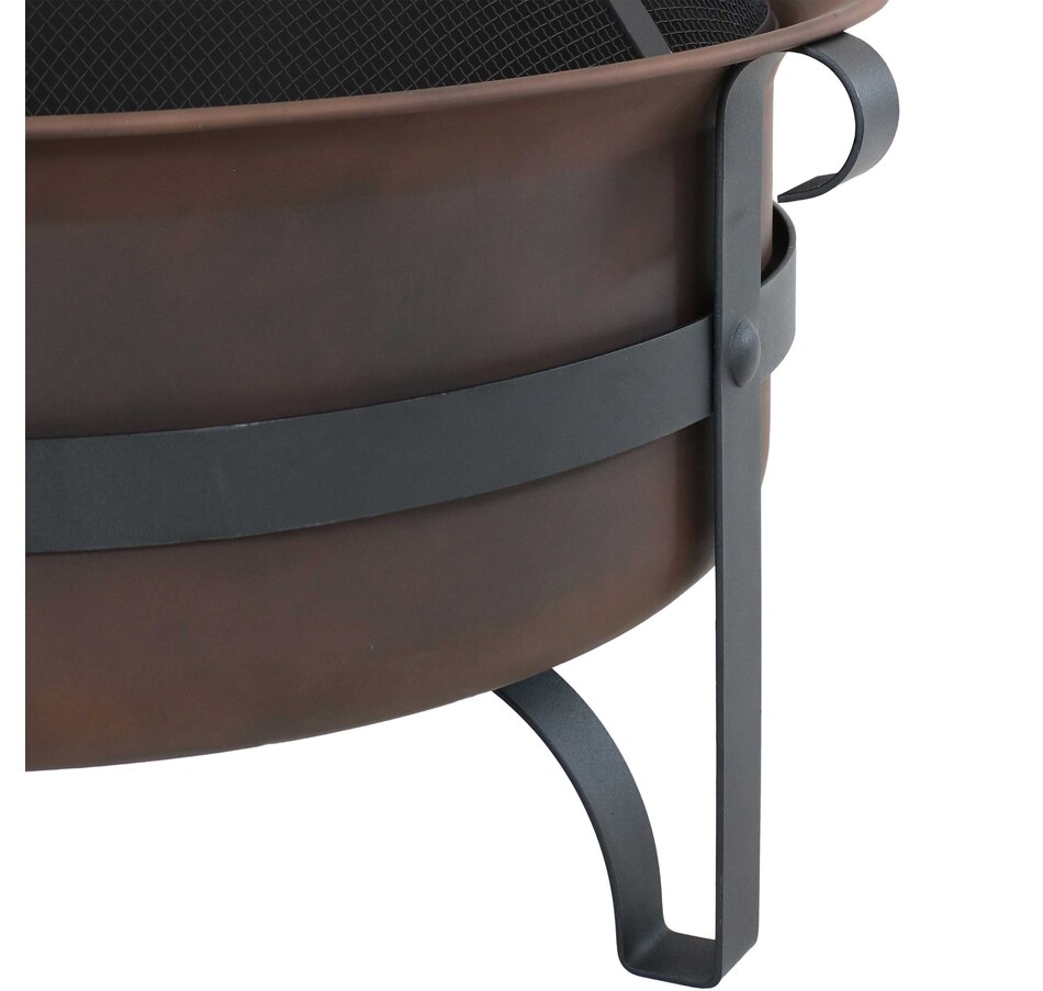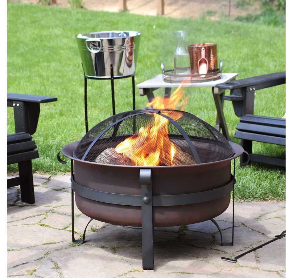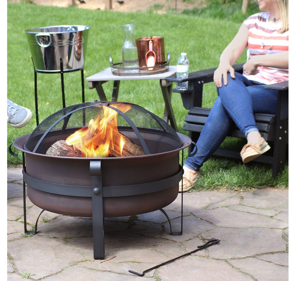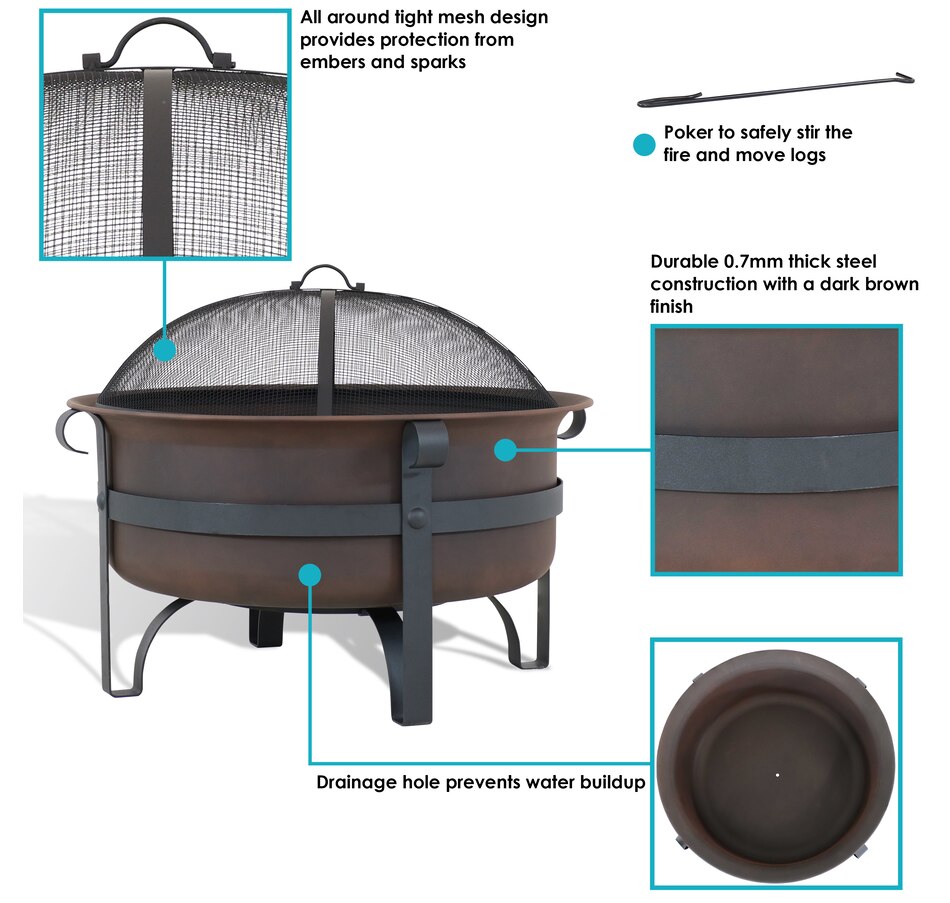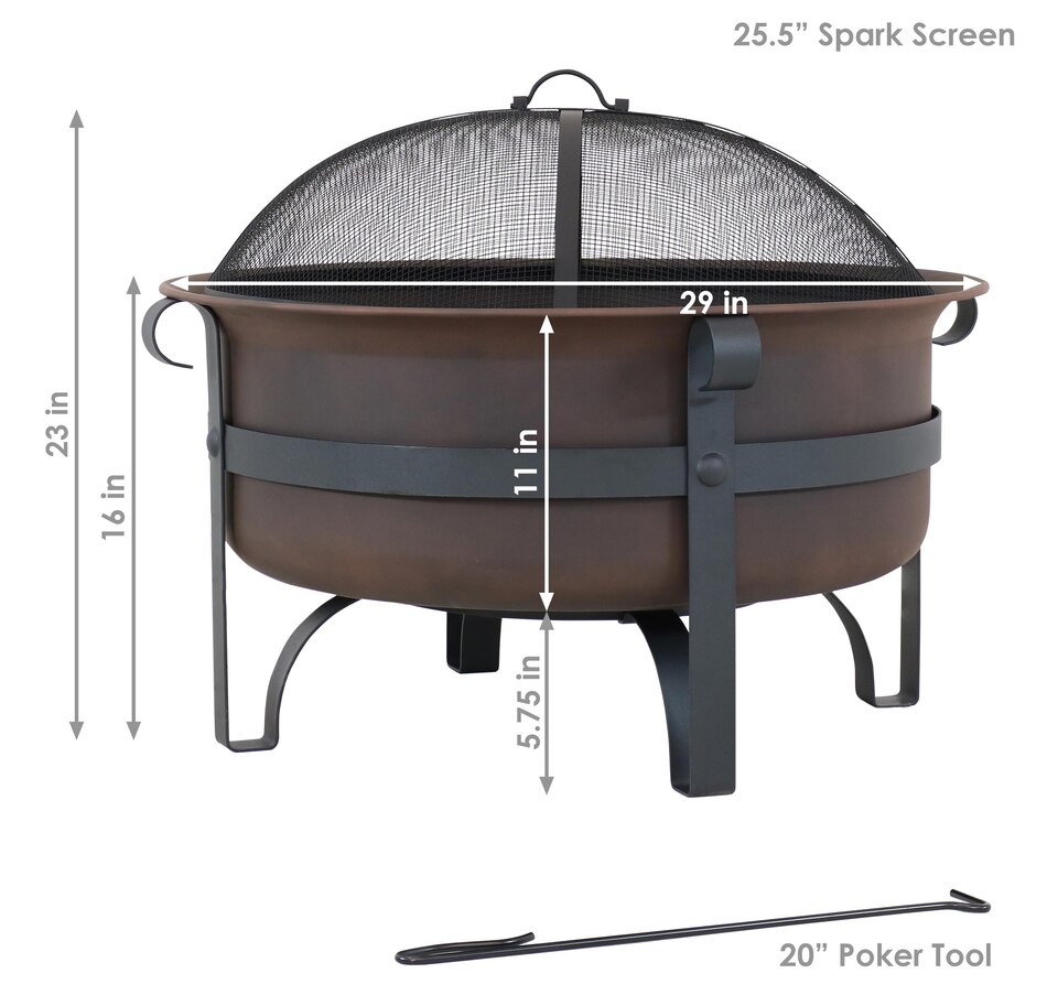 Add instant charm and warmth to any outdoor space with this wood-burning firepit for outside with an included spark screen. This outdoor fireplace features a steel construction with high-temperature paint finish that can withstand the heat of the fire and even harsh weather conditions for long-lasting use. The unique cauldron-shaped design is sure to add a unique accent to any yard, patio, fire pit area, or campsite while you enjoy long, cool evenings with friends and family. Each outdoor firepit comes with a poker and spark screen to easily maneuver the logs to keep the fire going or keep the embers safely contained in the fire area. Simply add some firewood and it's ready to light up the night. Grab some friends and some marshmallows and create cozy memories with this beautiful, fun, and classy large round fire pit for outside wood burning!