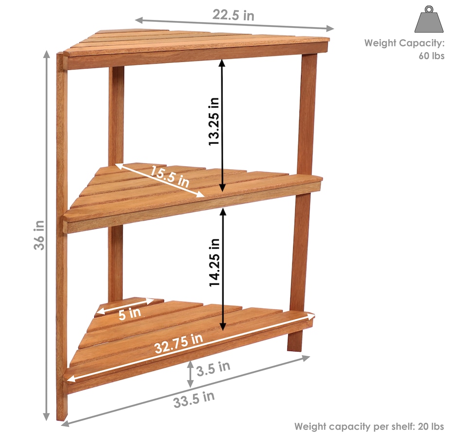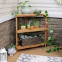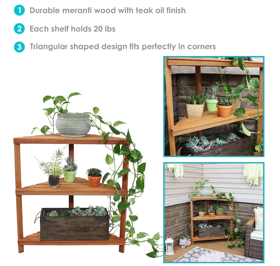 Display potted plants with pride on this meranti wooden, multi-tiered plant stand. Durably constructed of solid meranti wood, this versatile tiered plant stand features an attractive teak oil finish and can be used indoors or outdoors. The finish adds extra durability against the outdoor elements. Don't have room for a traditional garden in the backyard? This stylish plant stand works well for container gardening whether for delicious small vegetables or vibrant flowers. If the home has a boho chic look or traditional farmhouse charm, this versatile wooden plant stand is sure to fit in with the decor with its natural elegance. Plus, it is easy to assemble the plant stand as all the necessary tools and hardware needed to put it together are included in the box. Enjoy beautiful blossoms, greens, and herbs on the outdoor patio, deck, front porch, poolside, or other outdoor space.