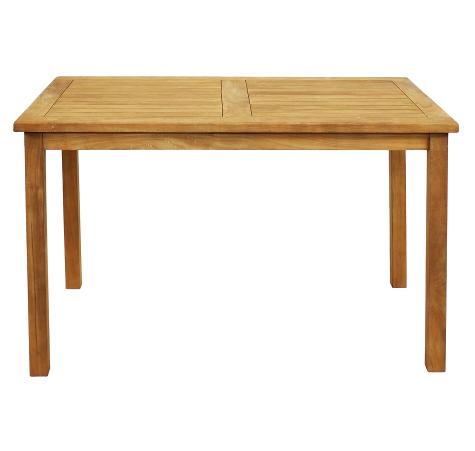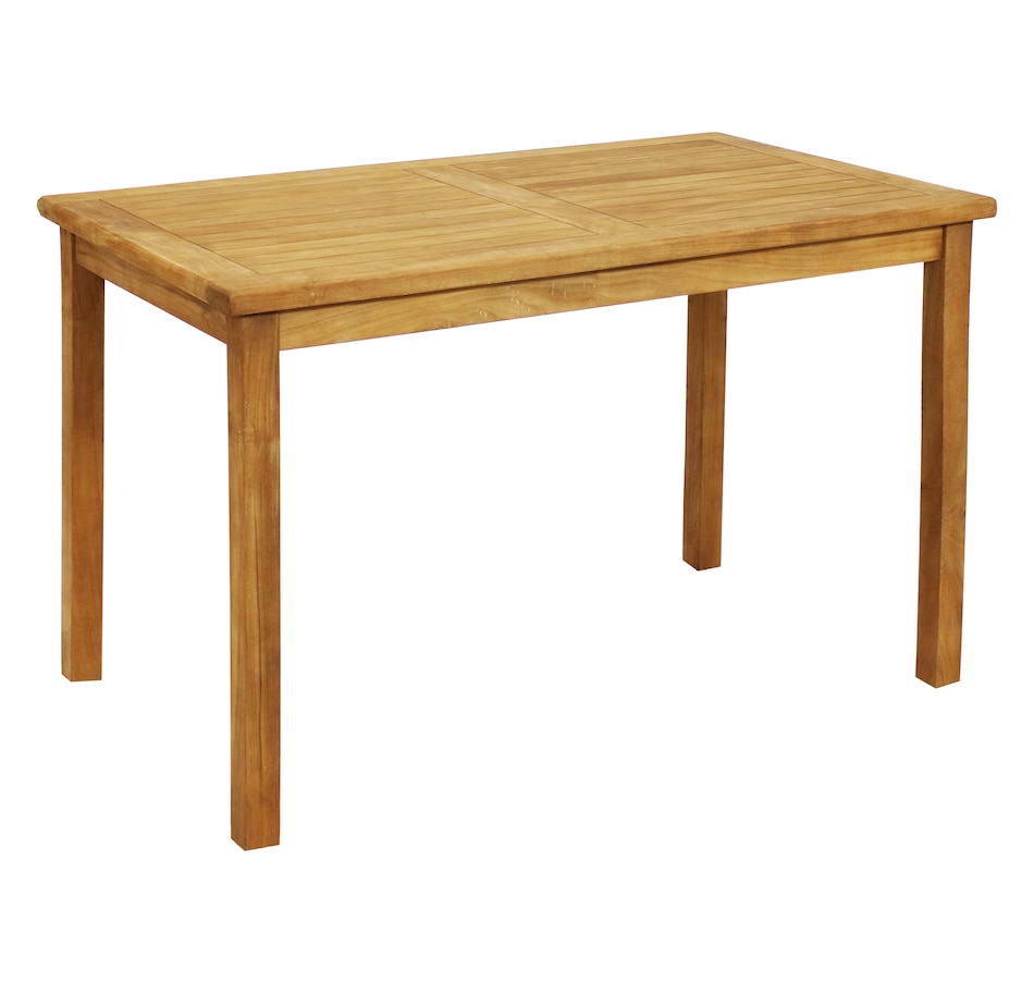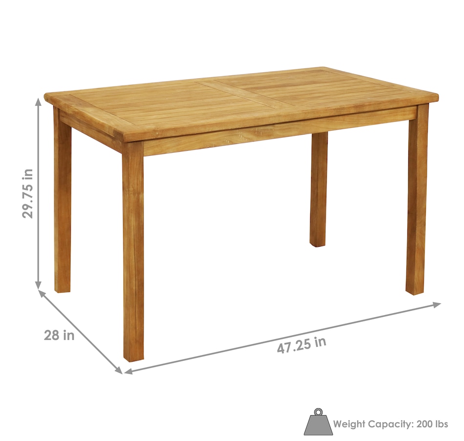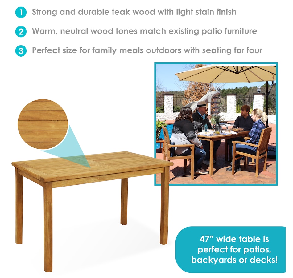 Enjoy every meal outdoors or indoors with this conversation, teak wood, rectangular dining table featuring a light wood stain finish. Invite friends, family, and neighbors over for a bit of fresh air, good food, and great company. This dining table is sure to provide style and function for your space and will quickly become the go-to dining table for relaxing nights. This table features a premium, weather-resistant teak construction with a light wood finish for long-lasting strength and beauty. During storms and high-moisture conditions, be sure to cover or bring this set indoors to ensure long-lasting use. The teak wood design also creates a natural and elegant feature to any space and is sure to complement any existing decor wherever desired. This piece is sure to add a classic, natural, and functional feature to any location. Grab candles, centerpieces, florals and potted plants, and any other decor to set on this countertop and enjoy your outdoor space with ease.