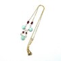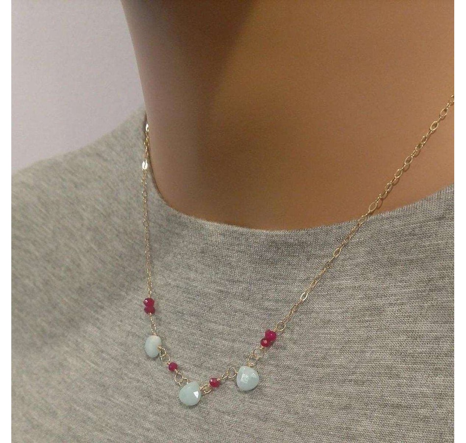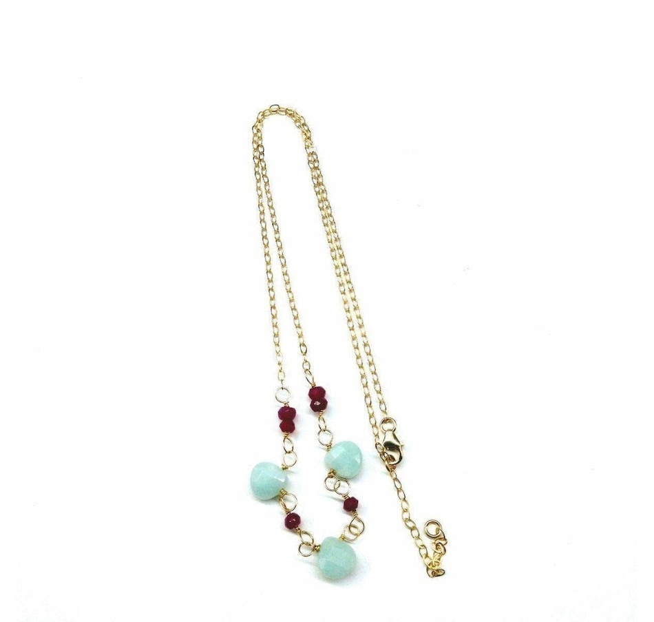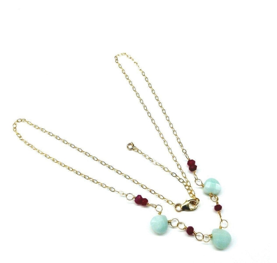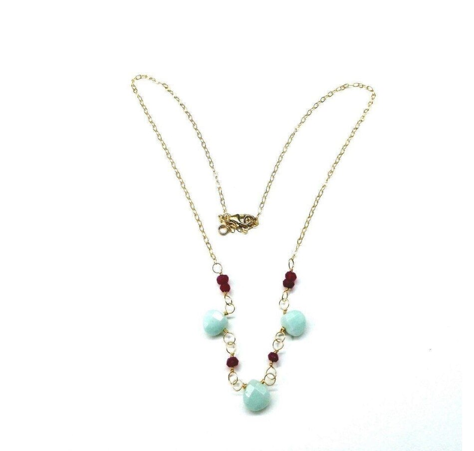 Rediscover your essence with this delicate handmade stunning hot pink Chalcedony and mint Amazonite gemstone necklace. Crafted with care, this jewelry display features individual wire wrapped 14-carat gold-filled sections with alternating fuchsia Chalcedony roundels and minty Amazonite drops on a golden chain with a lobster clasp.14 kt gold fill sparkly cable chain 14 kt gold-filled individual linksSeafoam Green Amazonite pear drops 8x10 mmFuchsia faceted 4mm chalcedony roundels Looks great on any skin toneAdjustable necklace 18-20 inchesHandmade in Montana USA