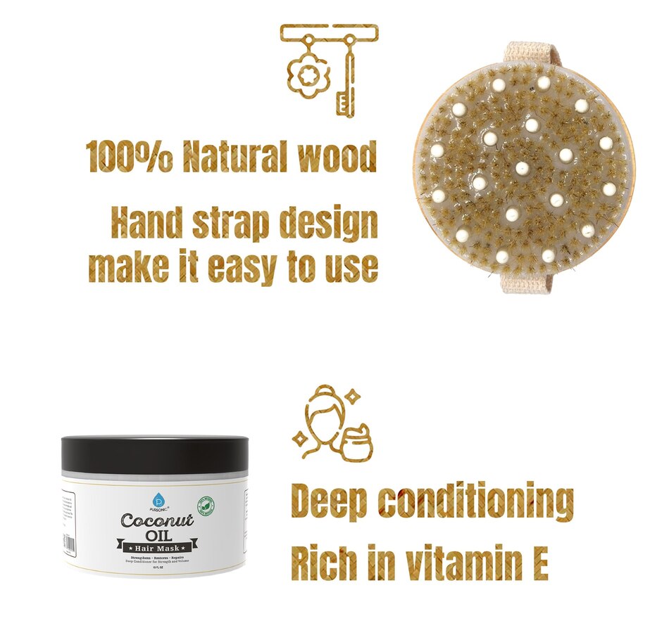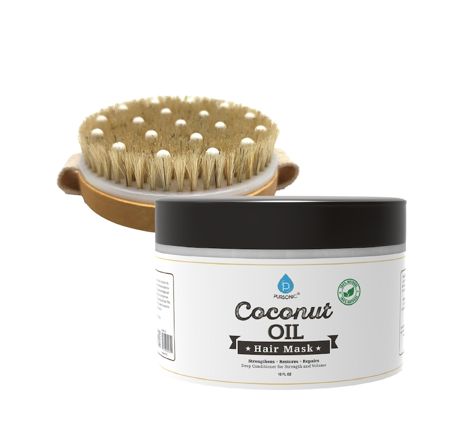 Revitalize your hair and soothe your muscles with the Pursonic Hair Care and Massage Bundle. This thoughtful combination includes the Pursonic Coconut Oil Hair Mask and a Bath Brush with a Rubber Massager featuring a Lotus wooden handle.Pursonic Coconut Oil Hair Mask (10 Oz):Show Your Hair You Care: Indulge in the luxurious care of the Pursonic Coconut Oil Hair Mask, designed to bring back natural texture, moisture, and luster to your hair.Super-Moisturizing Treatment: Paraben-free and sulfate-free, this deep conditioning mask quickly transforms damaged, dehydrated hair into soft, smooth, and glossy locks.Strengthens: Ultra-hydrating properties put a stop to strand breakage and split ends, making hair easier to detangle, comb, and manage.Restores: Infuses life into run-down hair by boosting volume and increasing overall brilliance.Repair: Results in healthy-looking, lively hair that glows and shines, creating a sleek, silky, and vibrant mane.Rich in Vitamin E and Fatty Acids: Suitable for all hair types, providing essential nourishment.Paraben-Free, Sulfate-Free: A natural and caring solution for your hair.Bath Brush and Rubber Massager:100% Natural Wood: Crafted from natural wood, this bath brush with a rubber massager is perfect for relieving tense or fatigued muscles.Cellulite Reduction: Regular use of the cellulite massage tool can naturally reduce cellulite, stimulating and invigorating your body.Hand-Sized Massager: Features rounded nodules for a gentle way to soothe tired muscles.Hand Strap Design: Easy to use, with a hand strap design ensuring a comfortable and enjoyable massage process.Lightweight & Easy to Carry: Take this compact massager with you anywhere for on-the-go relaxation.Transform your self-care routine with the dual benefits of hair rejuvenation and muscle relaxation. Embrace the natural care of the Pursonic Hair Care and Massage Bundle today!
