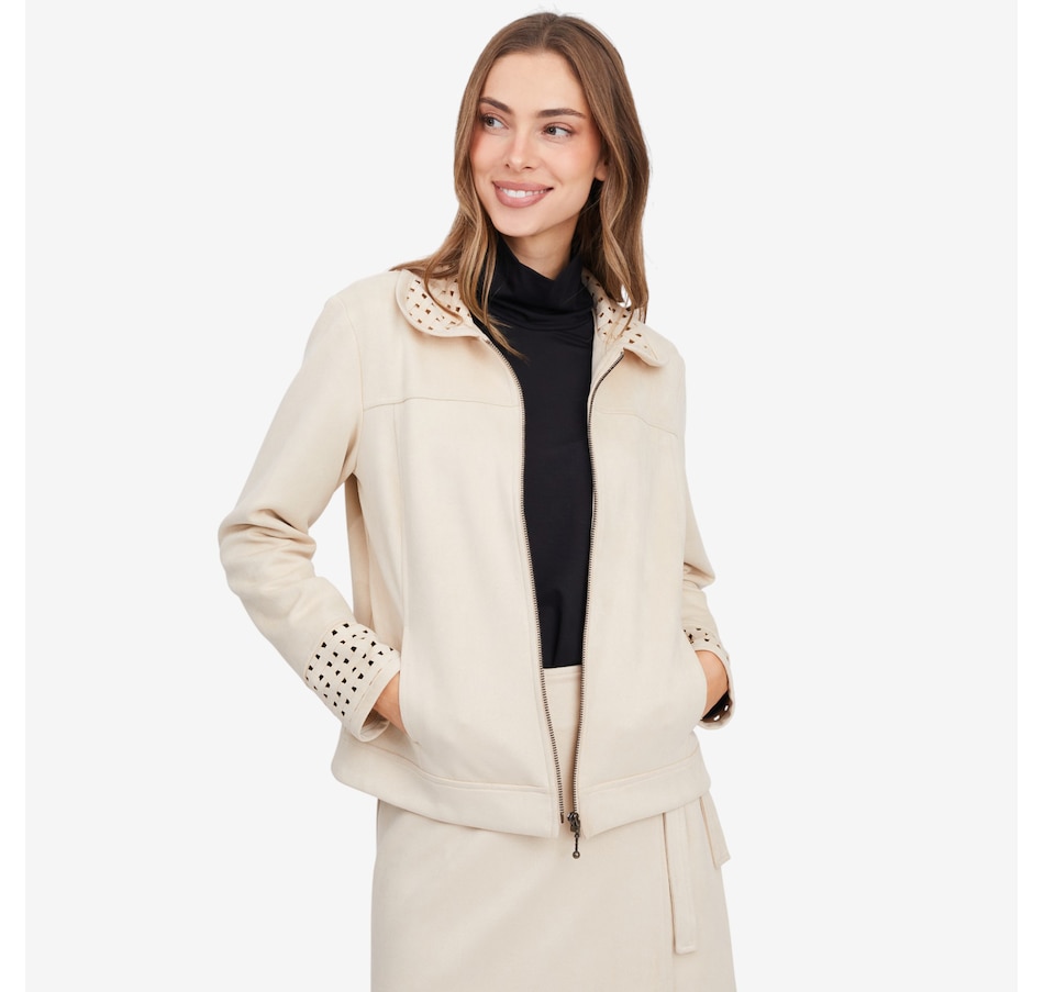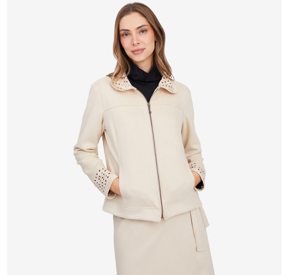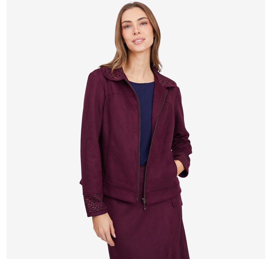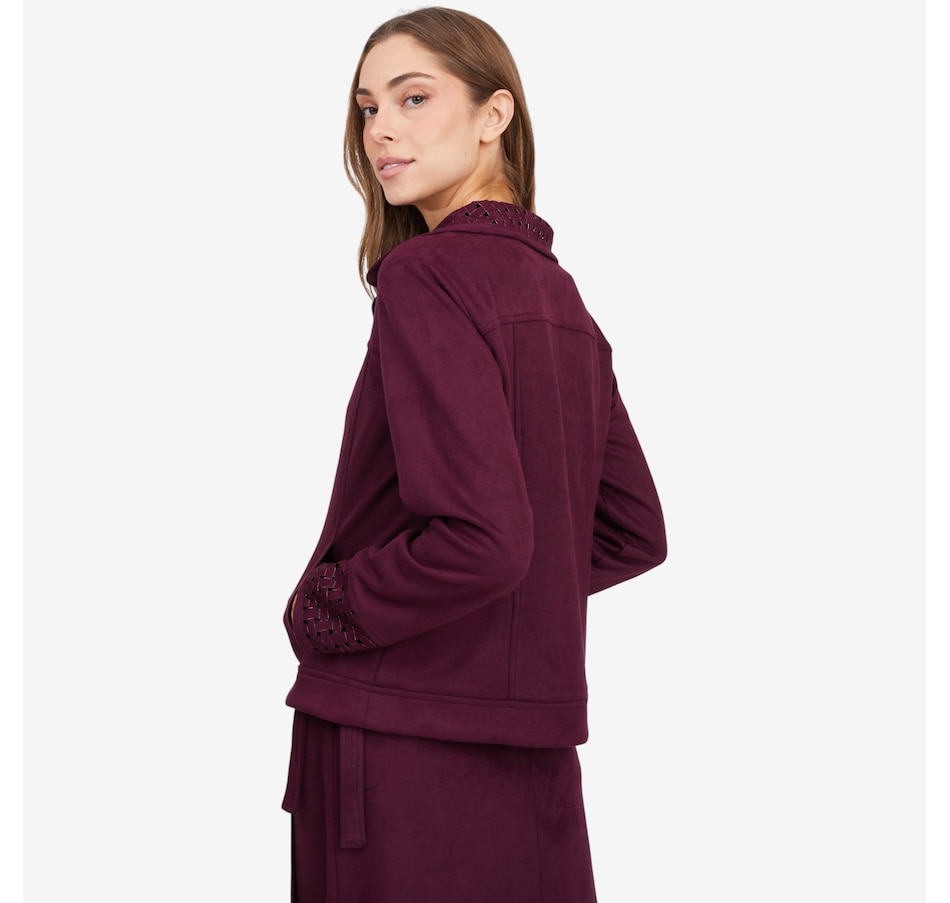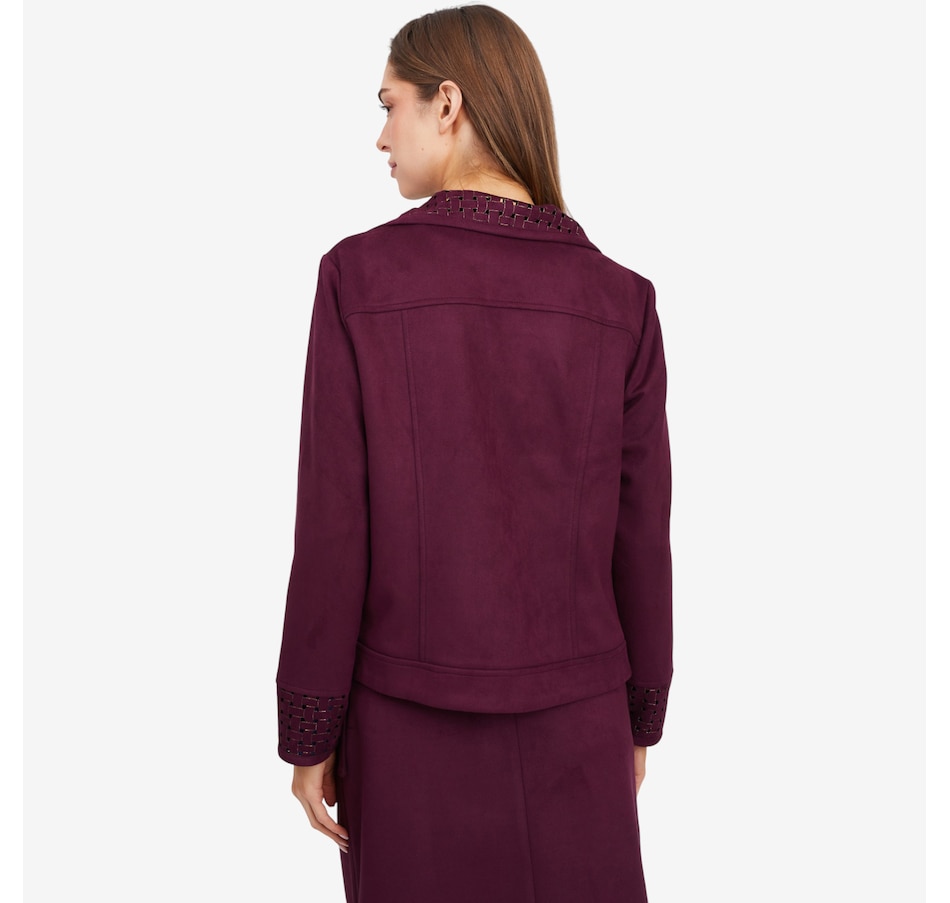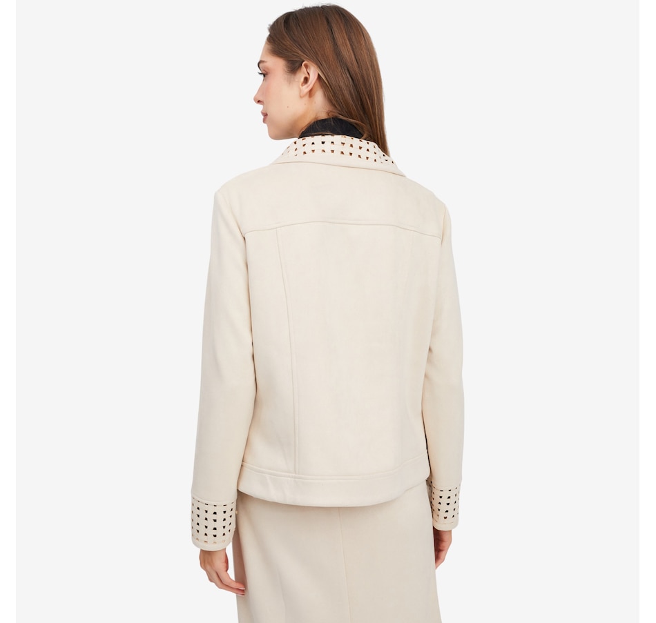 This fabulous faux suede jacket from Mr. Max is designed with an eye-catching lattice cut-out detail on the cuff and collar.