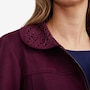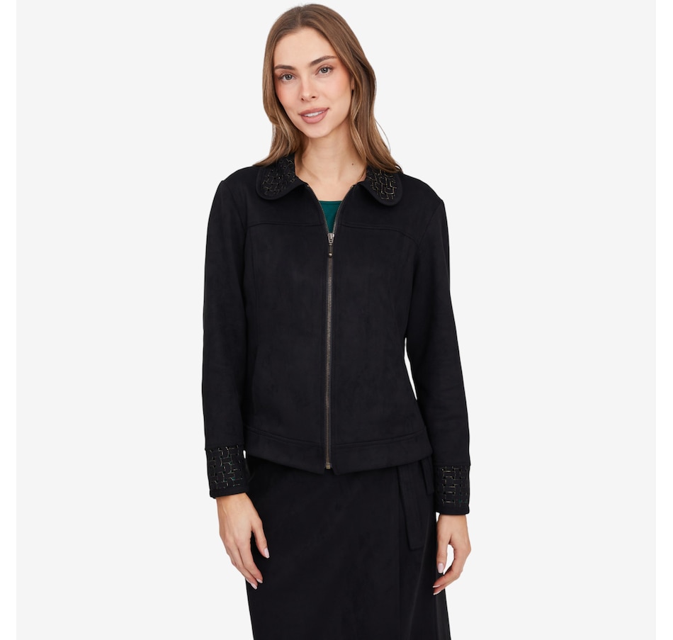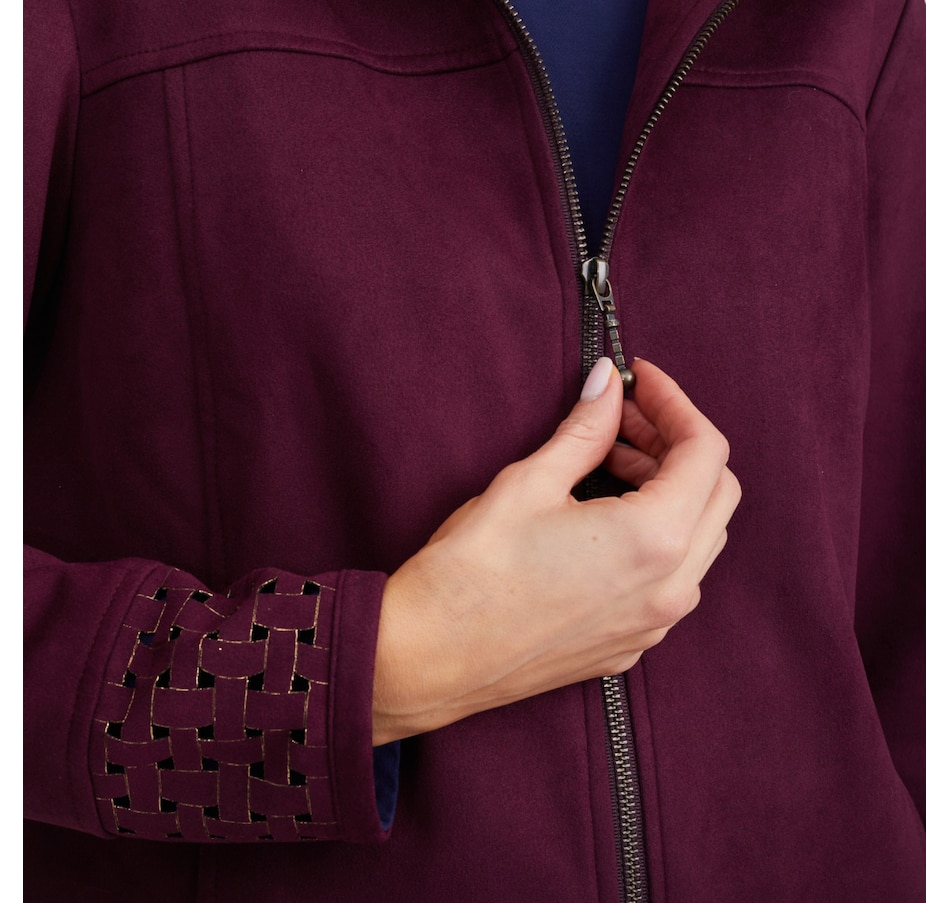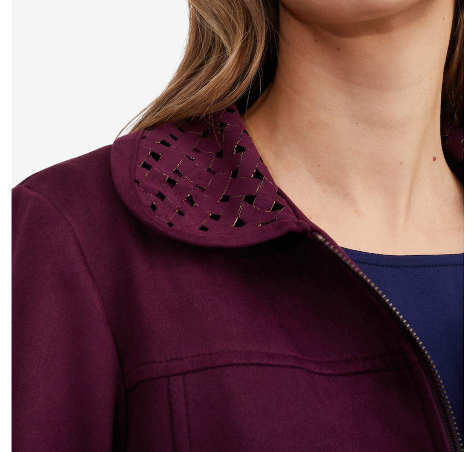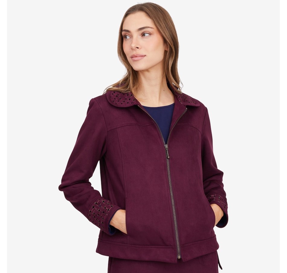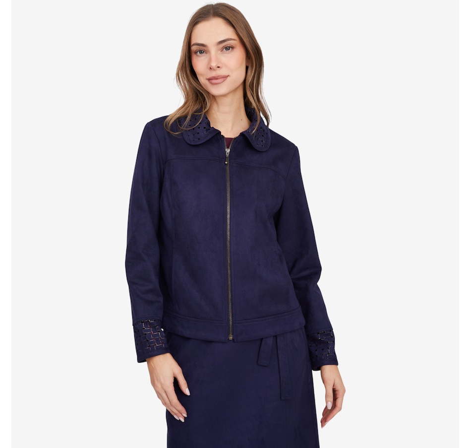This fabulous faux suede jacket from Mr. Max is designed with an eye-catching lattice cut-out detail on the cuff and collar.