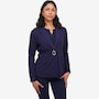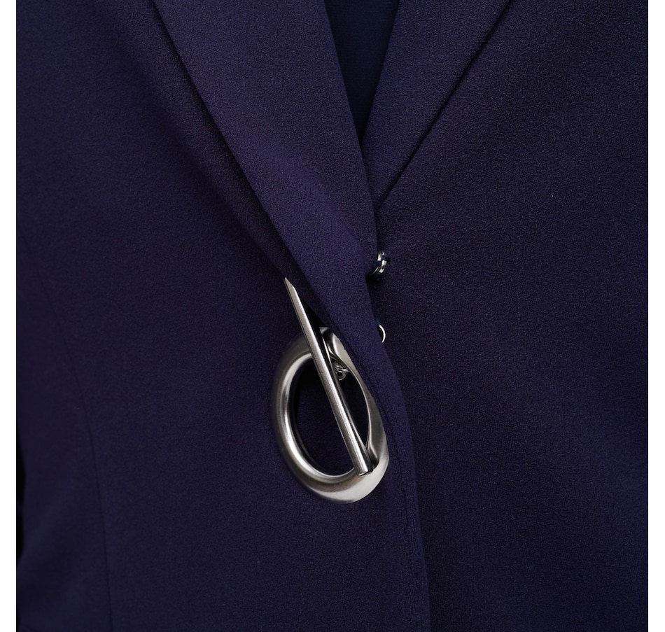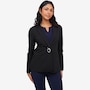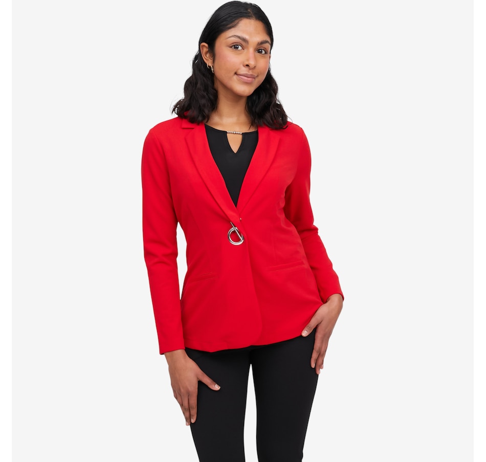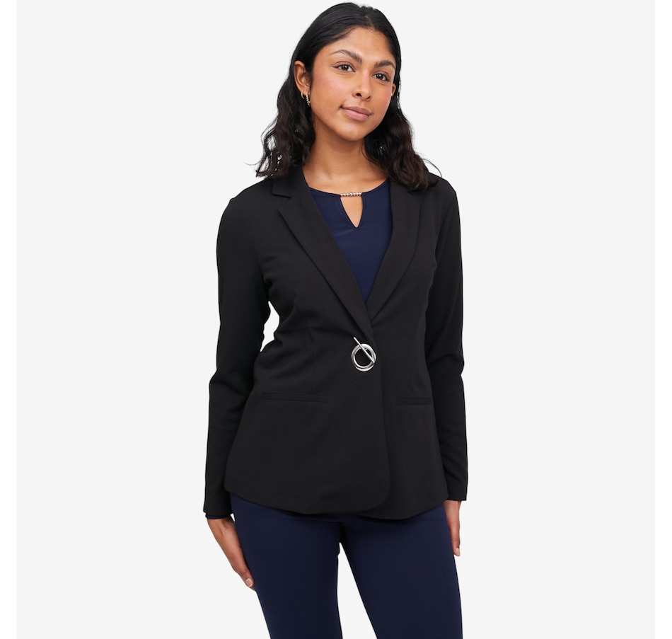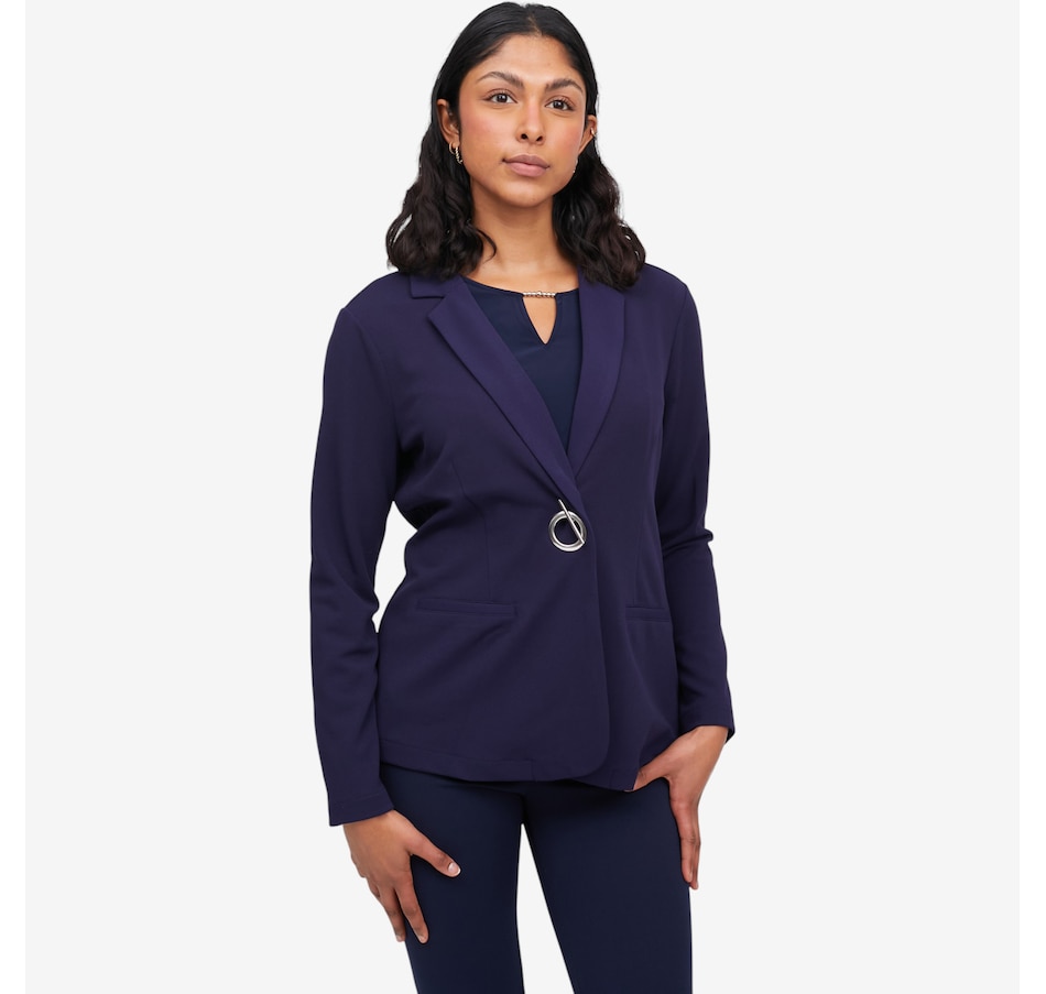 Command attention with polished confidence wearing this Nina Leonard blazer. This sophisticated long‑sleeve piece features a classic lapel and a chic front toggle closure that adds a modern twist to traditional tailoring. Designed with a fitted silhouette, it flatters your shape while maintaining a sleek, structured look that's perfect for work, evenings out, or an elevated everyday style. Functional pockets add practicality without compromising elegance, and its availability in a curated selection of versatile, stylish colours makes it easy to pair with your favourite tops and trousers.