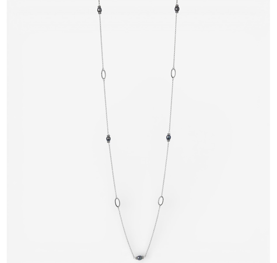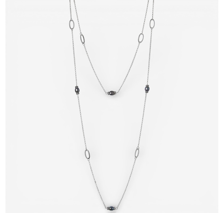 Elevate your look with the effortless elegance of the sterling silver grey pearl necklace, a stunning blend of modern sophistication and timeless shimmer. Eight luminous grey pearls are artfully spaced between eight polished links, each accented with delicate micro‑ball detailing that adds dimension and subtle sparkle. The rhodium‑plated sterling silver enhances durability and shine, ensuring the strand maintains its brilliance wear after wear. Designed without a clasp, this slip‑on style drapes beautifully and offers endless styling versatility — wear it long, doubled, or layered with your favourite pieces.