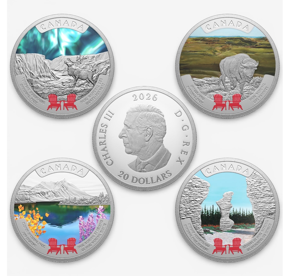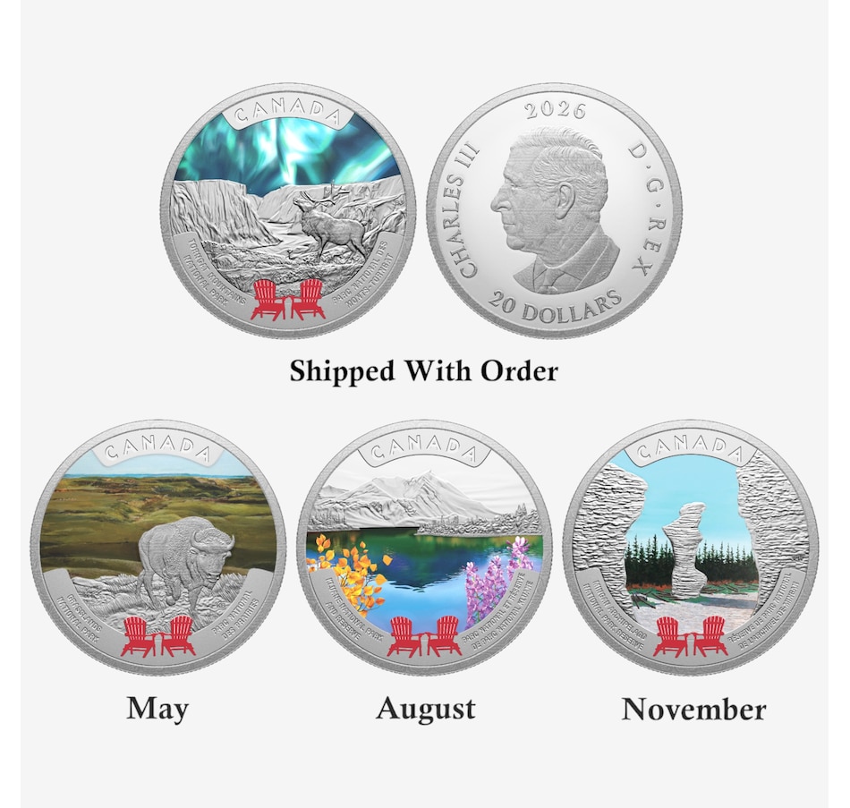 Capture the beauty and grandeur of Canada's National Parks with this engaging four-part subscription coin set. Each $20 one-ounce fine silver coin features a different national park accentuated with vibrant selective colour. With this subscription, you will receive all four coins in the series as they are released, starting with the Torngat Mountains National Park which will be shipped when your order is placed. Additional coins will be shipped and billed in May, August and November 2026. With this subscription, you will be guaranteed to automatically receive the additional three coins in the series at the same price per coin, even if the single coin issue price increases with rising silver market prices. Â