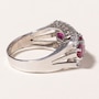 A central, slightly raised, row of four oval rubies radiates between two rows of nine bright-white and sparkling prong-set round, brilliant-cut diamonds. The beautiful high polished white gold band splits into three bars that fan to cap each row in this strikingly stunning fire and ice combination.