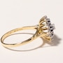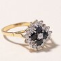 This circa-1970s cluster ring features four round sapphires positioned at the north/south/east and west positions around a centre round, brilliant-cut diamond. Sixteen additional prong-set diamonds create a rhombus shape as they surround the perimeter, creating a dazzling cluster. Stamps inside the ring indicate that it was hallmarked in 1974, composed of 18-karat gold, and was assayed in London, England. The head containing the stones is crafted in white gold, while the outside prongs forming the undergallery and narrow, tapered band are crafted in yellow gold.