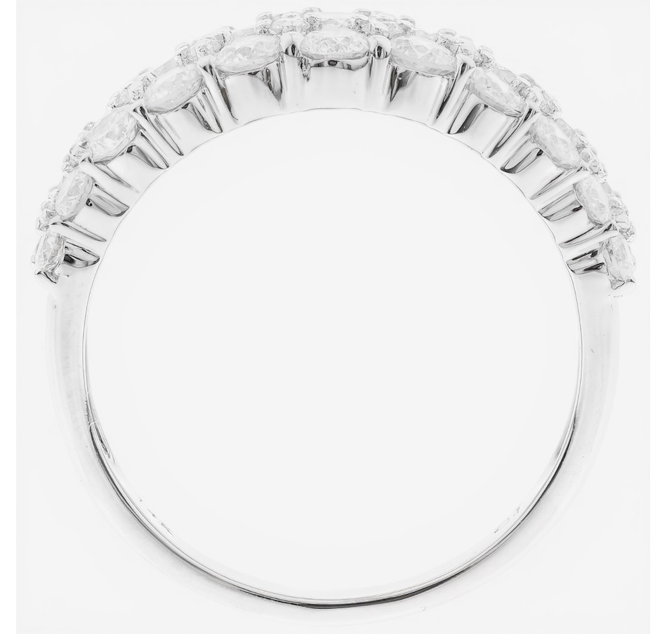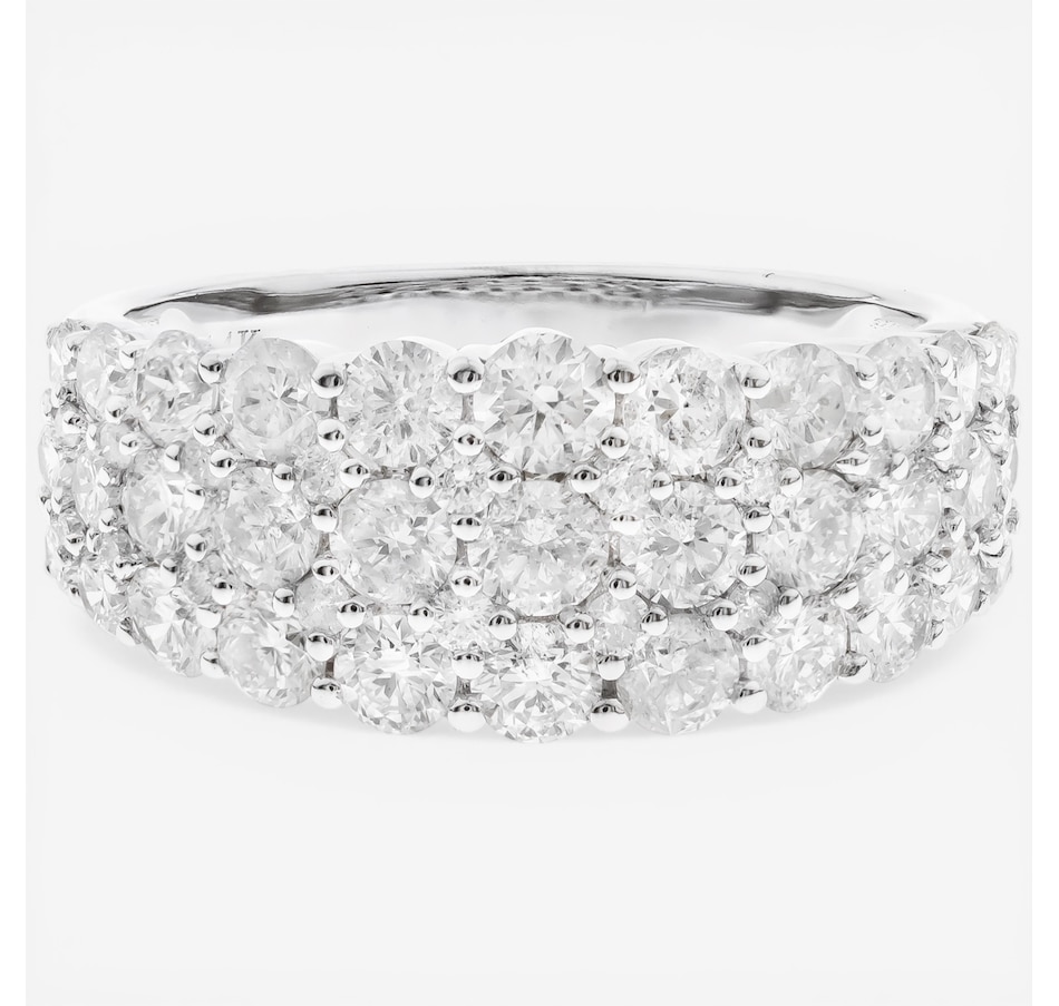 This radiant three‑row ring sparkles with an impressive sweep of faceted diamonds that catch the light from every angle. The polished white gold setting enhances the design's brilliance, giving the piece a luxurious, timeless presence. Bold yet elegant, it’s a striking ring that brings refined sophistication to any jewellery collection.