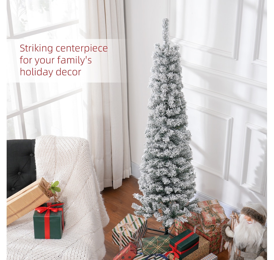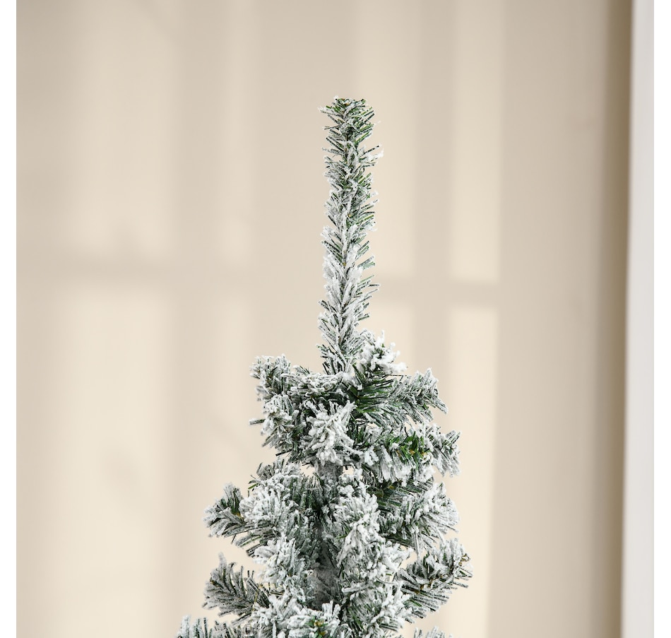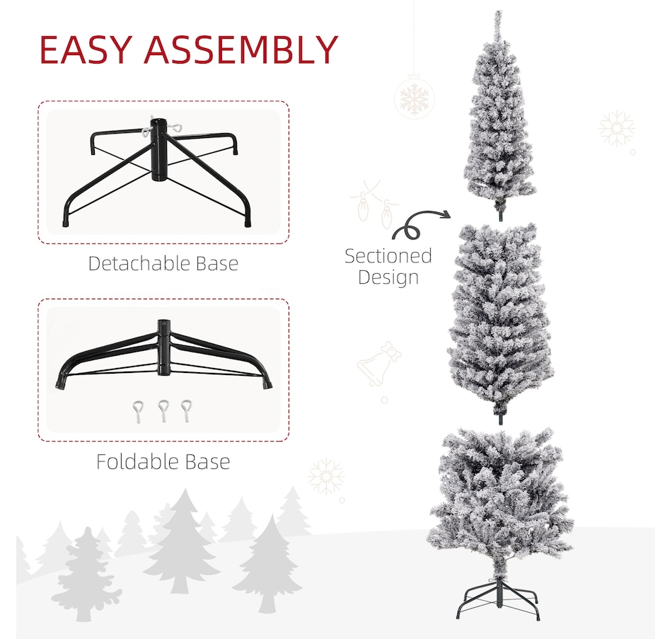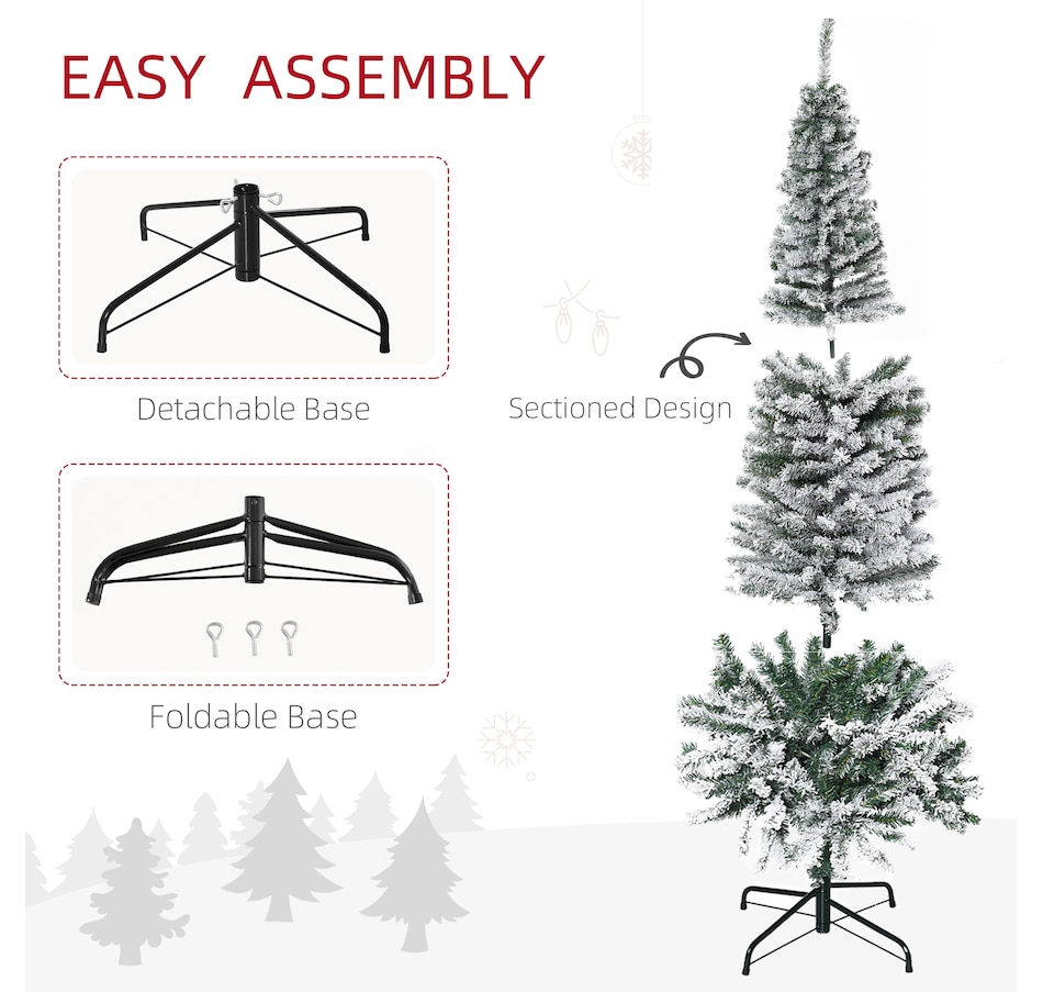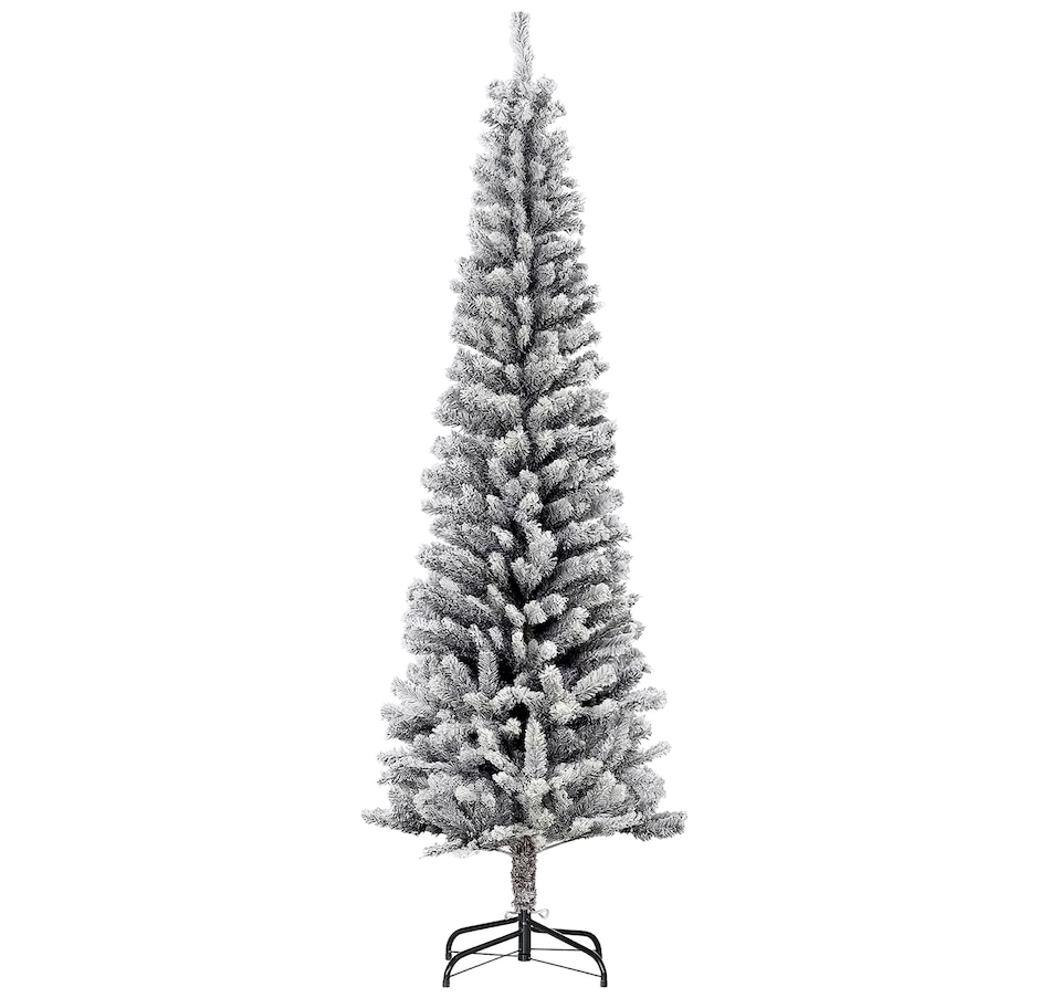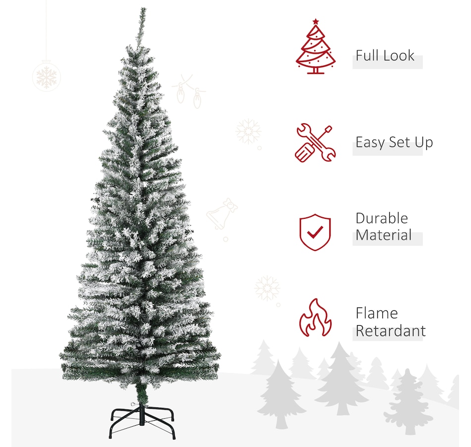 Bring nature home without the mess with this artificial Christmas tree from HOMCOM. Our beautiful holiday tree provides a great alternative to conventional trees with easy set up and little mess or maintenance required. Designed in a full pine tree shape, this artificial flocked Christmas tree consists of full-bodied and realistic plastic tips. This slim Christmas tree is sure to be a striking centerpiece for your family's holiday décor this year and in years to come.Features: