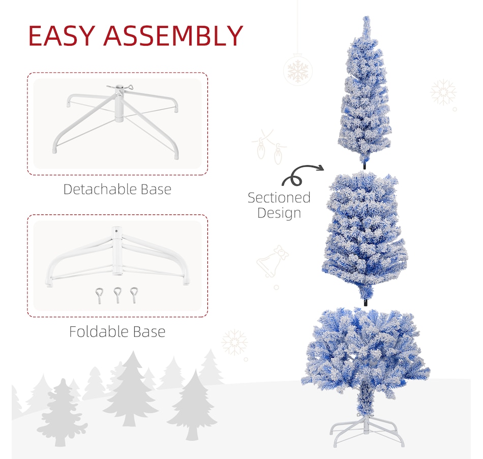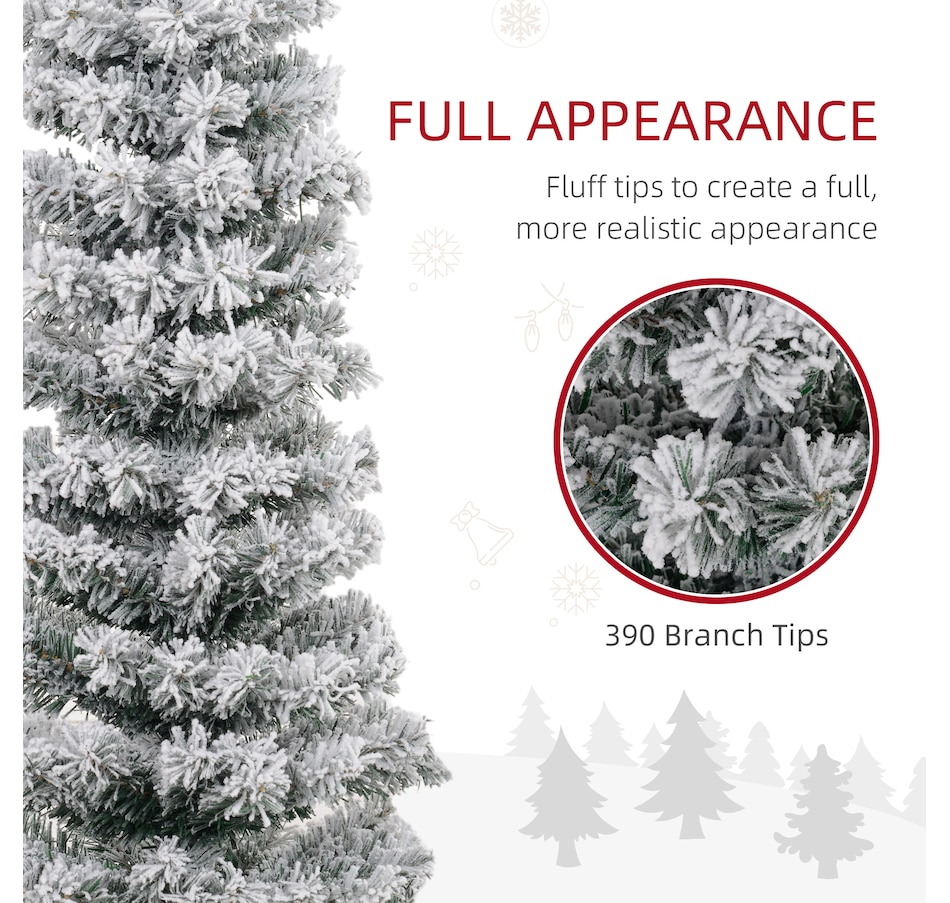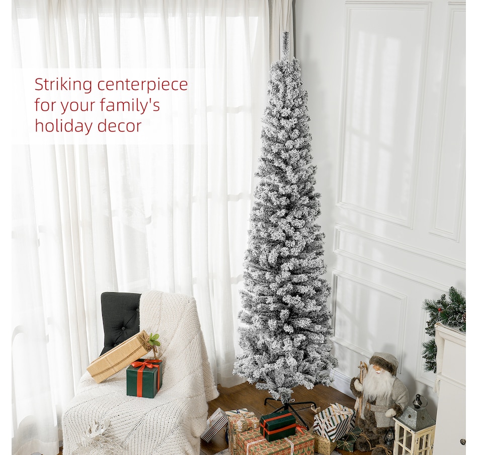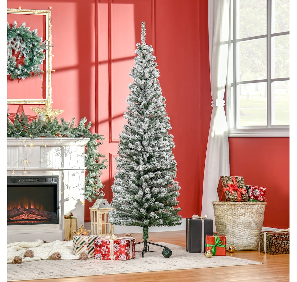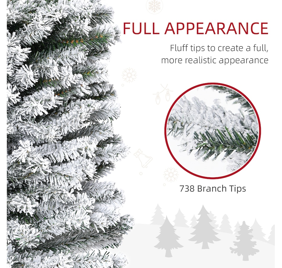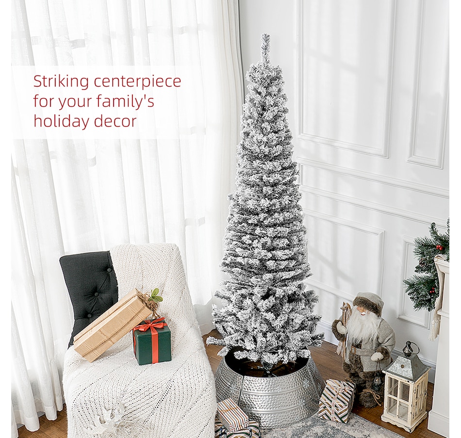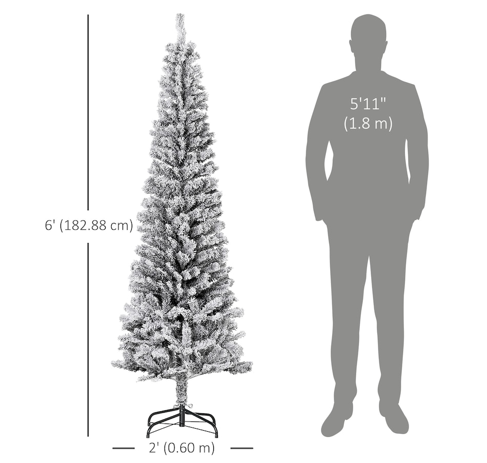Bring nature home without the mess with this artificial Christmas tree from HOMCOM. Our beautiful holiday tree provides a great alternative to conventional trees with easy set up and little mess or maintenance required. Designed in a full pine tree shape, this artificial flocked Christmas tree consists of full-bodied and realistic plastic tips. This slim Christmas tree is sure to be a striking centerpiece for your family's holiday décor this year and in years to come.Features: