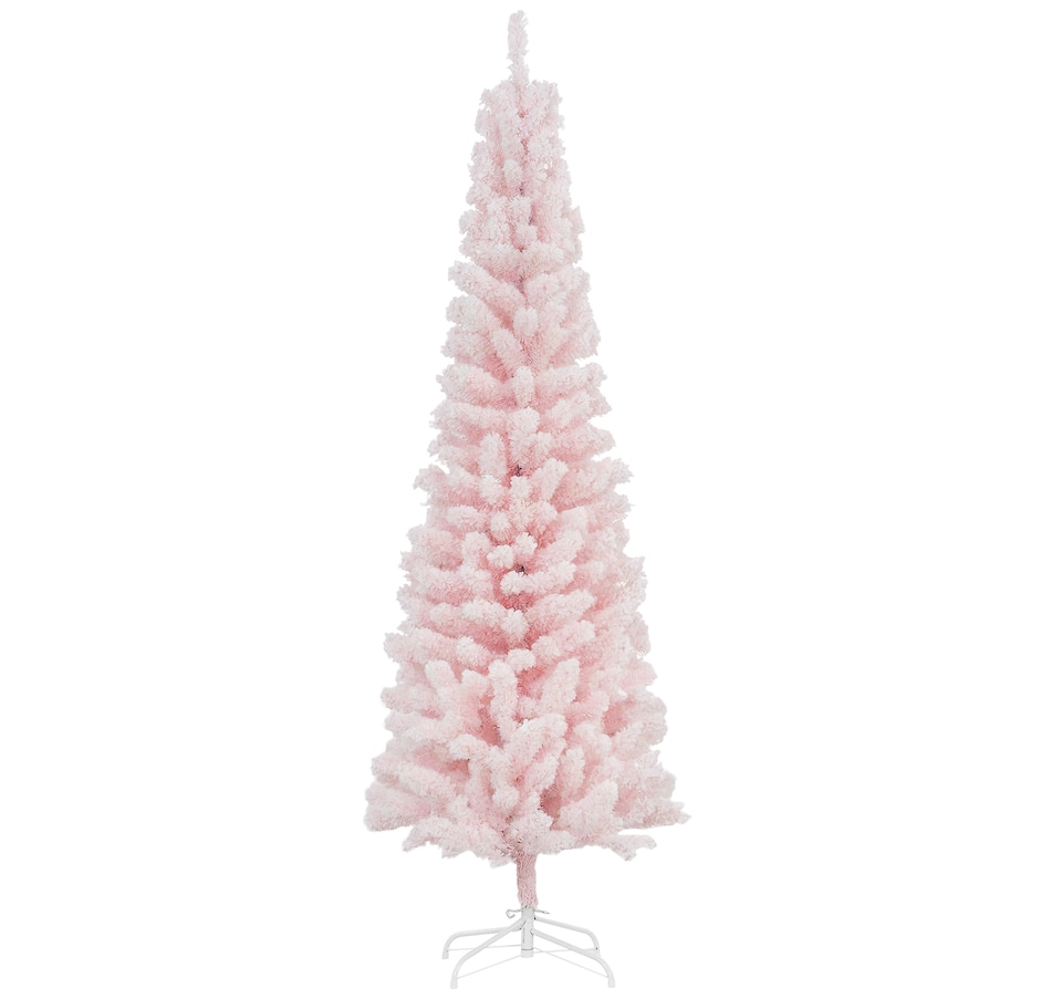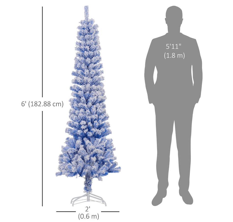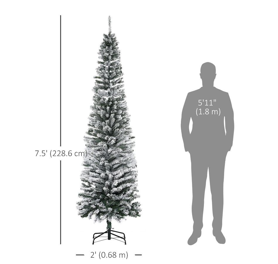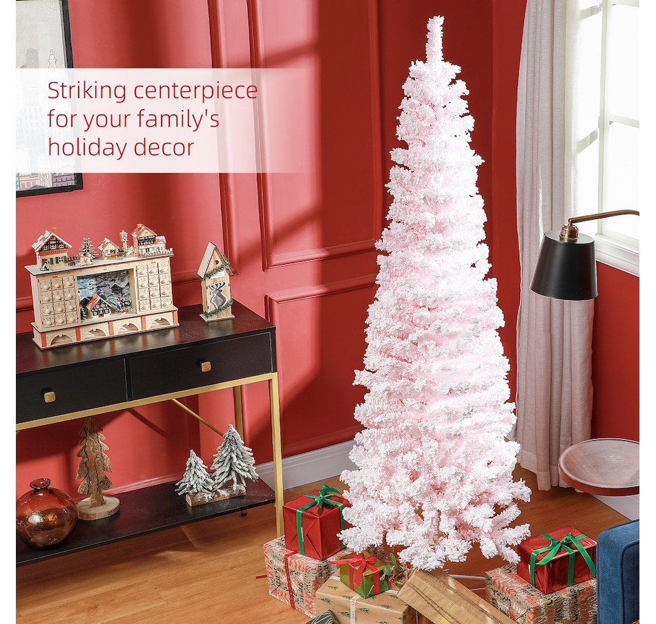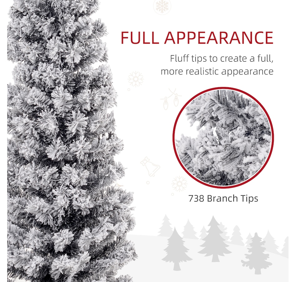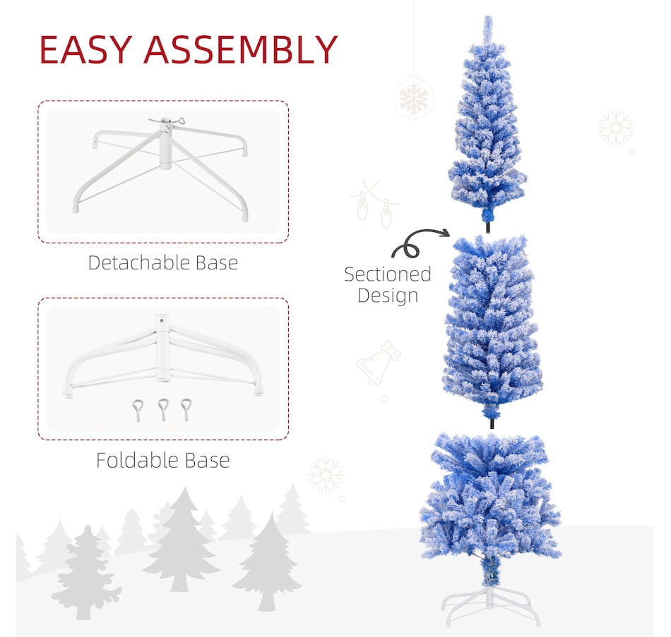 Bring nature home without the mess with this artificial Christmas tree from HOMCOM. Our beautiful holiday tree provides a great alternative to conventional trees with easy set up and little mess or maintenance required. Designed in a full pine tree shape, this artificial flocked Christmas tree consists of full-bodied and realistic plastic tips. This slim Christmas tree is sure to be a striking centerpiece for your family's holiday décor this year and in years to come.Features: