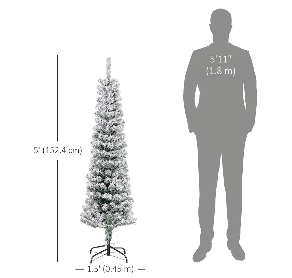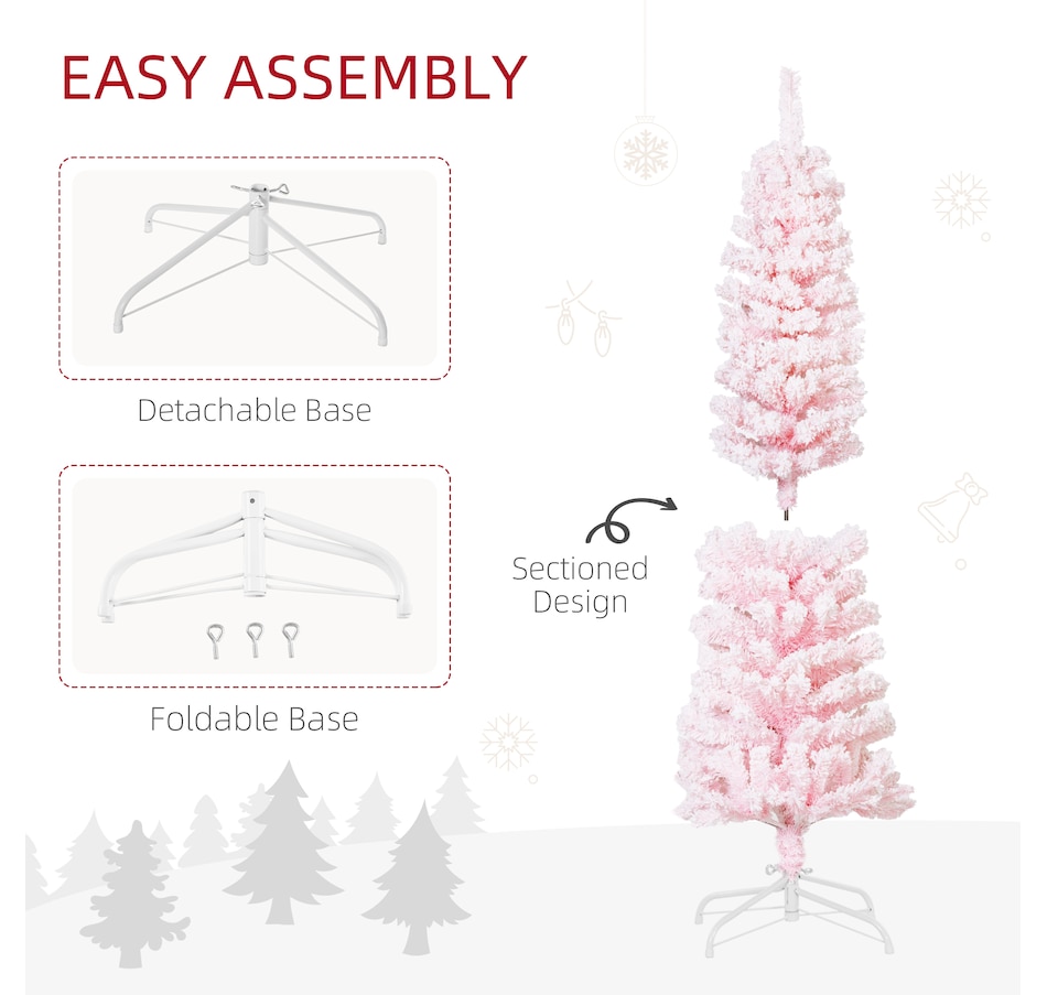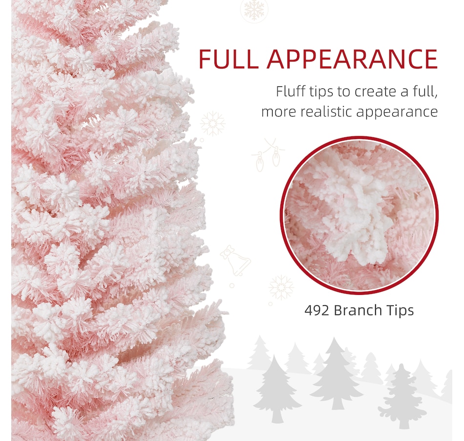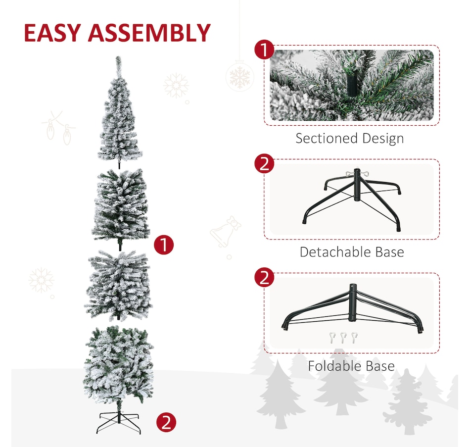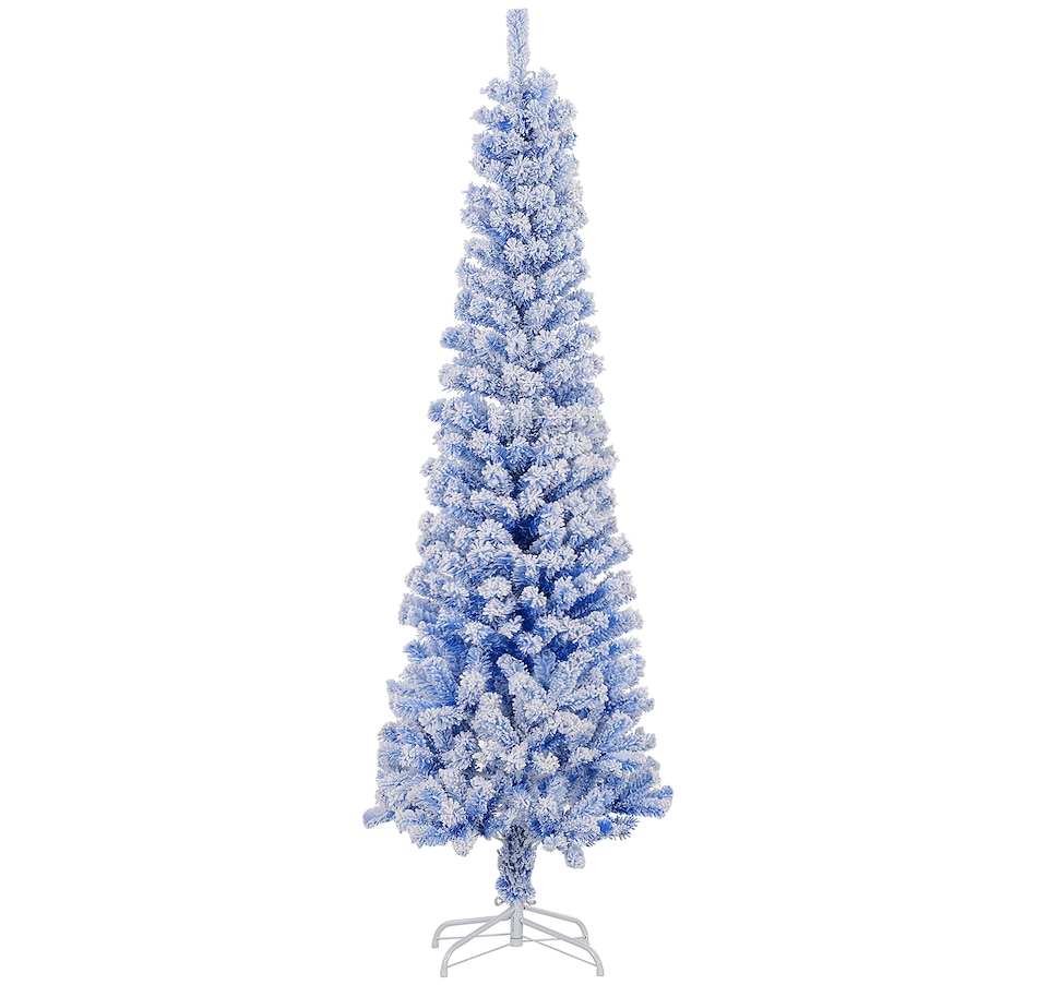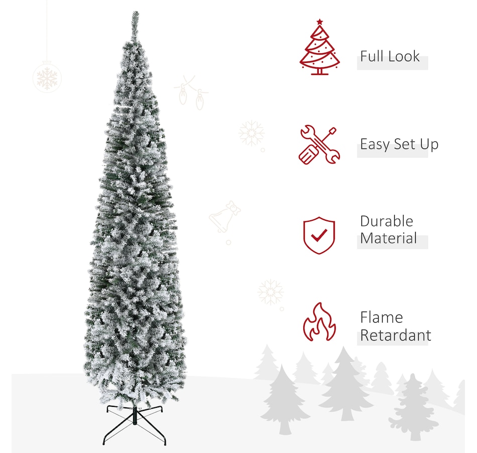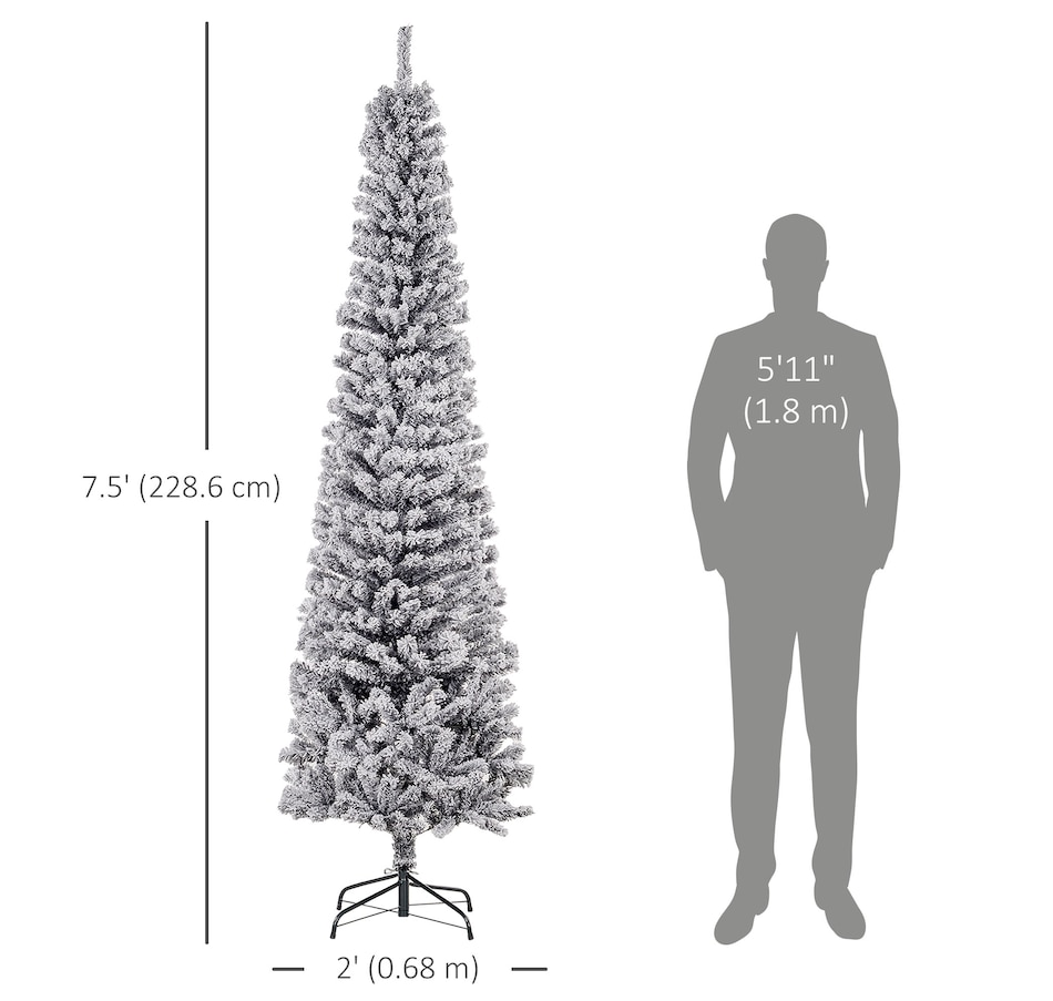 Bring nature home without the mess with this artificial Christmas tree from HOMCOM. Our beautiful holiday tree provides a great alternative to conventional trees with easy set up and little mess or maintenance required. Designed in a full pine tree shape, this artificial flocked Christmas tree consists of full-bodied and realistic plastic tips. This slim Christmas tree is sure to be a striking centerpiece for your family's holiday décor this year and in years to come.Features: