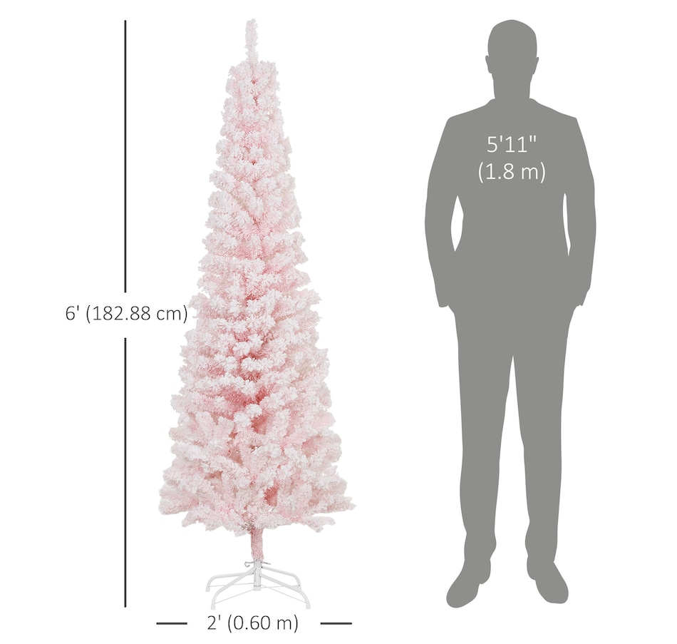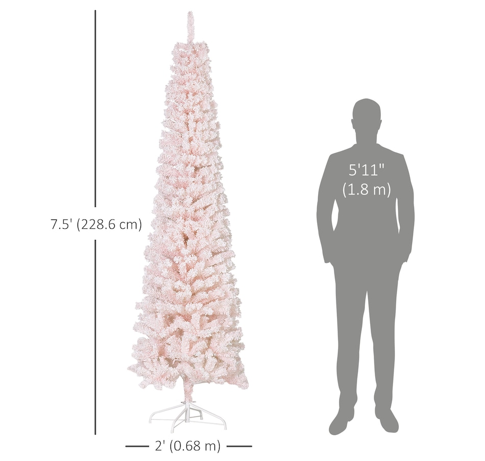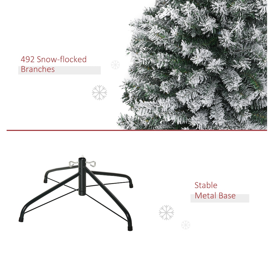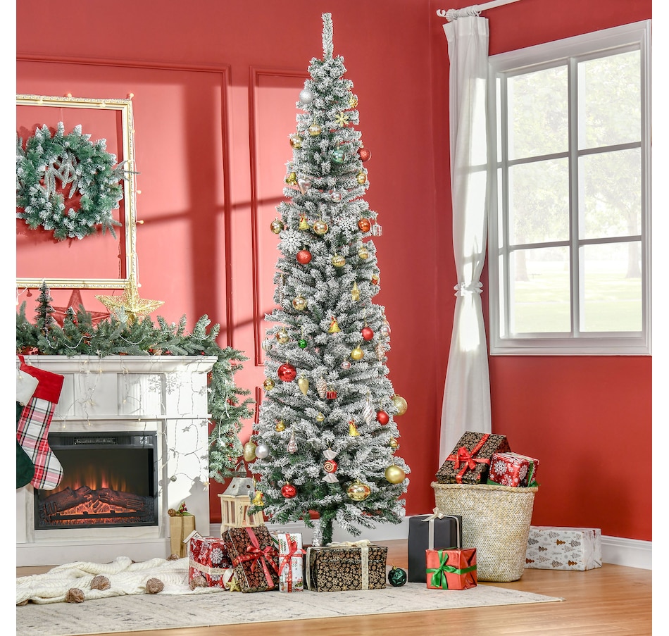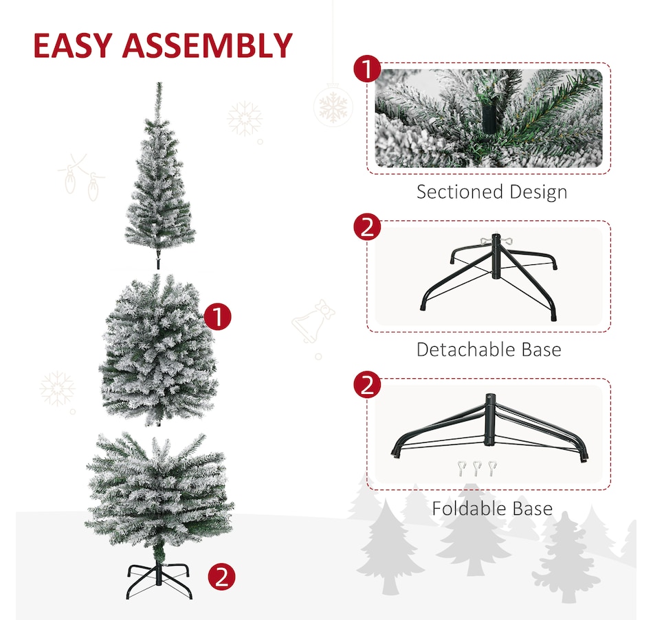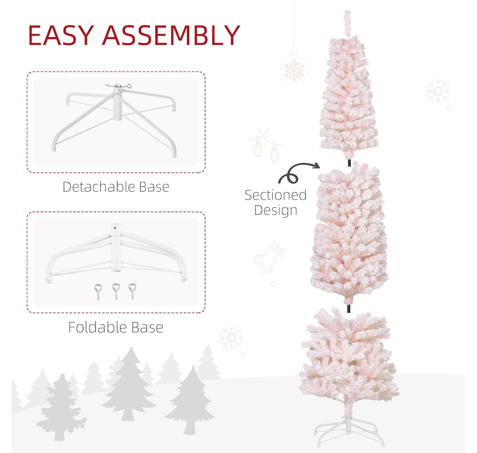 Bring nature home without the mess with this artificial Christmas tree from HOMCOM. Our beautiful holiday tree provides a great alternative to conventional trees with easy set up and little mess or maintenance required. Designed in a full pine tree shape, this artificial flocked Christmas tree consists of full-bodied and realistic plastic tips. This slim Christmas tree is sure to be a striking centerpiece for your family's holiday décor this year and in years to come.Features: