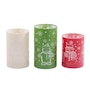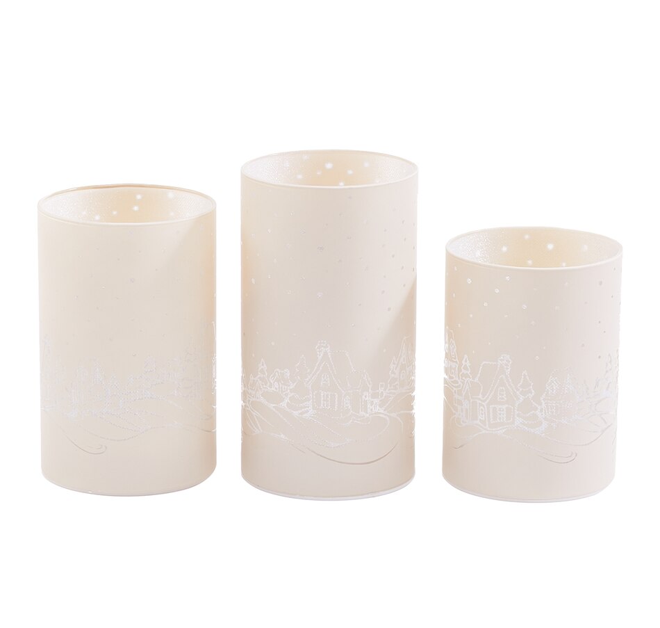 Add the perfect touch of warm ambience to your home with these stunning glass hurricanes from temp-tations. Iconic holiday patterns are beautifully etched into these rich matte glass cylinders, which are accented with soft white built-in LEDs that operate on an automatic six-hour timer. The staggered heights of this glass trio allow you to decorate like a professional, whether you choose to group them together or spread them throughout your home.